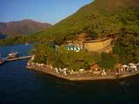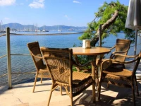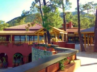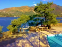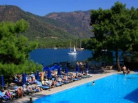Отель расположен в бухте, на склоне горы, в лесу. Красота невероятная, куда ни глянь. Рядом других отелей нет, на противоположном берегу виден Мармарис.