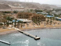 Отель находиться минутах в 30-ти езды от города. До города можно добраться или на такси, или автобусом при отеле, ходящим по расписанию. Вокруг отеля пустырь и местная военно-морская база (мы насчитали 4 крейсерка. Наверно, это весь флот Иордании. На побережье из 25 км большего и не надо). Зато преимущество перед городскими отелями. Рядом с "Мовенпиком" и "Интерконтиненталем" находиться порт с оче