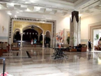Парадный холл отеля, здесь же располагается и ресепшен, просторный, с высоким, на 3 этажа, потолком, но, учитывая, что отель рассчитан на 700 человек, кресел и мес