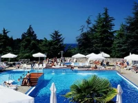 Отель обалденный, очень понравился. В качестве территории отеля - красивый большой сосново-лиственный парк, заборов между соседними отелями нет, минут за 10 пешком можно добрести до здания соседнего отеля. Пляж отеля - просто набережная, берешь лежак и тащишь его куда угодно, набережная/пляж тянется вплоть до города (примерно 2 км). В роли зонтиков на пляже выступают дубы и сосны. От отеля до горо