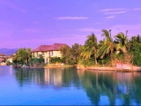 Расположен в 35 км от аэропорта, в 25 км от центра г. Санья. Состоит из главного корпуса и 108 вилл. Депозит для номеров в главном корпусе – 100$, для гостей вилл – 300$. Расположен на 2 линии, пляж через дорогу (рядом с отелем HORIZON), на электрокаре ехать 1 минуту или 5 минут пешком. Территория огромная. Большой бассейн и озеро. Вокруг озера стоят виллы. В номерах в главном корпусе на 3-м этаже