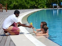 Перелет от Мале 1ч 30 м и еще 10м на катере. В Мале надо ждать часа 3 самолета так как он ходит 3 раза в день по расписанию. Для ожидания вас отвезут в кафе у гидросамолетов, где предложат напитки и если надо бутерброды.