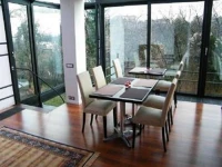 Ресторан как и бар с видами на зеленый сад. В ресторане огромные окна - от пола до потолка, что порой кажется, что он является частью сада.