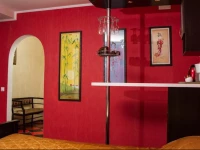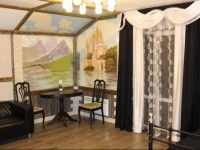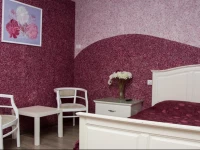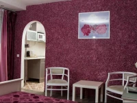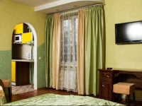 Круглосуточная регистрация. Питание по меню в номер. На этажах кулеры с горячей и холодной водой. В номерах мини-бары и кондиционеры. На территории беседка с мангалом. Номеров в отеле 13: «Стандарт» (2500 руб.), «Люкс» (3500 руб.), «Комфорт» (2500 руб.), «Улучшенный одноместный» (1500 руб.).