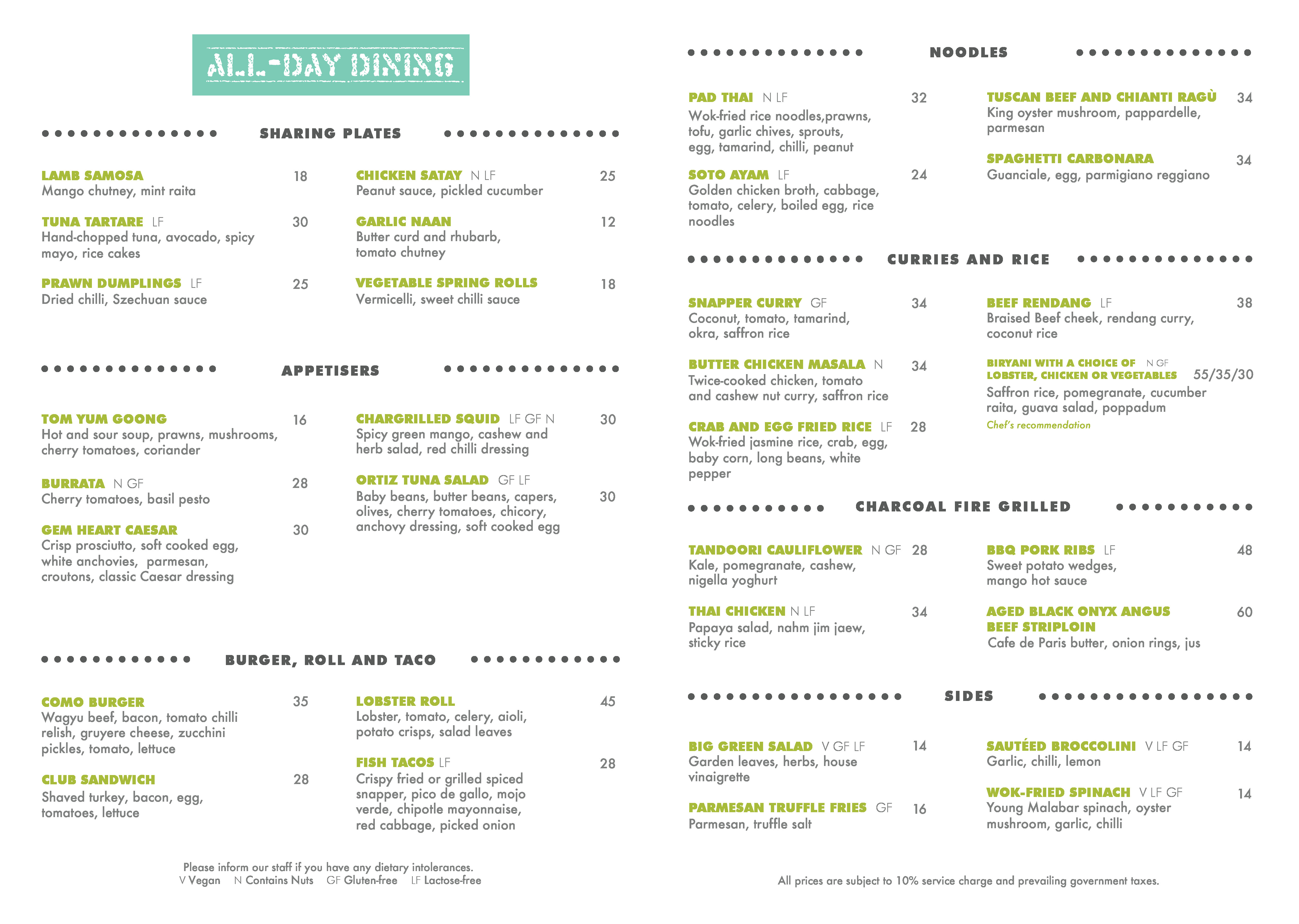 COMO Cuisine приглашает посетителей попробовать каждый из наших отелей и курортов COMO по всему миру с помощью их знаменитых блюд. С глубоким уважением к аутентичным рецептам, душевным вкусам и традиционным методам приготовления, меню создано, чтобы вдохновлять и радовать вкусовые рецепторы. Наряду с прославленной классикой есть более обширное меню, которое отдает дань уважения разнообразным культурам и вкусам в Сингапуре — от согревающей, богатой специями лаксы до любимых блюд, жареных на воке, классики тандури до сливочного ролла с лобстером. COMO Cuisine — это круглосуточный ресторан, где подают завтрак и ужин, спроектированный известным итальянским архитектором Паолой Навоне. В оживленном пространстве есть длинный бар, где подают полный набор коктейлей, вдохновленных каждым из наших отелей.