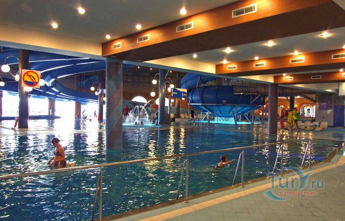 Аквапарк Тропикана в городе Миколайки (самом известном курорте на Мазурских озерах в Польше) по праву считается одним из главных развлекательных центров для туристов и местных жителей. Аквапарк является частью отеля Golebiewski Hotel и входит в состав большого рекреационного комплекса. К услугам его гостей: спортивный бассейн длиной 25 метров, бассейны с искусственной волной, с водно-воздушным гидромассажем, бассейн-река, а также грязевые, магниево-кальциевые, йодно-бромовые, морские, торфяные и щелочные ванны-джакузи, паровая и сухие (еловая, эвкалиптовая, травяная) сауны, ледяная и соляная пещеры. Процедуры гидротерапии улучшат самочувствие и кровообращение, снимут напряжение и боль в мышцах и суставах. Лечебные ванны-джакузи способствуют физической и психологической релаксации, а гидромассаж и СПА-процедуры оказывают положительное влияние на нервную систему и систему органов дыхания. В Аквапарке есть четыре водных горки с общей длиной 700 метров, горка для спуска на понтоне и горка-мельница. Для малышей оборудована детская зона с бассейном-лягушатником, температура воды в котором поддерживается на уровне 35-36 градусов. Рядом с бассейном расположена песочница с детскими горками и фигурами сказочных персонажей. В летнее время работают открытые плавательный бассейн и бассейн с джакузи. У входа в Аквапарк расположен магазин, в котором можно приобрести надувные круги, нарукавники, игрушки и купальники.