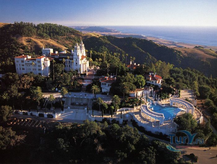 Старый Свет не жалел сокровищ для придания блеска дворцу Уильяма Рэндольфа Херста на высоком тихоокеанском берегу. Замок Херста расположен в 215 милях к югу от Фриско, на горе Сан Симеон, ровно посередине между Сан-Франциско и Лос-Анжелесом - ни на что не похожая, в каких-то деталях даже красивая усадьба. На ее великолепие - впрочем, давящее - владелец затратил неслыханные суммы. Он разграбил всю Европу, чтобы обставить свой дом, а чего не смог купить, то приказал скопировать. Херст называл свою усадьбу "Чарующая высота" (La Cuesta Encantada). Если только подумать, сколько денег он потратил и сколько любви вложил в обстановку дома, то сразу хочется называть этот дом замком. Не зная замок, трудно представить себе его владельца, но зато, если вспомнить фильм Орсона Уэллса "Гражданин Кейн", где прообразом главного героя послужил Уильям Рэндольф Херст, можно вообразить себе этого человека. Принято хвалить два огромных бассейна в замке Херста. Тот, что внутри, - копия с римских терм, а тот, что в саду, рассчитан на 1,3 миллиона литров воды. У его края стоит греческий храм, украшенный классическими статуями и колоннами, от которого открывается прекрасный вид на холмы. Усадьба расположена высоко над калифорнийским побережьем, но отсюда видны океан и маленький порт, куда по распоряжению Херста и прибывали части самого здания, полностью оборудованные комнаты, ящики с мебелью и произведениями искусства. Херст унаследовал землю и состояние своего отца, умершего в 1891 году магната-горнопромышленника Джорджа Херста. Сыну не раз удавалось приумножать эти богатства: он занимался газетным делом и вошел в историю как один из создателей "желтой прессы" (Yellow Press), журналистики сенсаций. Строительные работы в Сан-Симеоне начались в 1919 году после смерти матери Херста. Для претворения своих мечтаний в жизнь он нанял архитектора Джулию Морган. Итальянские, французские, испанские и мавританские стилевые элементы образуют причудливую смесь, а предметы искусства совершенно разных эпох и сталей скомпонованы Херстом просто по собственному разумению. К примеру, огромная столовая воспроизводит зал в средневековом рыцарском замке. Это грандиозных размеров помещение набито всякими предметами из разных эпох: фламандские гобелены, "античные" церковные скамьи, деревянные панно с изображением святых, флаг из Сиены с фамильными гербами, - настоящий винегрет. Стол такой длинный, что нужен театральный бинокль, иначе не разглядеть: что там, на другом конце. На некотором расстоянии друг от друга на столе стоят подсвечники и блюда с крышками для сохранения тепла. Херст и его возлюбленная, актриса Марион Дэвис, поддерживали сталь, который, как и замок, иначе, чем расточительным, не назовешь. Многие голливудские звезды наезжали сюда с визитом: Чарли Чаплин, Мэри Пикфорд, Рудольфо Валентино, Гари Купер, Кларк Гейбл, Кери Грант. К большому замешательству многих нервных гостей был у Херста и частный зоопарк: яки, медведи, обезьяны и кенгуру. Как обычно, все кончается печально. После смерти Херста его наследники не совладали с огромным хозяйством и вынуждены были передать замок в собственность американского правительства. Теперь это федеральный музейный комплекс, доступный для осмотра каждому страждущему туристу. Вам покажут документальный фильм из отрывков частных и документальных съем
