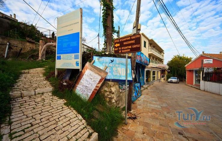 Византийский замок расположен в самом сердце Кассиопи, в 5 минутах ходьбы от моря и занимает большую часть небольшого мыса. Кассиопи, как полагают, был основан во время правления Пирра в III веке до нашей эры и имел важное стратегическое значение. После римского завоевания острова в 230 году до нашей эры, многие императоры посещали его, в том числе император Нерон. Замок был укреплен венецианцами, пережил осаду турков в XVI веке.