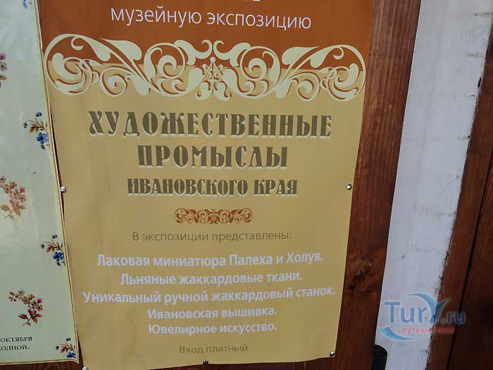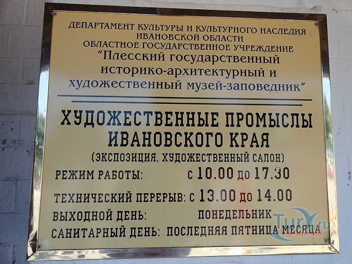 Музей "Художественные промыслы Ивановского края" в Плесе находится на набережной, в здании "Мучных рядов". Здание является памятником архитектуры второй половины XIX века. В экспозиции представлены четыре направления в развитии художественных промыслов Ивановской области -ювелирное искусство, льняное жаккардовое ткачество, лаковая миниатюра Палеха и Холуя, а также оригинальная ивановская вышивка. Особенность экспозиции в том, что наряду с историческими экспонатами, здесь показаны образцы современных изделий. Посетителям предоставляется возможность не только познакомиться с коллекцией, но и приобрести изделия, выполненные современными мастерами.