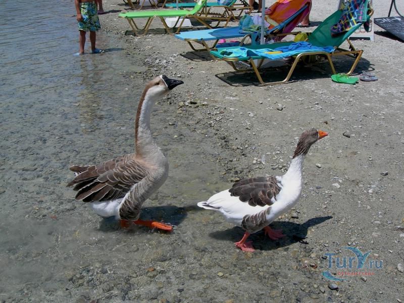 Гуси здорово попрошайничают у посетителей кафе, и ,если что, грозно гогочут, машут крыльями и переходят в наступление. А кафе здесь два, есть прокатная станция, где можно арендовать катамараны, водный велосипед, байдарки, лодку. По берегу озера расставлены скамейки для отдыхающих, редко, но есть шезлонги и зонтики.