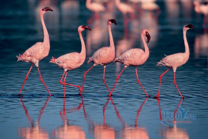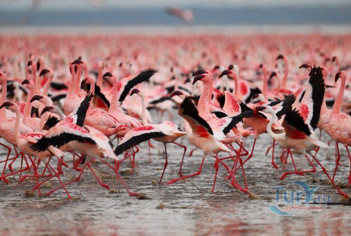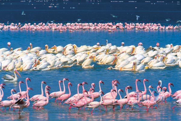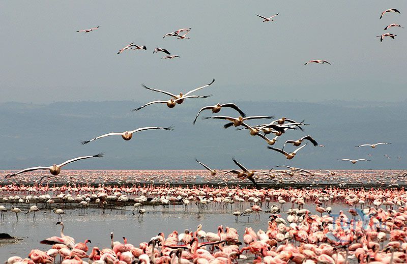 В числе гостей — малый фламинго, которых может собираться до 1,5 миллиона. Птицы располагаются вдоль берегов озера и начинают трапезу. Питаются они исключительно водорослями. Мало кто знает, но именно содержащийся в водорослях бета-каротин придает фламинго характерную ярко-розовую окраску. Кроме малых фламинго, встречаются и обыкновенные фламинго, эти предпочитают личинок и рачков. На Накуру слетается более 100 видов птиц. В их числе баклан, несколько видов цапель, большой белый пеликан, желтоклювый аист, колпица и африканский коршун-рыболов. Птицы здесь настолько смелы, словно находятся у себя дома. Так что озеро вполне можно назвать птичьим.
