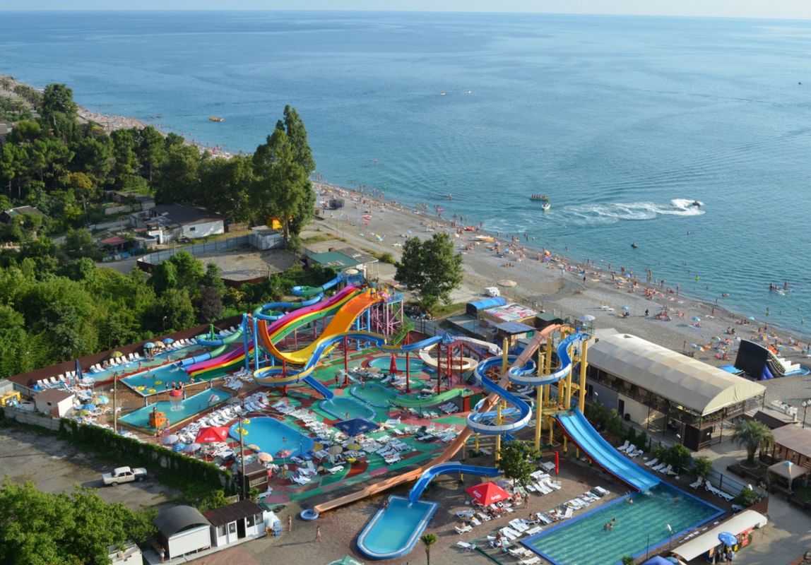 Аквапарк в Гагре - мир головокружительных горок и бирюзовых бассейнов, идеальный способ развлечься всей семьей в жаркий летний день. Этот вид отдыха одинаково хорош как для взрослых, так и для детей. К услугам посетителей аквапарка - скоростная горка, винтовая горка, плавательный бассейн с лежаками и шезлонгами, детский бассейн с горкой, душевые кабинки и раздевалки. Также к услугам посетителей предлагается возможность перекусить в кафе-баре со спутниковым телевидением и широким ассортиментом блюд и напитков. Каждый день гостей ждут выступления музыкантов, веселье и зажигательная дискотека до рассвета. Гагрский аквапарк – это место отдыха для всех возрастов. Аквапарк расположен на берегу моря возле гостиницы «Абхазия». Рядом с аквапарком расположен целый комплекс развлечений – вдоль набережной к услугам туристов многочисленные рестораны, кафе, дискотеки, детская игровая площадка.