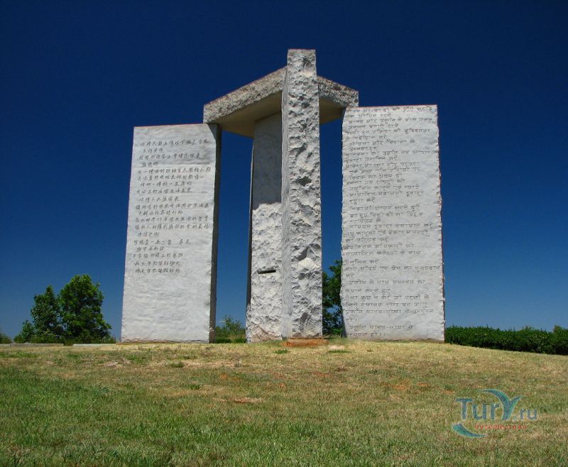 Скрижали Джорджии - это несколько плит расположенных наподобие стоунхенджа. Высота монумента составляет почти 6,1 метр, он состоит из шести гранитных плит общей массой около 100 тонн. На каждой плите с двух сторон на всех основных языках включая русский и санскрит выбиты заповеди которыми должен руководствоваться человек в эпоху Разума. На вершине памятника имеется более краткая надпись на 4 древних языках: аккадском, классическом греческом, санскрите и древнеегипетском.