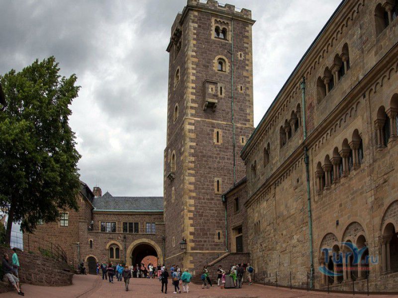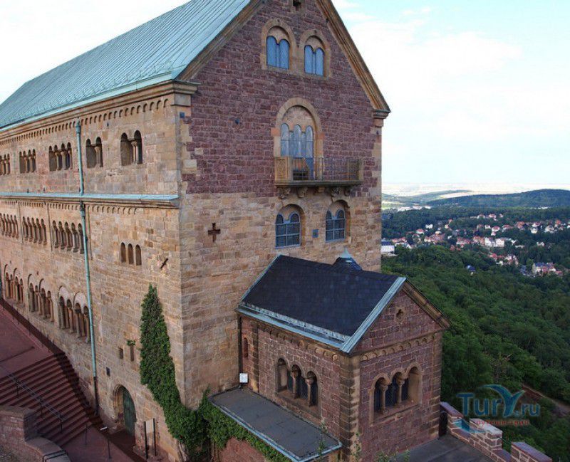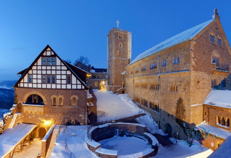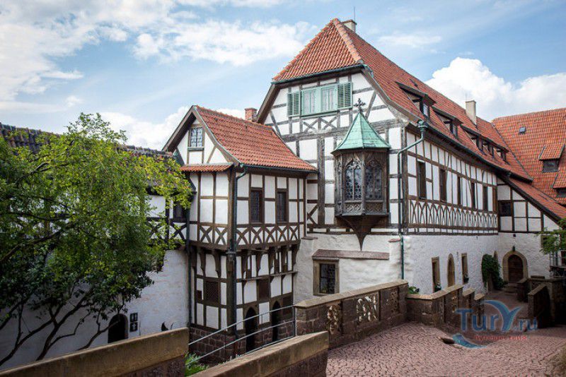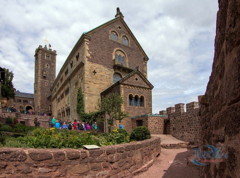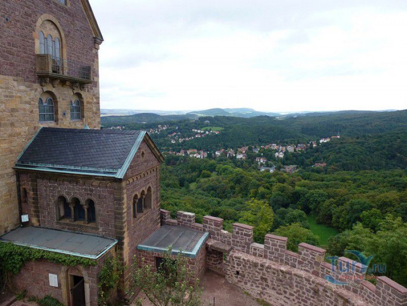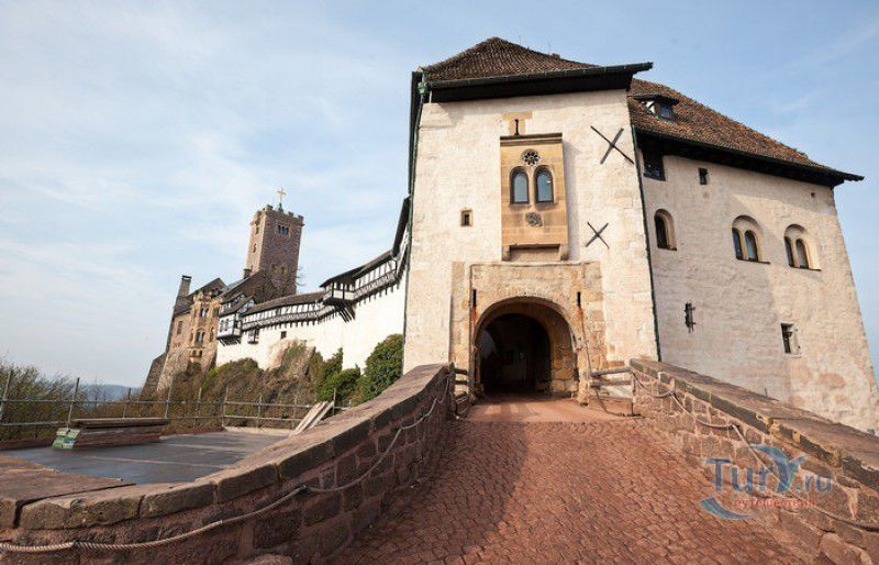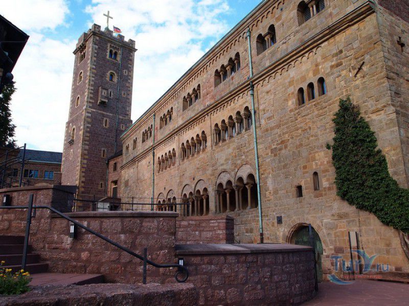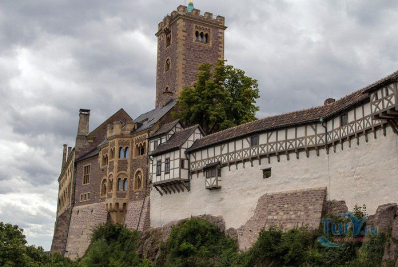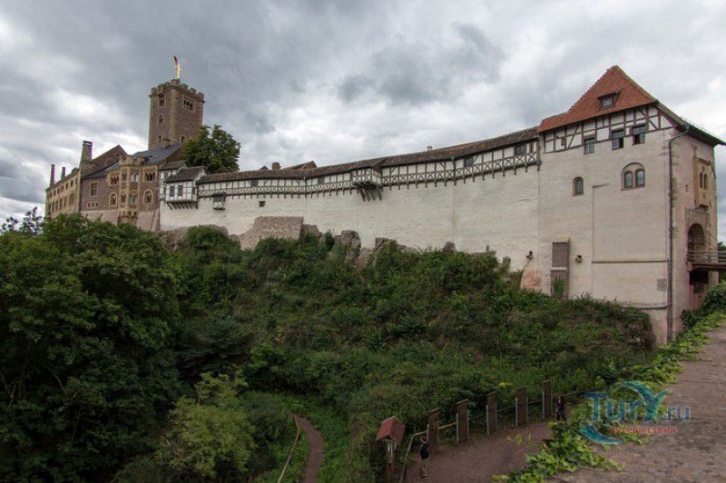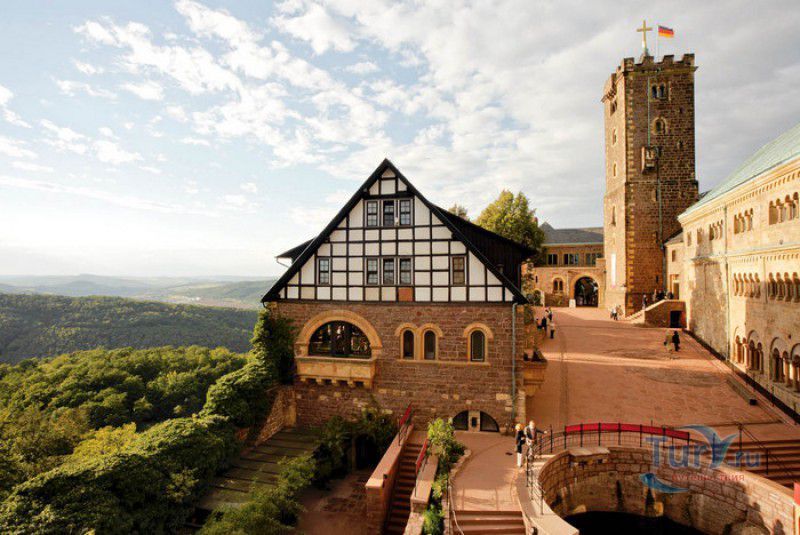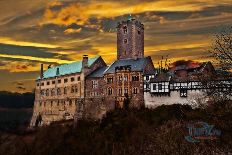 Замок Вартбург - один из самых известных средневековых замков Германии. Он расположен на северо-востоке Германии, в Тюрингии, недалеко от города Айзенах. Вартбург называют "самым немецким и самым мистическим из всех немецких замков" - именно в его стенах впервые была озвучена идея объединения разрозненных германских земель, а вся история замка неразрывно связана с историей Германского государства. В эпоху Средневековья миннезингеры (поэты-музыканты из рыцарского сословия) устраивали в замке поэтические соревнования, наиболее известное из которых - "Вартбургская война", состоялось в 1206 году. По легенде, в состязании приняли участие шестеро "певцов любви" - проигравшего ожидала смерть. Говорят, что от гибели проигравшего менестреля с помощью колдовства спасла жена владельца замка - Софья фон Виттельсбах. Сам великий Рихард Вагнер спустя столетия сделал эту историю сюжетом своей оперы "Тангейзер". В XIII веке в Вартбурге жила Елизавета Венгерская - супруга ландграфа Тюрингии Людвига IV, прославившаяся своей благотворительностью и милосердием. Святую Елизавету Венгерскую особенно чтят в Германии, она считается покровительницей Тюрингии и Гессена. В 1521-1522 годах в Вартбурге скрывался объявленный церковью еретиком и приговорённый к смертной казни Мартин Лютер. Основоположник Реформации, пребывая в глубокой депрессии, утверждал, что в замке его неоднократно посещал дьявол, и, чтобы уберечься от его козней, Лютер занялся переводом на немецкий язык Нового Завета. В 1777 году в замке в течение пяти недель жил великий немецкий поэт Иоганн Гёте. В 1817 году здесь состоялся первый съезд немецких студенческих обществ. Чёрный, красный и жёлтый цвета мундиров студентов впоследствии стали символом свободной и объединённой Германии, а также цветами её государственного флага. В 1938 году в замке, в атмосфере абсолютной секретности, Гитлер встречался с астрологами и ясновидцами, пытавшимися предсказать судьбу Третьего рейха. Известно, что составленный астрологический прогноз не понравился фюреру - все прорицатели, принимавшие участие в составлении предсказания, исчезли из замка бесследно. Возникновение и название самого замка также связаны с легендой - в 1067 году Людвиг Прыгун, представитель знатного дворянского рода Людовингов, охотился в лесах Тюрингии. Увидев высокую скалу, стоявшую посреди лесной чащи, граф воскликнул: "Подожди, гора! Ты должна нести мой замок!", что на немецком языке звучит как "Wart, der Berg!". В результате на вершине скалы, на высоте 411 метров над уровнем моря, был построен родовой замок Людовингов (в то время - деревянный), получивший название Вартбург. Первое письменное упоминание о нём датируется 1080 годом - в одной из летописей говорится о нападении воинов Людвига Прыгуна на отряд короля Генриха IV, следовавшего мимо замка. В 1155-1162 годах ландграфом Людвигом II на месте деревянного был построен каменный замок, один из первых каменных замков в Германии. Именно этот дворец, по тем временам роскошный и величественный (замок был даже больше императорского дворца в Госларе), сохранился до наших дней. От построек XII столетия остались также восточная часть крепостной стены, ворота и дальняя башня. В 1318 году замок сильно пострадал от пожара, возникшего от удара молнии. Спустя год началось его восстановление - в замке появились большое отапли