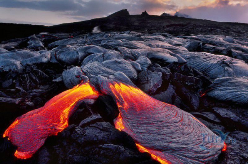 Национальный Парк Гавайские Вулканы расположен на юго-востоке острова Гавайи, в 48 километрах к юго-западу от города Хило. Парк Гавайские Вулканы - одно из немногих мест на планете, где можно вблизи увидеть множество гейзеров, выбрасывающих тонны вулканических газов, наблюдать за потоками раскалённой лавы и бурлящими лавовыми озёрами, а также стать свидетелем одного из самых завораживающих зрелищ - извержения вулканов. Парк Гавайские Вулканы был создан в 1916 году, он занимает территорию площадью 1308 квадратных километров, на которой расположены один из самых больших на Земле действующих вулканов - Мауна-Лоа (его высота над уровнем моря - 4169 метров, а общая высота, с учётом подводной части, - 9170 метров) и один из самых активных вулканов на планете - Килауэа (1247 метров над уровнем моря). Первое извержение Мауна-Лоа произошло около 700 000 лет назад, последнее - в 1984 году, а Килауэа, самый молодой из Гавайских вулканов, активен постоянно с момента своего образования. Последнее его извержение, начавшееся в 1983 году, продолжается и по сей день, в 2008 году оно перешло в фазу интенсивной активности - из кратера Халемаумау, расположенного в центре кальдеры Килауэа, постоянно выделяются вулканические газы, выбрасываются столбы вулканического пепла и непрерывно стекают в океан потоки раскалённой лавы. Следствием постоянной вулканической активности на протяжении тысячелетий стало большое разнообразие ландшафтов и экосистем парка - бесплодные пустыни, покрытые застывшей лавой, шлаковые конусы, пещеры, реки и озёра из расплавленной лавы, участки вечнозелёных влажных тропических лесов и пляжи из чёрного песка на океаническом побережье. В зимний период вершина Мауна-Лоа часто покрыта снегом, при этом на побережье острова температура никогда не опускается ниже + 20° С. Такое разнообразие экосистем и природных зон способствовали появлению на территории парка большого количества видов животных и растений, значительная часть которых являются эндемиками острова. В парке произрастают 36 видов редких или находящихся под угрозой исчезновения видов растений, в числе которых знаменитые Гавайский древовидный папоротник, древовидный "колокольчик" Клермонтия пелеана - растение, почти исчезнувшее в дикой природе, и Метросидерос - кустарник с большими ярко-красными цветами. В парке обитают 23 эндемичных вида птиц, в том числе огненная гавайская цветочница, гавайский гусь, гавайский буревестник и гавайский ястреб. На территории парка водятся плотоядные гусеницы, огромные стрекозы, улыбающийся паук, в прибрежных водах можно встретить находящуюся под угрозой исчезновения черепаху бисса. А вот млекопитающие в парке представлены всего одним видом летучих мышей. Среди исторических и археологических памятников парка Гавайские Вулканы самой известной является долина петроглифов Пуу Лоа, расположенная на южном склоне вулкана Килауэа. Пуу Лоа представляет собой огромное поле, состоящее из 23 000 рисунков (прямых линий, геометрических фигур, концентрических колец, изображений людей и животных), высеченных гавайскими аборигенами в застывшей лаве более 200 000 лет назад. Через поле петроглифов проложен деревянный настил, по которому посетители, желающие увидеть загадочные рисунки, могут отправиться в поход по долине Пуу Лоа. Ещё один интересный объект парка - окаменел