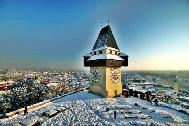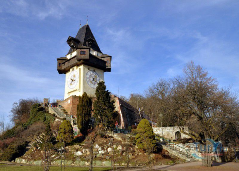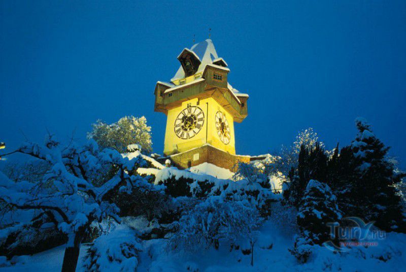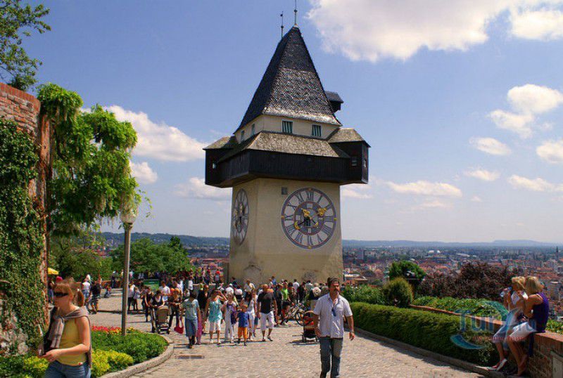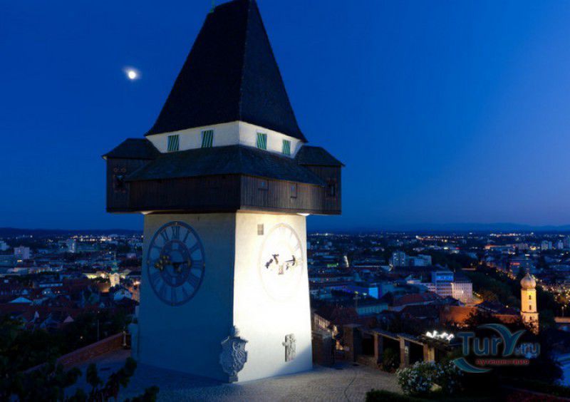 Часовая Башня, одна из самых известных достопримечательностей и символ австрийского города Грац, расположена на вершине замковой горы Шлоссберг, в историческом центре Граца, в составе которого в 1999 году внесена в список Всемирного наследия ЮНЕСКО. Первое упоминание о башне датируется 1265 годом, она являлась частью оборонительных сооружений старинного замка-крепости Шлоссберг, построенного ещё в X веке. Замок был неприступен на протяжении столетий, пока в 1809 году не был взорван наполеоновскими войсками. От крепости уцелели лишь колокольня, остатки двух бастионов и Часовая башня, за которую жители Граца заплатили французам немалый выкуп. Высота башни - 28 метров, свой нынешний вид она приобрела в 1560 году, в 1712 году на каждой из четырёх граней башни были установлены часы с пятиметровым циферблатом и всего с одной стрелкой, отсчитывающей часы. Минутная стрелка появилась намного позже, но без знания "секрета" часов башни, можно легко ошибиться во времени - дело в том, что большая стрелка отсчитывает часы, а маленькая - минуты. Кроме того, на башне установлены три колокола. Часовой колокол, самый старый в Граце, был отлит в 1382 году и, как следует из его названия, отбивает время. Пожарный колокол был изготовлен в 1645 году и звонил при пожарах и других бедах, постигших город. Колокол грешников впервые пробил в 1450 году, сообщая о приведении в исполнение смертной казни (в XIX веке его звон сообщал о начале комендантского часа). Верхняя часть башни окружена деревянной галереей, которая служила обзорной точкой для пожарной охраны, в трёх углах башни размещены гербы, некогда украшавшие замок Шлоссберг - герб Штирии, одноглавый орёл - герб будущего императора Фердинанда I и двуглавый орёл с инициалами императрицы Марии Терезии. Крупномасштабная реконструкция Часовой башни была проведена в 2008-2011 годах, в ходе которой были укреплены фундамент, обновлены деревянные конструкции и отреставрированы часы. Рядом с Часовой башней разбит красивый парк и оборудована смотровая площадка, с которой открывается великолепный панорамный вид на исторический центр Граца.