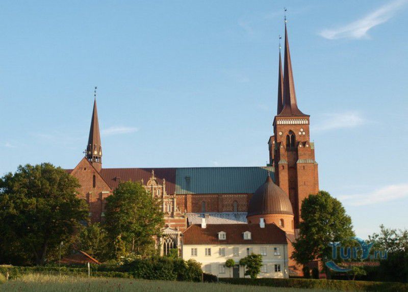 Кафедральный Собор Роскилле расположен в Дании, в восточной части острова Зеландия, в городе Роскилле. Собор Роскилле знаменит тем, что стал первым в Дании собором, построенным в стиле кирпичной готики. Кроме того, начиная с XV века, он является основным местом захоронения датских монархов и членов королевской семьи. Ещё в X веке на месте нынешнего собора королём Харальдом Синезубым была возведена небольшая деревянная церковь, освящённая в честь Святой Троицы. В 1026 году эту церковь снесли, а на её месте в 1080 году построили трёхнефную базилику в романском стиле из травертина (известкового туфа), большие залежи которого были обнаружены на острове Зеландия. В 1170 году, при епископе Абсалоне, церковь начали перестраивать, но в качестве строительного материала уже использовали красный обожжённый кирпич, технология изготовления которого стала известна в Дании в начале XII века. В 1092 году епископом Роскилле становится Педер Сунесон, племянник Абсалона, который в корне меняет первоначальный проект собора, заменив романский стиль на французскую готику. Строительство собора длилось 100 лет и было завершено в 1280 году, всего на его постройку израсходовали более 2,5 миллионов кирпичей. В 1400 году были построены северная и южная башни, высокие остроконечные шпили на них появились в 1635 году, после чего высота башен стала равняться почти 114 метрам. В XV веке собор Роскилле становится основным местом захоронения датских королей, в храме начинают строить часовни-усыпальницы, одна пышнее другой. Примечательно, что за всю историю собора в нём ни разу не короновались и не венчались монархи Дании, все эти церемонии проходят в других храмах, собор Росклилле - только мавзолей королевской семьи. Всего в соборе были погребены 39 королей и королев Дании, первыми здесь были похоронены Харальд Синезубый (986 год), Свен Вилобородый (1014 год) и Свен II Эстридсен (1074 год). О факте захоронения в соборе Роскилле первых двух монархов сообщают исторические хроники, но местоположение их могил неизвестно. Позади главного алтаря расположен мраморный саркофаг королевы Маргрете I, выполненный в 1423 году скульптором из Любека Йоханнесом Юнге. Маргрете I скончалась в 1412 году и была похоронена в аббатстве Соре, но через год её прах перенесли в собор Роскилле. Во время трёхдневной траурной церемонии королём Эриком Померанским и датским дворянством собору были преподнесены щедрые дары - от королевской семьи каждый алтарь получил по золотой алтарной преграде (антепендиуму), золотому жертвеннику и серебряной чаше, от дворян - золотые флорины, от рыцарей и богатых горожан - серебряные монеты. В 1460 году в соборе была построена капелла Волхвов, ставшая усыпальницей короля Кристиана I и его супруги, королевы Доротеи. Двухэтажная часовня построена в готическом стиле, её стены богато украшены фресками и картинами. Могилы Кристиана I и королевы Доротеи отмечены скромными каменными плитами, а их надгробным памятником стала сама капелла Волхвов. Позже в этой часовне были похоронены короли Кристиан III и Фредерик II, их надгробия выполнены фламандскими скульпторами Корнелисом Флорисом и Герртом ван Эгеном, в качестве материала для саркофагов, напоминающих античные мавзолеи, были использованы алебастр, красный и чёрный бельгийский мрамор. В Капелле Волхвов установлена Колонна Королей, знамени
