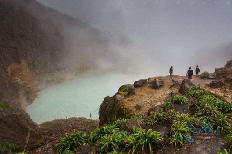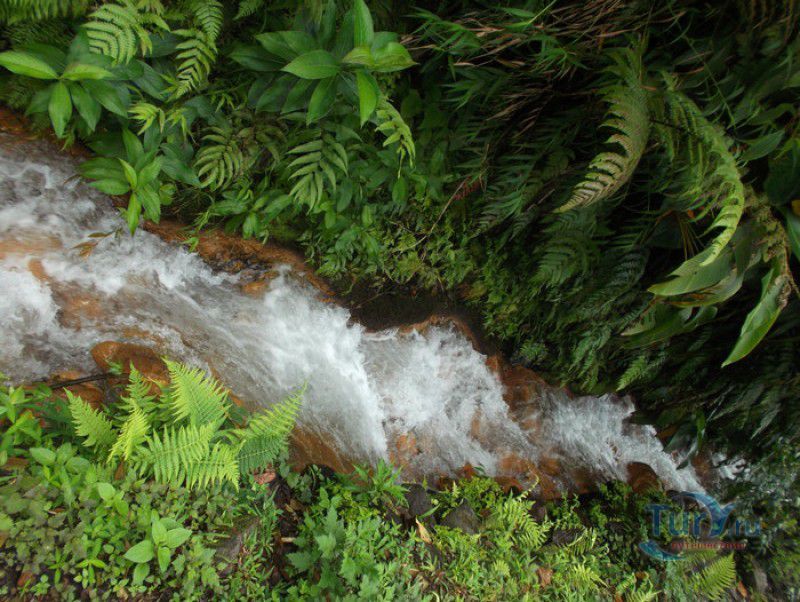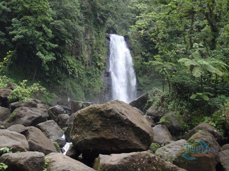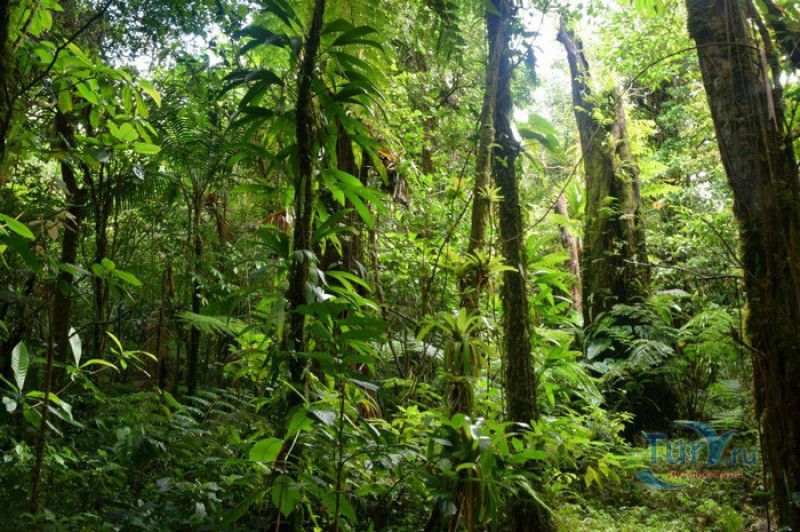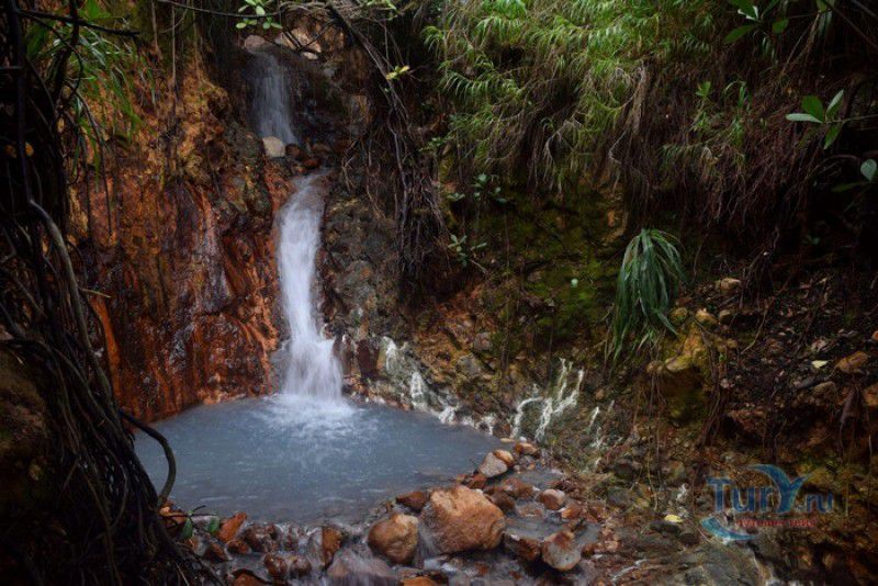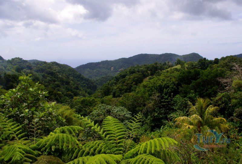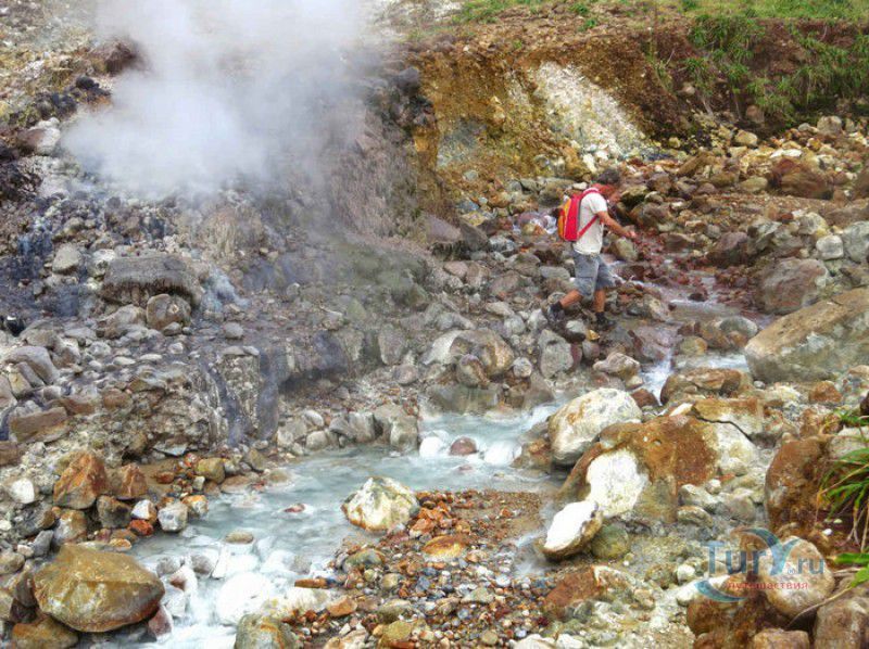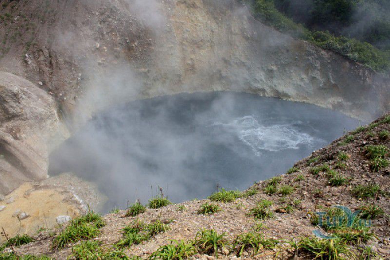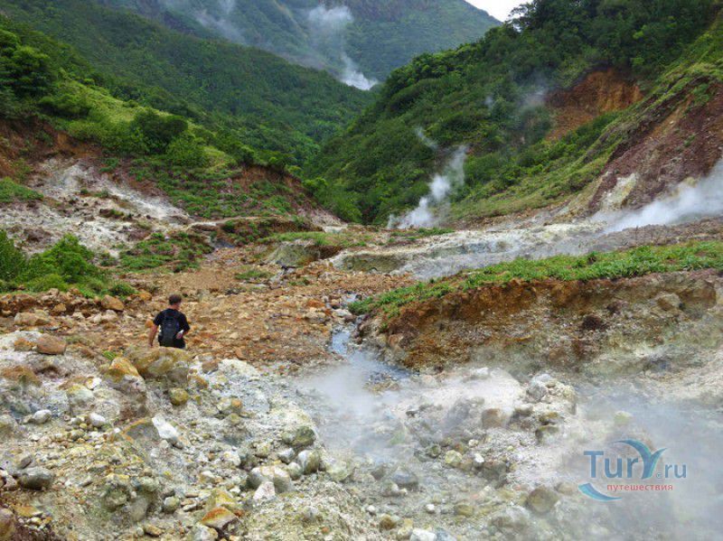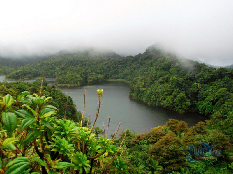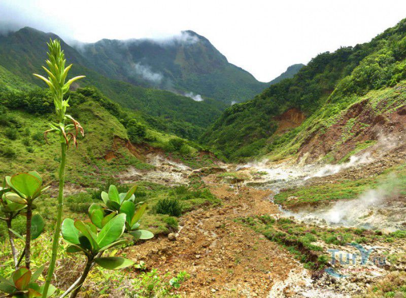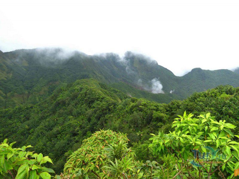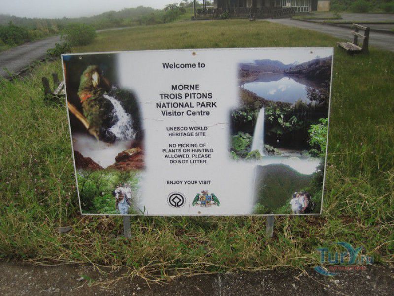 Национальный Парк Морн-Труа-Питон расположен в южной части острова Доминика, на склонах самой высокой горы острова - Морн-Труа-Питон. Парк Морн-Труа-Питон (первый Национальный парк в Доминике) был создан в 1975 году, в 1997 году он был внесен в список Всемирного наследия ЮНЕСКО благодаря "самому значительному биоразнообразию на Малых Антильских островах и редкому сочетанию природных особенностей этой территории". Парк занимает территорию площадью 65 квадратных километров, на которых расположены шесть природных растительных зон. На высоте 915 метров над уровнем моря, где постоянно держится низкая температура, дуют сильные ветры и идут дожди, расположены облачные (эльфийские) леса, окутанные густым туманом. Здесь растут в основном папоротники, лишайники, лобелия, клузия, низкорослые кустарники и невысокие пальмы, а также обитает находящийся на грани исчезновения Королевский амазонский попугай. Ниже расположены горные заросли, для которых характерны тонкоствольные деревья высотой 12-15 метров с небольшой кроной. Только здесь встречается эндемик Доминики - хвойное дерево ногоплодник. На высоте 610 метров над уровнем моря произрастают влажные горные леса. Деревья в этом лесу невысокие, имеют длинные корни, их стволы покрыты мхами, лишайниками и густо обвиты лианами. На высоте 460 метров господствуют пышные зрелые тропические леса. Здесь растут деревья, достигающие в высоту 30 метров, нижний ярус представлен густыми зарослями бромелиевых, антуриума, ликаний, папоротников, селагинелл и миконий. Вторичный тропический лес растёт на заброшенных ранее возделываемых землях, растительный мир здесь представлен в основном древовидными папоротниками. Ещё ниже, на невысоких возвышенностях, произрастают орхидеи, бромелиевые, папоротники и дикий виноград. Ландшафт парка поражает разнообразием - горные вершины, крутые обрывы и глубокие ущелья, фумаролы (всего их в парке - 50), горячие источники, водопады, три пресноводных озера, Кипящее озеро - второе по величине горячее озеро в мире, и пять потухших вулканов. Без сомнения, главной достопримечательностью парка является Кипящее озеро - затопленная фумарола, диаметр которой - 76 метров, глубина - 59 метров. Температура воды вблизи берега достигает 82-92 градусов по Цельсию, в центре вода кипит, поэтому над озером постоянно висит облако горячего пара. Озеро со всех сторон окружено отвесными скалами, в одном месте есть плоское плато, с которого открывается великолепный вид на это "чудо" природы (купаться в озере категорически запрещено). Поход к Кипящему озеру - один из самых популярных, но и самых трудных и опасных туристических маршрутов, туристам настоятельно рекомендуют совершать его только в сопровождении профессионального гида. В одну сторону дорога занимает около четырёх часов, путь часто пролегает по крутым горным склонам, проходит по узкому горному хребту, пересекает густой тропический лес, ущелья и горные реки. На подступах к озеру путешественники должны пройти через Долину Запустения - бесплодную вулканическую долину с множеством гейзеров, выбрасывающих столбы пара, и горячих ручьев. Благодаря минеральным солям, содержащимся в воде, каменистая почва долины окрашена в оранжевый, бордовый, чёрный и серый цвета. Между Долиной Запустения и Кипящим озером растёт густой тропический лес, через которы