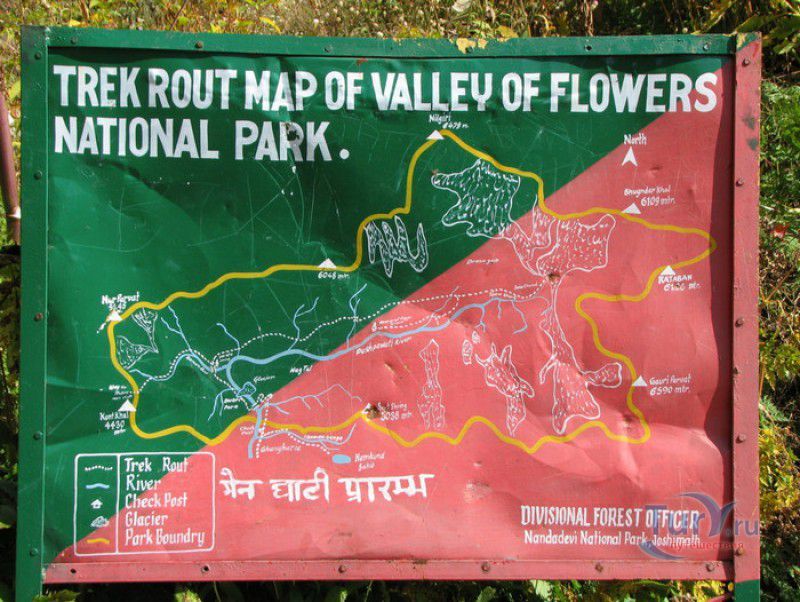 Национальный Парк Долина Цветов расположен на севере Индии, в Западных Гималаях, в штате Уттаракханд, в районе Чамоли. Знаменитая на весь мир высокогорная Долина Цветов была обнаружена в 1931 году группой британских альпинистов во главе с Фрэнком Смайтом во время восхождения на вершину горы Камет. В пути группу настиг сильный циклон, и в поисках места, где можно было бы укрыться от непогоды, альпинисты случайно обнаружили долину "сказочной красоты", в которой "невозможно было сделать ни одного шага, чтобы не наступить на цветок". Поражённый увиденным, Фрэнк Смайт задержался в долине на шесть недель, а возвратившись в Англию, написал книгу "Долина Цветов" (Valley of Flowers). С целью сохранения первозданной красоты, уникальных экосистем и биоразнообразия этой местности, в 1982 году Долине Цветов был присвоен статус Национального парка Индии, в 2004 году она вошла в состав биосферного заповедника Нанда Деви, а в 2005 году была внесена в список Всемирного наследия ЮНЕСКО. Расположенная высоко в горах, на высоте 3658 метров над уровнем моря, в окружении заснеженных горных пиков, скалистых ущелий, горных ручьёв и водопадов, Долина Цветов большую часть года покрыта снегом, но с наступлением весны, она "просыпается" и в июле-августе покрывается огромным цветочным ковром, поражающим буйством красок и разнообразием оттенков. Здешние растения имеют очень короткий период вегетации - не успели одни растения отцвести, как на их месте тут же появляются новые, но уже совсем других цветов и оттенков, именно поэтому Долину Цветов часто называют "живой радугой". На территории парка площадью 87 квадратных километров произрастают более 600 видов субальпийских, альпийских и высокогорных растений, многие из которых являются эндемичными, редкими или находящимися на грани исчезновения видами. В Долине Цветов растут лилии, примулы, календула, ромашки, анемоны, маргаритки, орхидеи, гравилаты, морина длиннолистная, иван-чай, купена, гималайский колокольчик, калужница болотная, борец непальский, тюльпаны, рододендроны, голубой гималайский мак и многие другие. Животный мир Долины Цветов представлен редкими и находящимися под угрозой исчезновения видами - здесь обитают 13 видов млекопитающих (снежный барс, гималайский медведь, гималайская кабарга, желтогрудая куница, гималайская ласка, голубой баран, гималайский тар), 114 видов птиц и множество видов бабочек. Тысячи туристов со всего мира приезжают в Долину Цветов в летние месяцы, чтобы своими глазами увидеть "живой" цветочный ковёр, созданный природой. Для посетителей парка разработан туристический маршрут, пройдя по которому можно в полной мере насладиться красотой одного из живописнейших мест на Земле. Посетители Долины Цветов не могут оставаться на ночь, разбивать лагерь и передвигаться по парку на транспортном средстве, покинуть территорию парка необходимо до наступления темноты. Ближайшее к Долине Цветов жильё и кемпинги находятся в деревне Гангария расположенной в 4-х километрах от парка. Здесь же находится и пропускной пункт Департамента лесного хозяйства, в котором перед посещением парка необходимо получить разрешение на посещение парка и оплатить вступительный взнос. От деревни Гангария начинается пешеходный маршрут по Долине Цветов.