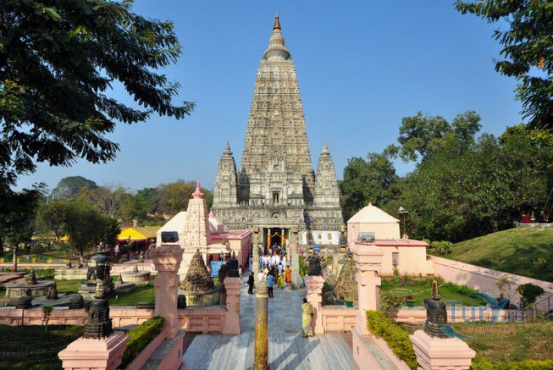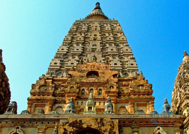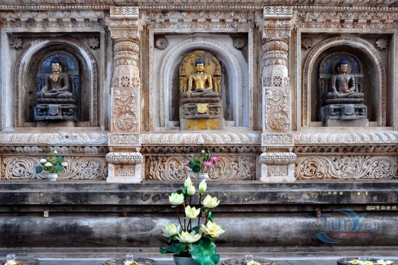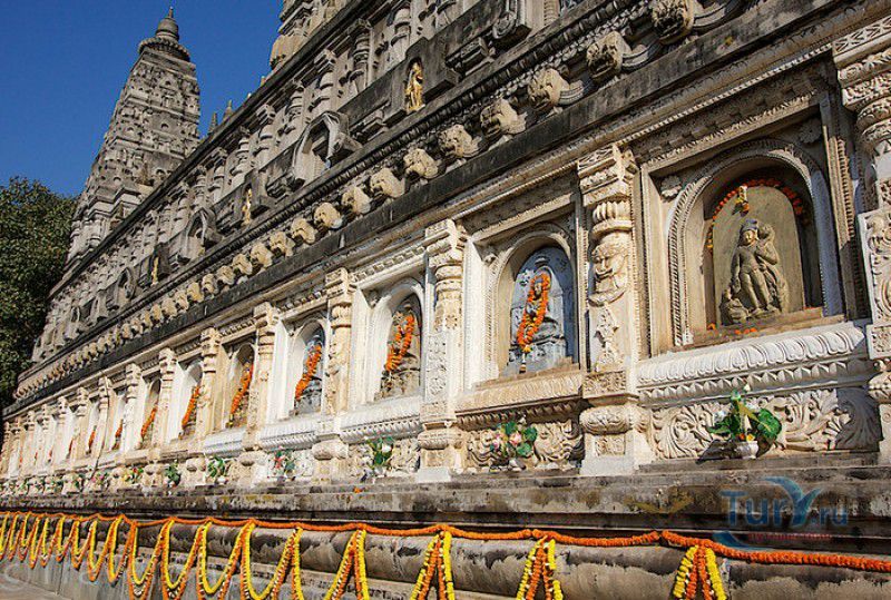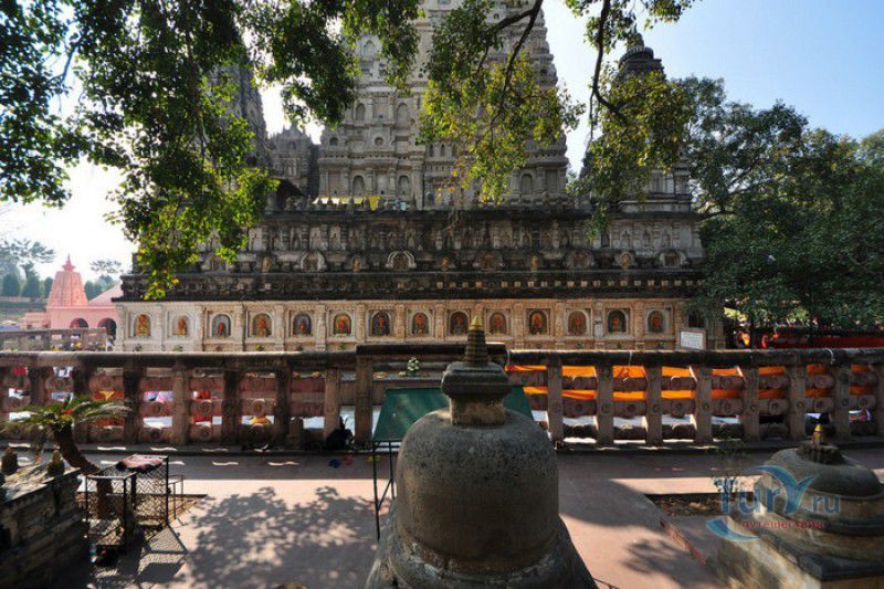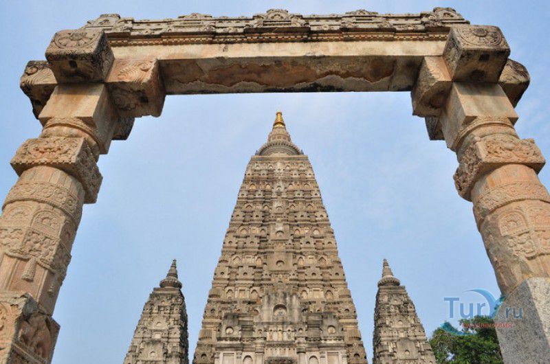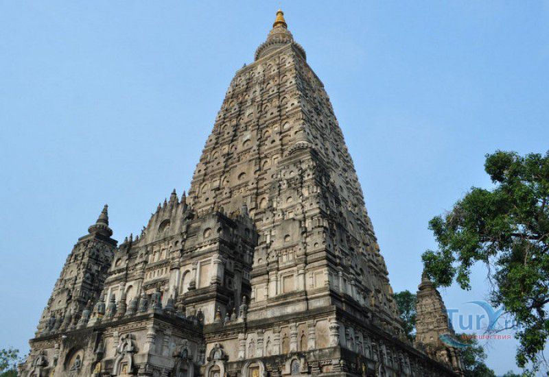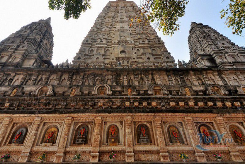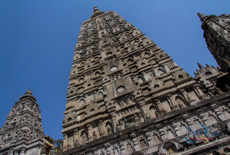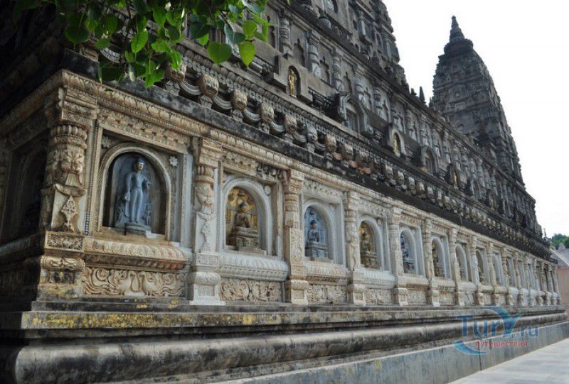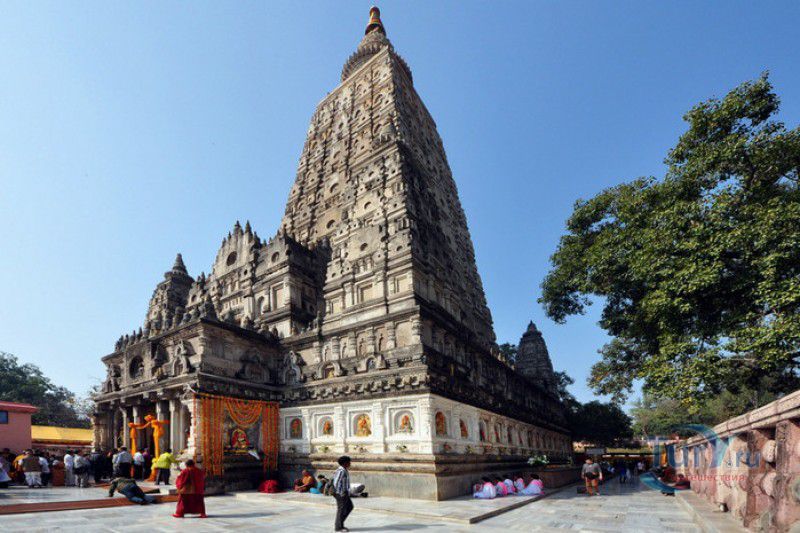 Храм Махабодхи расположен в северо-восточной части Индии, в штате Бихар, в городе Бодх-Гая. Махабодхи - один из самых знаменитых и почитаемых в мире буддистских храмов, он построен на том самом месте, где, по преданию, в 589 году до нашей эры основатель буддизма Сиддхартха Гаутама, во время медитации под священным деревом Бодхи, достиг Просветления и стал Буддой. Храм был возведен в 260 году до нашей эры по приказу императора Ашоки Маурьи, решившего увековечить это священное место для потомков. Первоначально храм представлял собой небольшой открытый павильон с "Алмазным Троном" - Ваджрасаной. От первого храма до наших дней практически ничего не сохранилось, он был значительно расширен и перестроен в V-VI веках. Храм Махабодхи представляет собой величественную 55-метровую пирамидальную башню (ступу), окружённую четырьмя меньшими башнями, построенными по подобию главной башни. Храм полностью выполнен из кирпича, толщина кладки достигает пяти метров, а кирпичи настолько плотно пригнаны друг к другу, что цемент при строительстве использовался в минимальных количествах. Поверхность здания оштукатурена, на нижнем уровне есть множество ниш со статуями Будд и Бодхисаттв, верхняя часть украшена резными панелями, рельефами и декоративной лепниной. Со всех сторон здание окружено каменными перилами двухметровой высоты. Наиболее старая часть перил, датируемая 150 годом до нашей эры, выполнена из песчаника. На перилах вырезаны изображения богини изобилия, процветания и богатства Лакшми, купающейся со слонами, и бога Солнца Сурьи, едущего в колеснице, запряжённой четвёркой лошадей. Более новая часть перил выполнена из необработанного гранита в IV-VI веках, во время эпохи Гуптов, перила украшены резными изображениями цветков лотоса и Гаруды - ездовой птицы бога Вишну. Внутри ступы есть два помещения. В первом из них находятся гранитные плиты, на которых выбиты имена и портреты членов королевских семейств Непала и Мьянмы (Бирмы), покровительствующих храму Махабодхи. Вторая комната - это святая святых храма, в ней установлен алтарь с позолоченной статуей Будды, сидящего в позе Ваджрасана. Рядом с западной стеной храма растёт священное дерево Бодхи. Того дерева, под которым достиг Просветления Будда, давно уже нет - по преданию, оно было срублено самим Ашокой, когда он ещё не был буддистом. Молодой император, выполняя обряд подношения индуистским богам, поджёг ветви и листья дерева Бо, но они не горели, а только сияли в огне. Раскаявшись, Ашока стал поливать корни священного дерева молоком с пряностями, и уже на следующий день дерево Бо "воскресло". В VII веке дерево приказал срубить король Шашанка, преследовавший буддистов. Король велел выкорчевать и сжечь дерево Бодхи, а оставшиеся в земле корни поливать сахарным сиропом, чтобы их источили муравьи. Но самые глубокие корни не были повреждены, и через время из них снова выросло дерево Бодхи. Это дерево пережило и мусульманское нашествие, и изгнание из Бодх-Гая буддистов, и разрушение храма Махабодхи. Оно рухнуло от старости в 1876 году, не устояв перед сильной бурей, пронесшейся над Бодх-Гая. Но на месте упавшего дерева тут же зазеленели новые побеги, из которых выросло нынешнее священное дерево Бо, высота которого - 24 метра. В XIII столетии северо-восток Индии был завоёван мусульманами, и на смену буддизму при