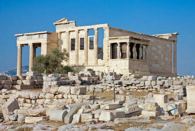 Храм Эрехтейон - один из самых почитаемых храмов древних Афин, расположен на северной стороне Акрополя, недалеко от Парфенона. Эрехтейон был построен в 421-406 годах до нашей эры на месте более раннего храма, разрушенного персами во время Греко-персидской войны. В новом храме, построенном по приказу Перикла, но уже после его смерти, поклонялись Афине, Посейдону и мифическому царю Афин - Эрехтею. Согласно древнегреческому мифу, именно на том месте, где был возведен Эрехтейон, произошёл спор между Афиной и Посейдоном за право обладания Аттикой - как известно, Афина выиграла спор, подарив жителям города вечнозелёную оливу (первое оливковое дерево, выросшее на земле Древней Греции), а в том месте, где Посейдон ударил своим трезубцем о скалу, забил источник с морской водой. Храм Эрехтейон был построен в ионическом стиле, предположительно, его создателем был древнегреческий зодчий Мнесикл. Храм, выполненный из пентелийского мрамора, имеет асимметричную планировку, что обусловлено трёхметровым перепадом высоты скалистой местности, на которой он был возведен. Эрехтейон имел два главных входа - северный и восточный, каждый из которых был украшен портиком с колоннами ионического ордера. Более высокая восточная часть храма была посвящена Афине Палладе, в святилище была установлена статуя богини, выполненная из оливкового дерева, которую ежегодно, во время проведения Панафинейских игр (празднеств в честь покровительницы города богини Афины) обряжали в новый пеплос. Западная часть храма была посвящена Посейдону и Эрехтею, вход в святилище располагался с северной стороны здания, с обеих сторон он был обрамлён выступами продольных стен, между которыми располагались четыре ионические колонны. Дверной проём северного входа был украшен богатой декоративной резьбой. На южном фасаде святилища Посейдона расположен знаменитый Портик кариатид с шестью женскими мраморными статуями, поддерживающими архитрав. Сегодня все они заменены на копии, оригиналы хранятся в Британском музее и в музее Акрополя. По периметру храм был окружён фризом из серого элевсинского камня с накладными рельефами из белого мрамора. Фриз до наших дней не сохранился, его уцелевшие фрагменты находятся в музее Акрополя. Некогда на одной из стен Эрехтейона можно было увидеть гигантскую трещину, якобы оставленную трезубцем Посейдона, на месте источника с морской водой был построен глубокий колодец, а во дворе святилища нимфы Пандросы, расположенном в западной части храма, росла священная олива, подаренная городу Афиной. По преданию, под северным портиком Эрехтейона находилась могила афинского царя Эрехтея, а у западного фасада - могила первого царя Аттики Кекропса (человека-змея). В I веке до нашей эры, во время правления римского императора Луция Корнелия Суллы, храм Эрехтейон был предан огню, но через некоторое время был восстановлен в своём первоначалом виде. В раннехристианской период храм был преобразован в церковь Богородицы, а во времена владычества Османской империи Эрехтейон был перестроен во дворец, в котором располагался гарем турецкого правителя Афин. В 1687 году, во время турецко-венецианской войны, храм Эрехтейон был значительно повреждён венецианскими войсками, осаждавшими Афины, а окончательно храм был разрушен в 1826 году, во время войны греков за независим