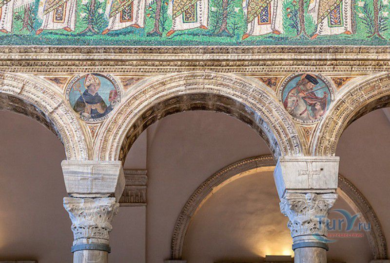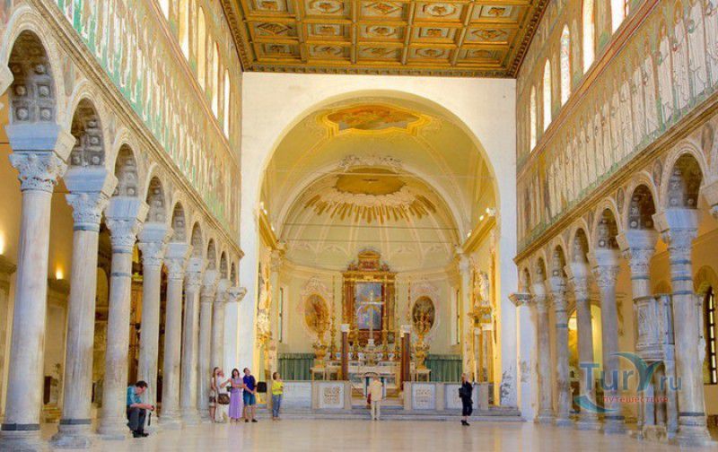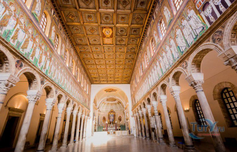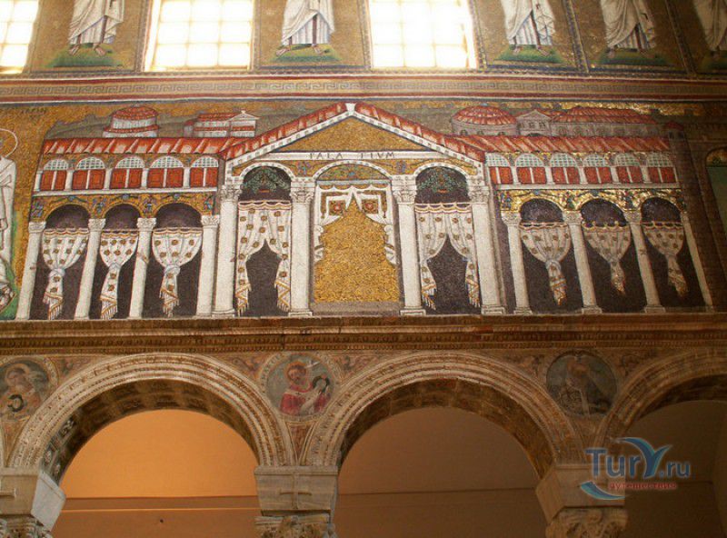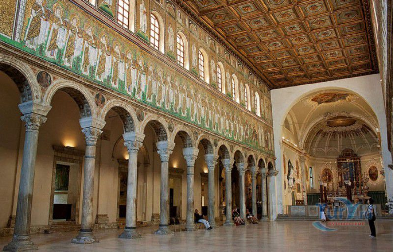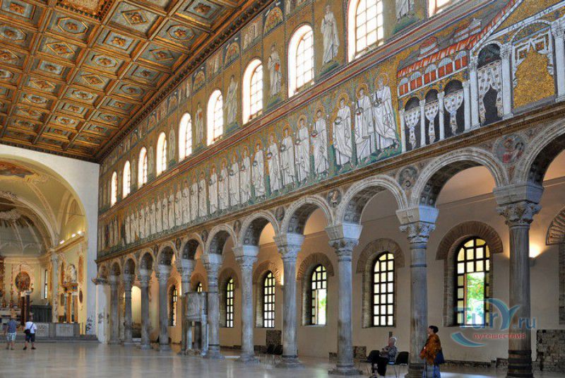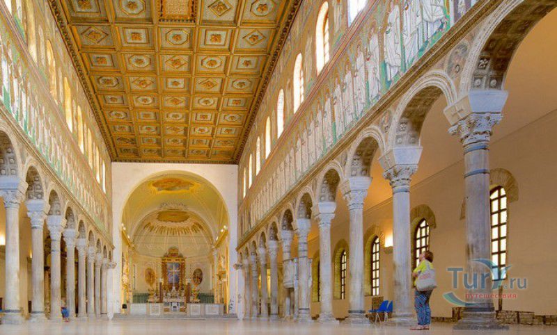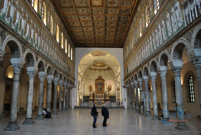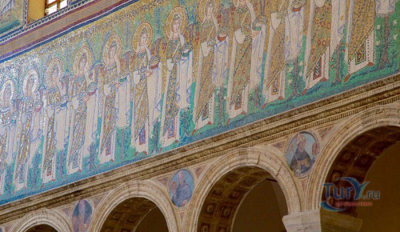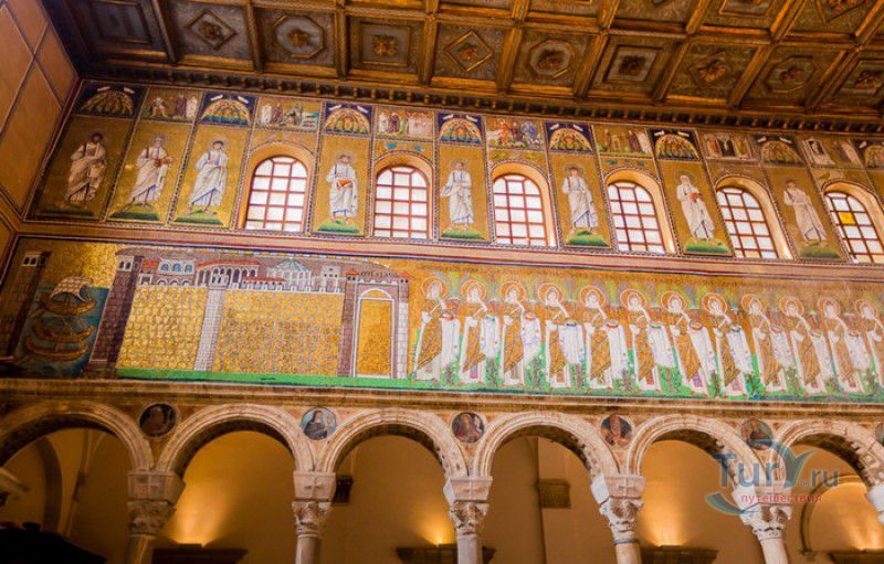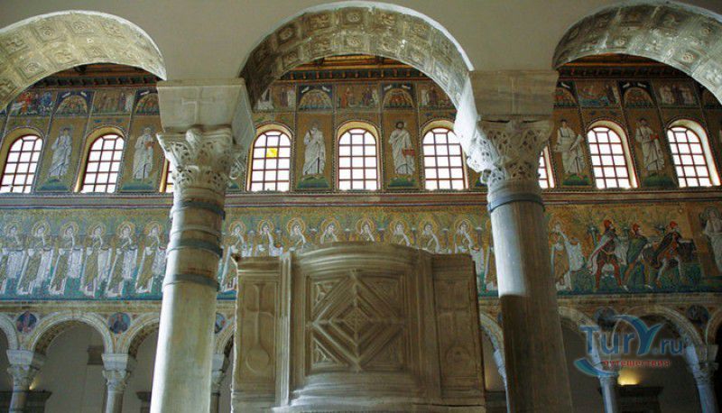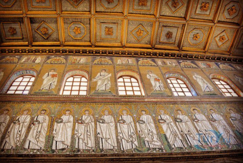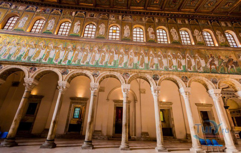 Базилика Сант Аполлинаре Нуово - одна из раннехристианских церквей города Равенна, была построена в 493-526 годах королём остготов Теодорихом Великим. Базилика была возведена рядом с королевским дворцом, от которого до наших дней сохранились лишь развалины, и имела статус придворной церкви Теодориха Великого. Правитель Королевства остготов исповедовал арианство - еретическое течение в христианстве, получившее статус государственной религии в поздней Римской империи в IV-VI веках, поэтому и построенная им церковь, освящённая в честь Христа Спасителя, была арианской и оставалась таковой вплоть до 561 года. После завоевания Равенны византийским императором Юстинианом I все арианские храмы были переданы православным христианам, и в 561 году базилика была освящена в честь святого Мартина Турского - ярого борца с арианской ересью. По требованию Папы Римского Григория I большинство арианских мозаик, украшавших храм, были либо удалены, либо переложены. Своё нынешнее название церковь получила в 856 году, когда в неё из базилики Сант Аполлинаре ин Классе были перенесены мощи Святого Аполлинария - покровителя города Равенна. Храм был освящён в честь Святого Аполлинария, а приставку "нуово" в название базилики добавили, чтобы отличать её от храма с тем же названием, расположенным в районе древнего порта Классе. В 1748 году мощи Святого Аполлинария были возвращены на своё прежнее место, но название базилики Сант Аполлинаре Нуово менять из-за этого не стали. За свою долгую историю базилика несколько раз перестраивалась - в X-XI веках к церкви была пристроена 38-метровая колокольня цилиндрической формы, в XVI веке - мраморный портик и апсида, в XVII веке в базилике появился великолепный кессонный потолок, а в XVIII столетии к северному нефу были пристроены восемь боковых часовен. Внешне базилика Сант Аполлинаре Нуово представляет собой типичное остготское храмовое сооружение, она имеет три нефа, разделённых рядами из мраморных колонн с капителями (по 12 колонн с каждой стороны), привезенных из Константинополя. Центральный неф завершается барочной апсидой, перед которой расположен большой пресвитерий. С арианских времён в церкви сохранились рельефный престол и амвон в главном нефе, сень из порфира, преграда перед престолом с изображениями виноградной лозы, павлина и креста, а также часть мозаик, на которых изображены евангельские сюжеты, дворец Теодориха Великого и порт Классе. Мозаики базилики Сант Аполлинаре Нуово расположены в три яруса - верхний ярус посвящён сюжетам из Нового Завета, а также сценам из Чудес и Страстей Христовых (по 13 мозаик каждого цикла), на мозаиках среднего яруса изображены лики 36 пророков и святых, на мозаиках нижнего яруса - процессии христианских мучеников и мучениц. В 1996 году базилика Сант Аполлинаре Нуово в числе других раннехристианских памятников Равенны была внесена в список Всемирного наследия ЮНЕСКО.
