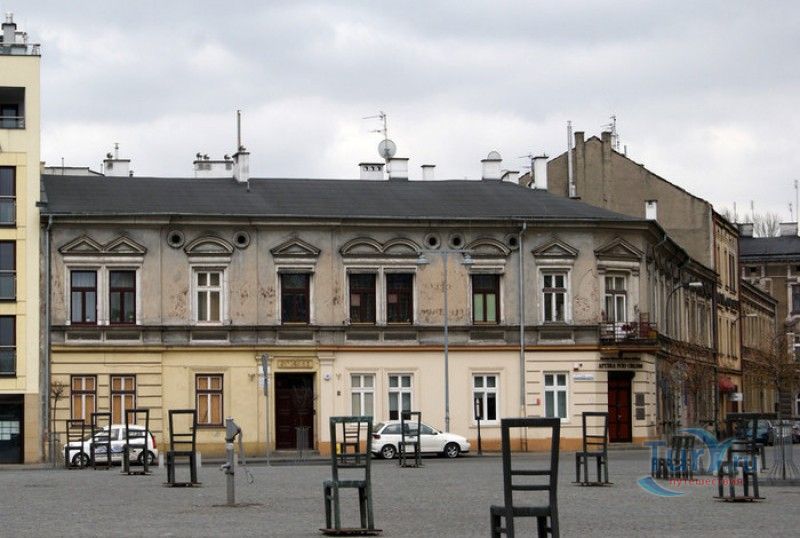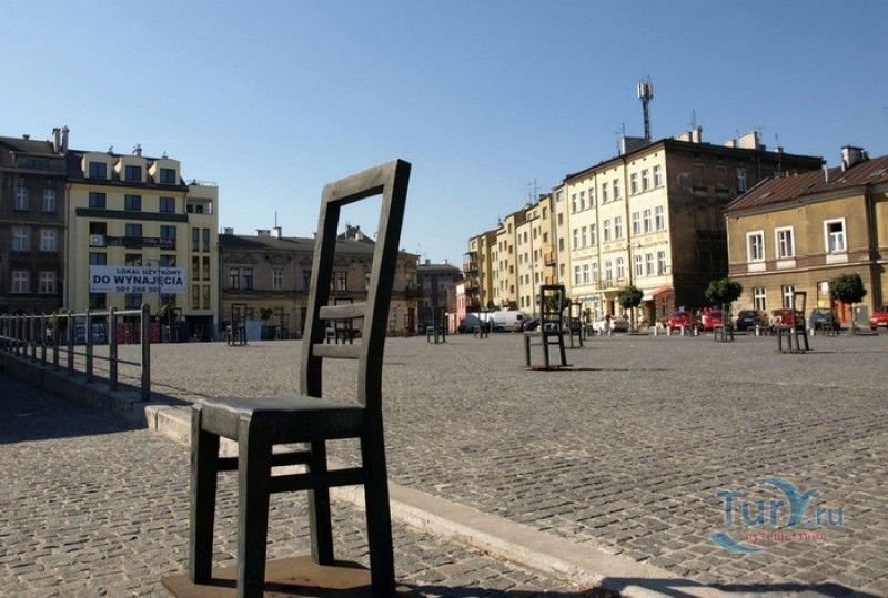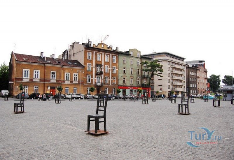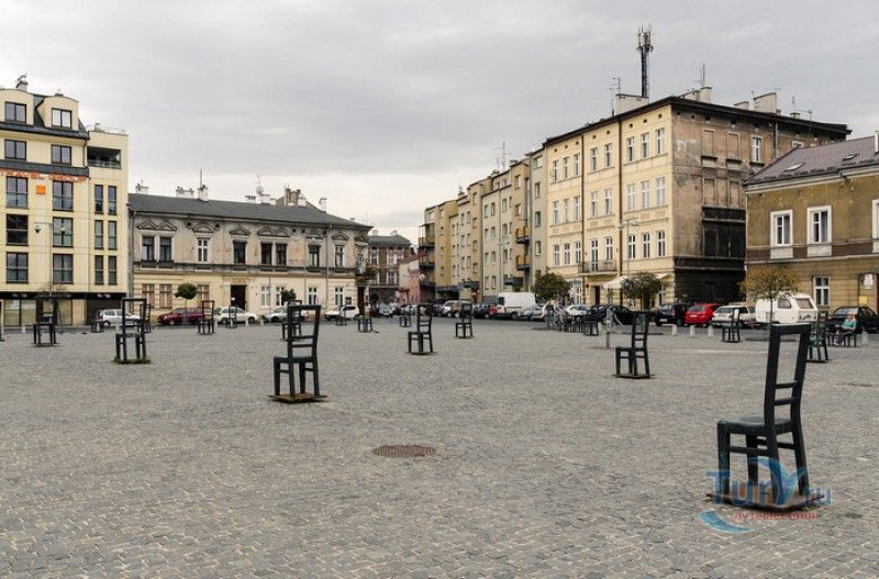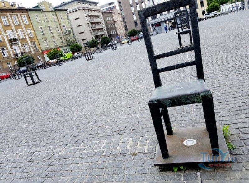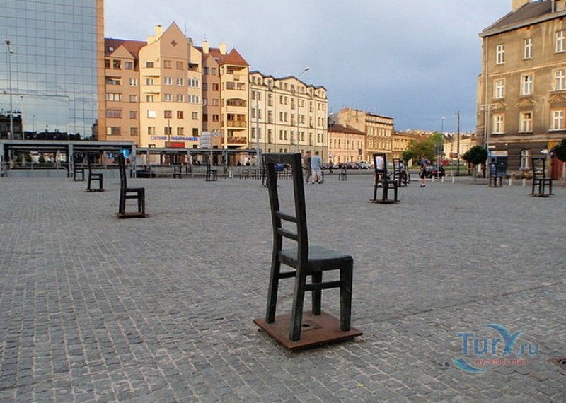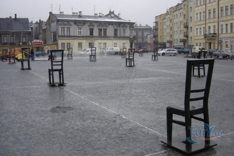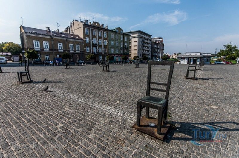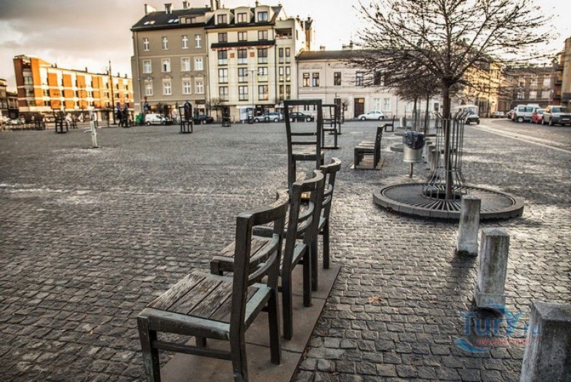 Мемориал Жертвам Краковского Гетто расположен в Кракове, на Площади Героев Гетто. В 1941-1943 годах в районе Подгуже, рядом с Площадью Согласия (с 2005 года - Площадь Героев Гетто) располагалось Краковское гетто, обнесённое трёхметровой бетонной стеной, выполненной в виде еврейских надгробий, выйти за пределы которой ни один живой "житель" еврейского квартала не мог. Перед началом Второй мировой войны в Кракове проживало более 64000 евреев (около 25% населения города), после отправки которых в начале войны в концентрационные лагеря, в городе оставалось не более 16000. Все евреи были согнаны в гетто, откуда их отправляли в концентрационные лагеря или в лагеря принудительного труда. Во время облав и транспортировки многие жители так называемого "Еврейского жилого района", прятавшиеся от фашистов или совершавшие попытку побега, расстреливались на месте. Среди сотен казнённых были художник Абрахам Ньюман и поэт Мордехай Гебиртиг. Фашисты не щадили стариков, детей и больных - все непригодные к работе и транспортировке были расстреляны. К 1942 году численность Краковских евреев снизилась в разы, гетто было разделено на две зоны, обнесенные колючей проволокой, - зона "А" предназначалась для тех, кто ещё был способен работать, зона "B" - для детей, престарелых и больных. В 1943 году всего за два дня (13 и 14 марта) гитлеровцы ликвидировали Краковское гетто - около 6000 евреев был отправлены в концентрационный лагерь в Плашове, а маленькие дети и их матери, больные и старики - расстреляны на плошали Согласия. Команды СС обшаривали здания на территории гетто, убивая всех, кто пытался спрятаться. В память об этих трагических событиях на месте Краковского гетто 8 декабря 2005 года был открыт Мемориал Жертвам Краковского Гетто. Он представляет собой ряды чугунных стульев, расположенных по периметру площади. Всего на площади установлено 70 стульев - 33 стула высотой 1,4 метра и 37 стульев высотой 1,2 метра. Эти стулья символизируют обезлюдевшие дома и улицы Краковского гетто, после ликвидации которого о жизни в еврейском квартале напоминала лишь валяющаяся на улицах мебель, выброшенная нацистами из квартир бывших жильцов, казнённых или угнанных в концлагеря. Здесь же, на площади, в доме №18 в те годы располагалась аптека "Под орлом", которой владел Тадеуш Панкевич - единственный поляк, живший на территории гетто. Панкевич был участником польского подполья и, рискуя собственной жизнью, помогал жителям гетто медикаментами. Сейчас здание бывшей аптеки занимает Музей Памяти.