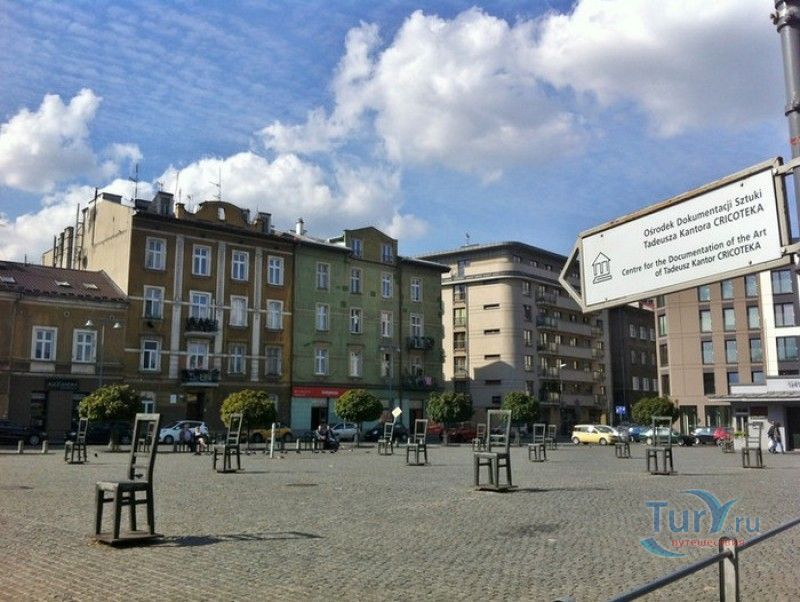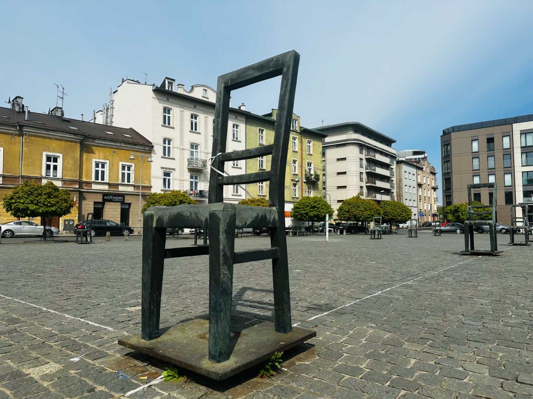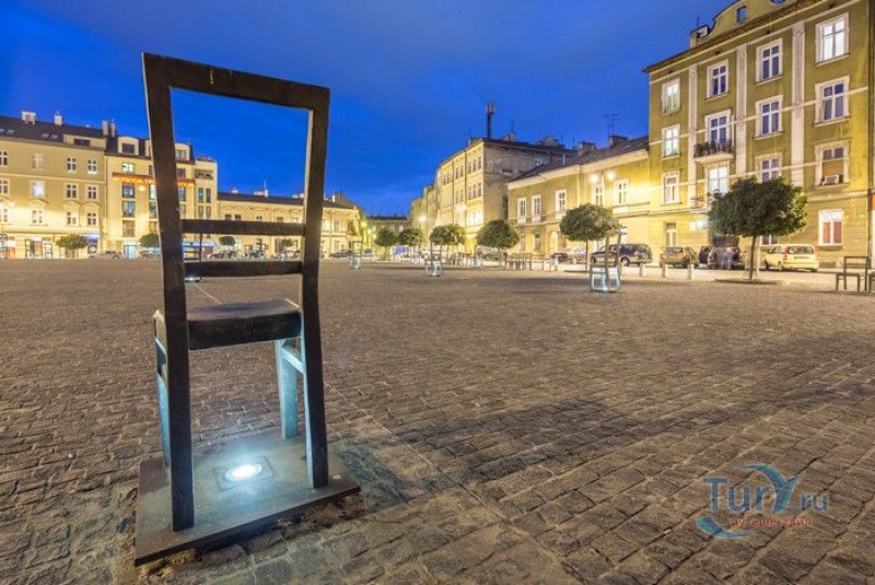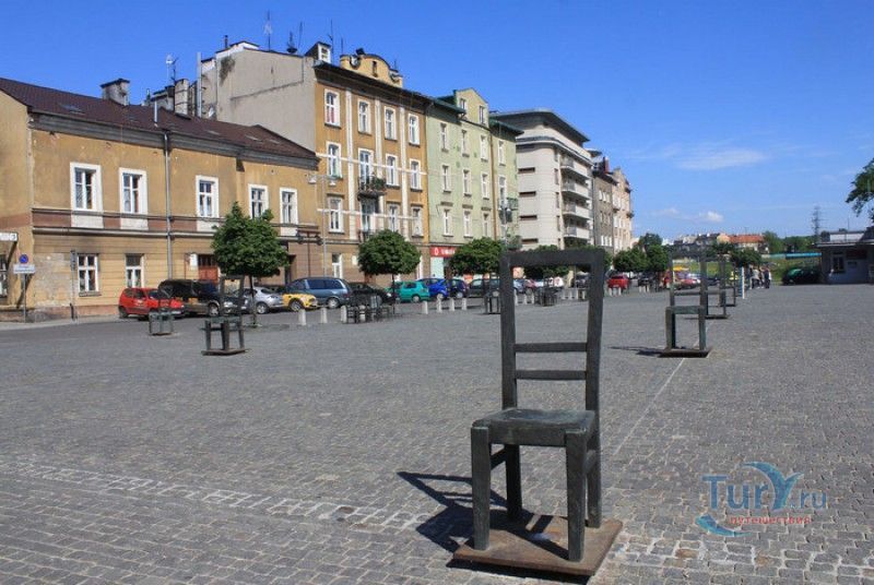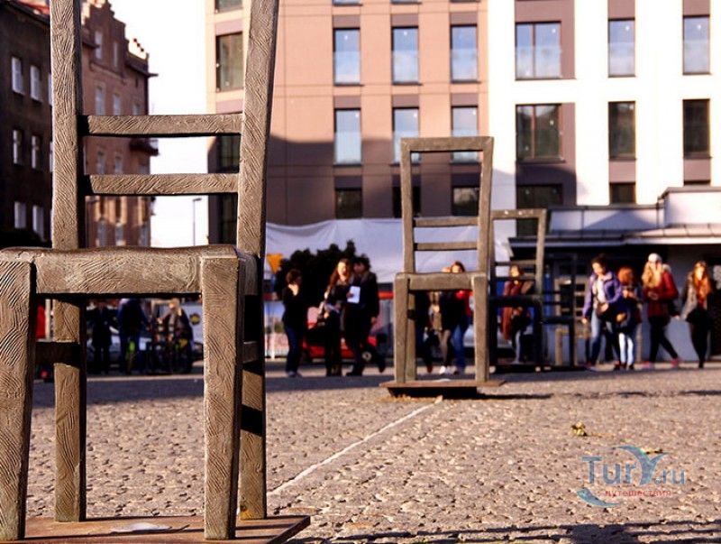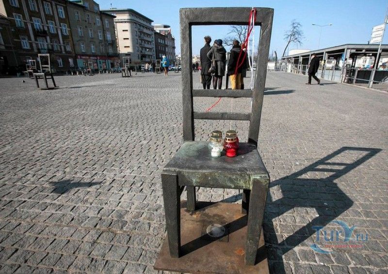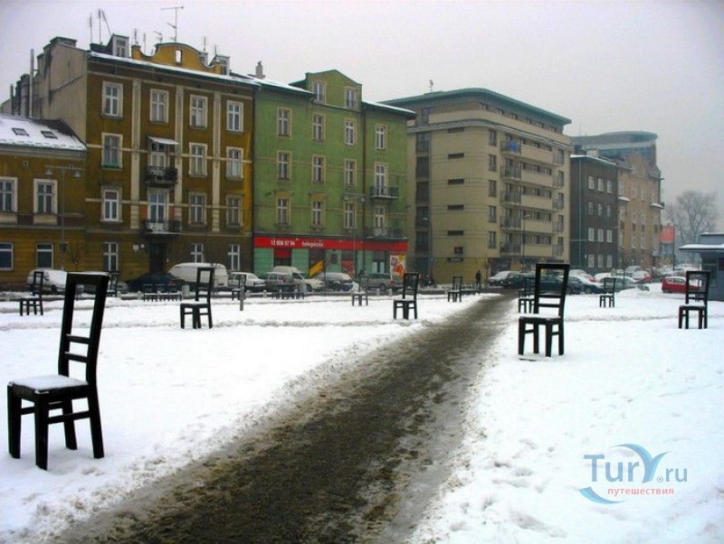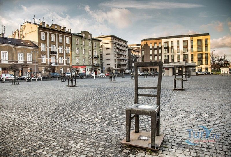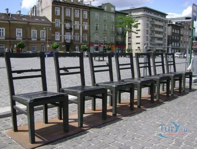 Мемориал Жертвам Краковского Гетто расположен в Кракове, на Площади Героев Гетто. В 1941-1943 годах в районе Подгуже, рядом с Площадью Согласия (с 2005 года - Площадь Героев Гетто) располагалось Краковское гетто, обнесённое трёхметровой бетонной стеной, выполненной в виде еврейских надгробий, выйти за пределы которой ни один живой "житель" еврейского квартала не мог. Перед началом Второй мировой войны в Кракове проживало более 64000 евреев (около 25% населения города), после отправки которых в начале войны в концентрационные лагеря, в городе оставалось не более 16000. Все евреи были согнаны в гетто, откуда их отправляли в концентрационные лагеря или в лагеря принудительного труда. Во время облав и транспортировки многие жители так называемого "Еврейского жилого района", прятавшиеся от фашистов или совершавшие попытку побега, расстреливались на месте. Среди сотен казнённых были художник Абрахам Ньюман и поэт Мордехай Гебиртиг. Фашисты не щадили стариков, детей и больных - все непригодные к работе и транспортировке были расстреляны. К 1942 году численность Краковских евреев снизилась в разы, гетто было разделено на две зоны, обнесенные колючей проволокой, - зона "А" предназначалась для тех, кто ещё был способен работать, зона "B" - для детей, престарелых и больных. В 1943 году всего за два дня (13 и 14 марта) гитлеровцы ликвидировали Краковское гетто - около 6000 евреев был отправлены в концентрационный лагерь в Плашове, а маленькие дети и их матери, больные и старики - расстреляны на плошали Согласия. Команды СС обшаривали здания на территории гетто, убивая всех, кто пытался спрятаться. В память об этих трагических событиях на месте Краковского гетто 8 декабря 2005 года был открыт Мемориал Жертвам Краковского Гетто. Он представляет собой ряды чугунных стульев, расположенных по периметру площади. Всего на площади установлено 70 стульев - 33 стула высотой 1,4 метра и 37 стульев высотой 1,2 метра. Эти стулья символизируют обезлюдевшие дома и улицы Краковского гетто, после ликвидации которого о жизни в еврейском квартале напоминала лишь валяющаяся на улицах мебель, выброшенная нацистами из квартир бывших жильцов, казнённых или угнанных в концлагеря. Здесь же, на площади, в доме №18 в те годы располагалась аптека "Под орлом", которой владел Тадеуш Панкевич - единственный поляк, живший на территории гетто. Панкевич был участником польского подполья и, рискуя собственной жизнью, помогал жителям гетто медикаментами. Сейчас здание бывшей аптеки занимает Музей Памяти.