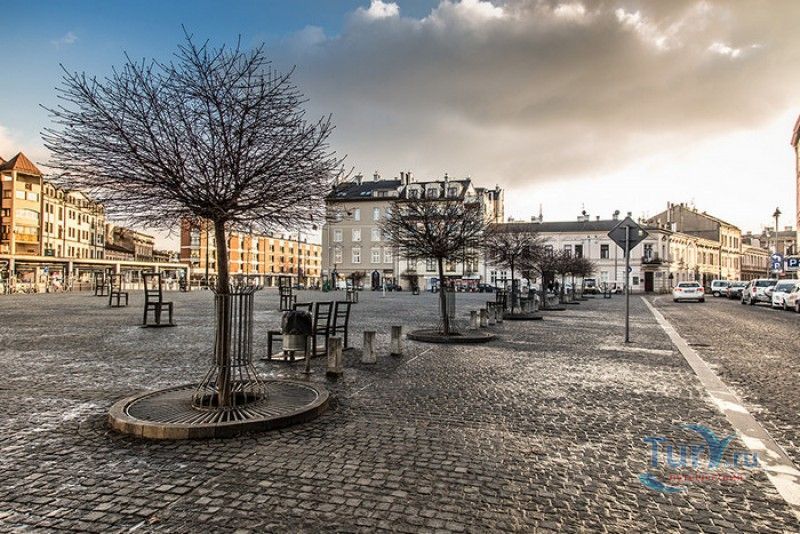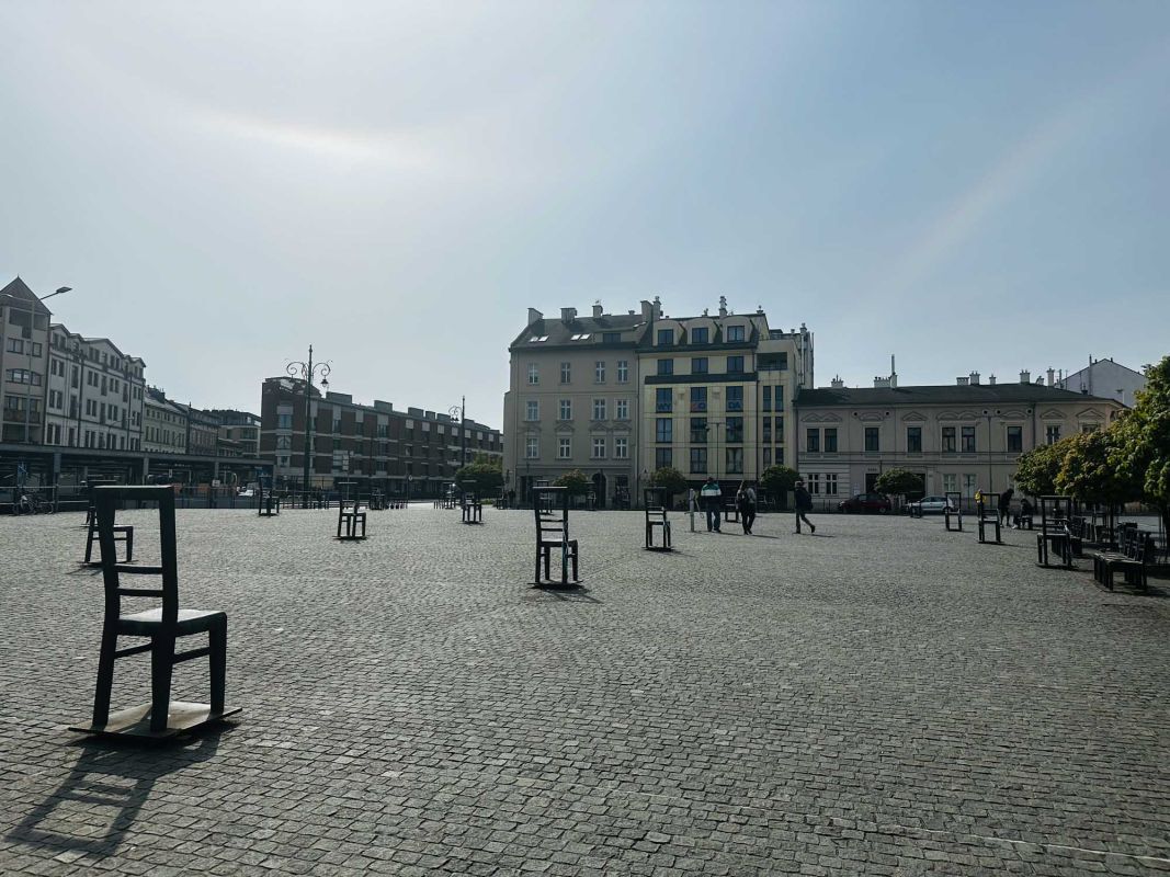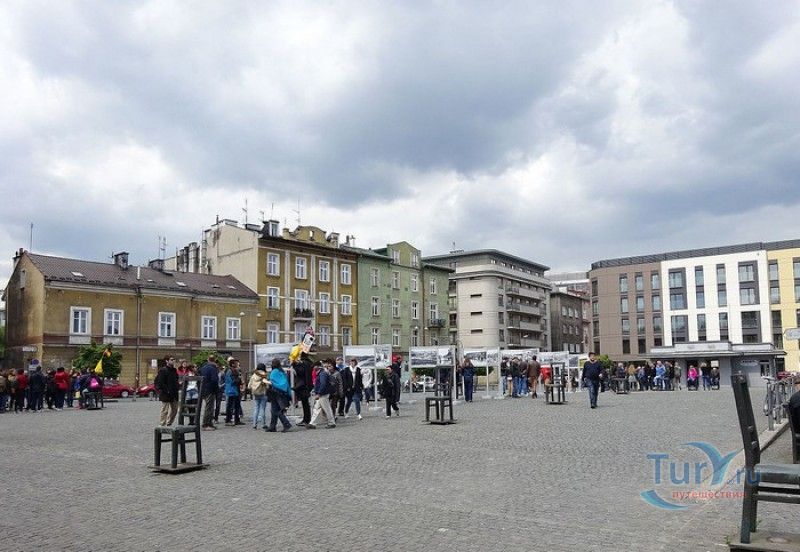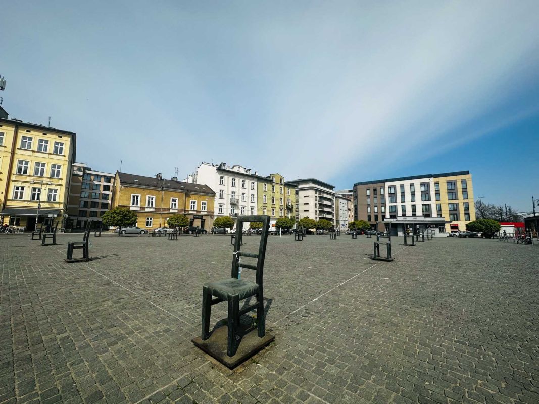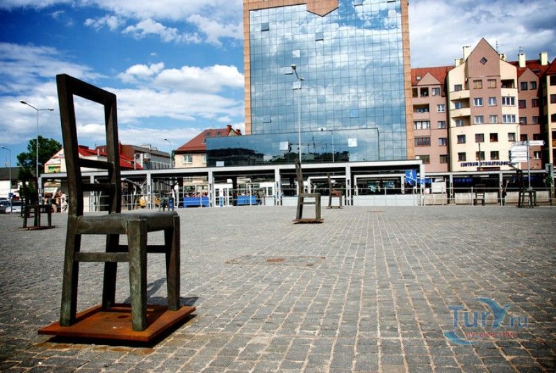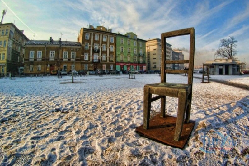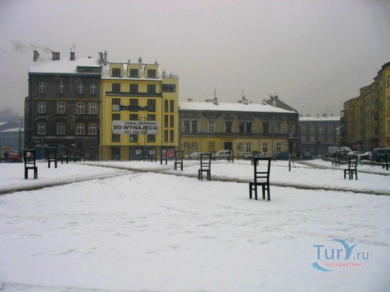 Мемориал Жертвам Краковского Гетто расположен в Кракове, на Площади Героев Гетто. В 1941-1943 годах в районе Подгуже, рядом с Площадью Согласия (с 2005 года - Площадь Героев Гетто) располагалось Краковское гетто, обнесённое трёхметровой бетонной стеной, выполненной в виде еврейских надгробий, выйти за пределы которой ни один живой "житель" еврейского квартала не мог. Перед началом Второй мировой войны в Кракове проживало более 64000 евреев (около 25% населения города), после отправки которых в начале войны в концентрационные лагеря, в городе оставалось не более 16000. Все евреи были согнаны в гетто, откуда их отправляли в концентрационные лагеря или в лагеря принудительного труда. Во время облав и транспортировки многие жители так называемого "Еврейского жилого района", прятавшиеся от фашистов или совершавшие попытку побега, расстреливались на месте. Среди сотен казнённых были художник Абрахам Ньюман и поэт Мордехай Гебиртиг. Фашисты не щадили стариков, детей и больных - все непригодные к работе и транспортировке были расстреляны. К 1942 году численность Краковских евреев снизилась в разы, гетто было разделено на две зоны, обнесенные колючей проволокой, - зона "А" предназначалась для тех, кто ещё был способен работать, зона "B" - для детей, престарелых и больных. В 1943 году всего за два дня (13 и 14 марта) гитлеровцы ликвидировали Краковское гетто - около 6000 евреев был отправлены в концентрационный лагерь в Плашове, а маленькие дети и их матери, больные и старики - расстреляны на плошали Согласия. Команды СС обшаривали здания на территории гетто, убивая всех, кто пытался спрятаться. В память об этих трагических событиях на месте Краковского гетто 8 декабря 2005 года был открыт Мемориал Жертвам Краковского Гетто. Он представляет собой ряды чугунных стульев, расположенных по периметру площади. Всего на площади установлено 70 стульев - 33 стула высотой 1,4 метра и 37 стульев высотой 1,2 метра. Эти стулья символизируют обезлюдевшие дома и улицы Краковского гетто, после ликвидации которого о жизни в еврейском квартале напоминала лишь валяющаяся на улицах мебель, выброшенная нацистами из квартир бывших жильцов, казнённых или угнанных в концлагеря. Здесь же, на площади, в доме №18 в те годы располагалась аптека "Под орлом", которой владел Тадеуш Панкевич - единственный поляк, живший на территории гетто. Панкевич был участником польского подполья и, рискуя собственной жизнью, помогал жителям гетто медикаментами. Сейчас здание бывшей аптеки занимает Музей Памяти.