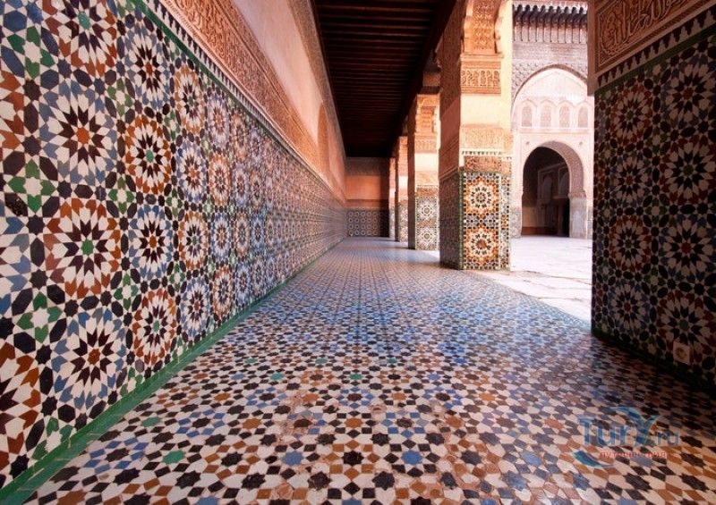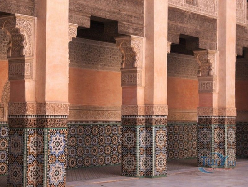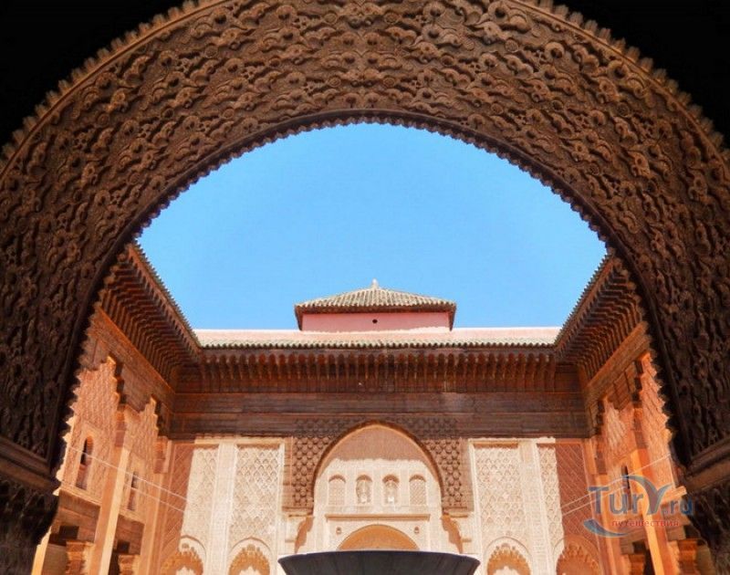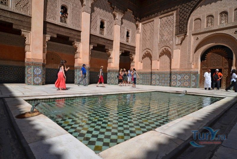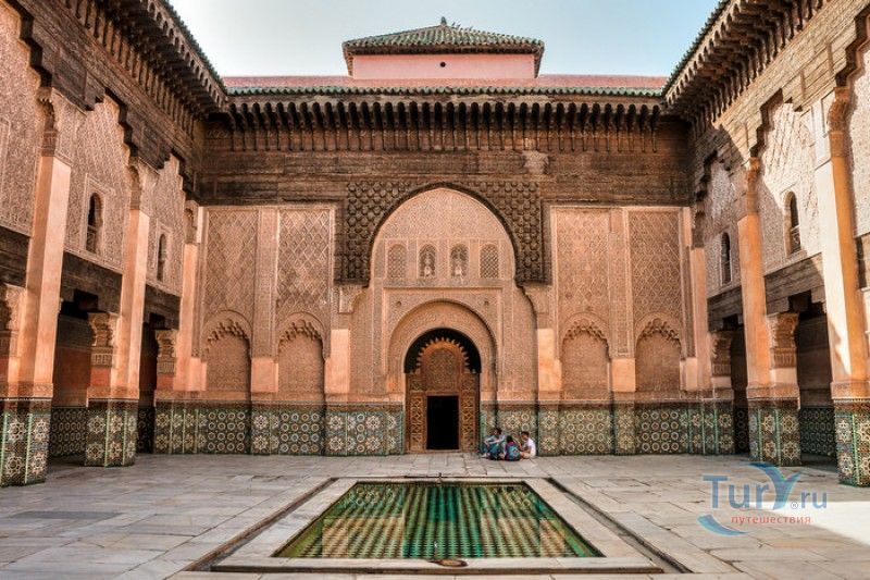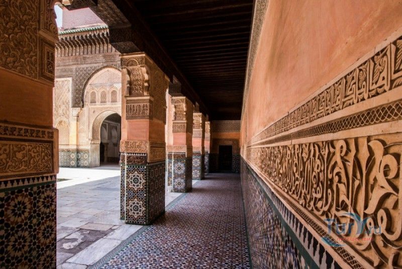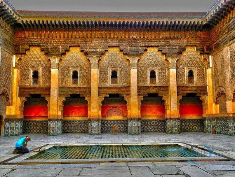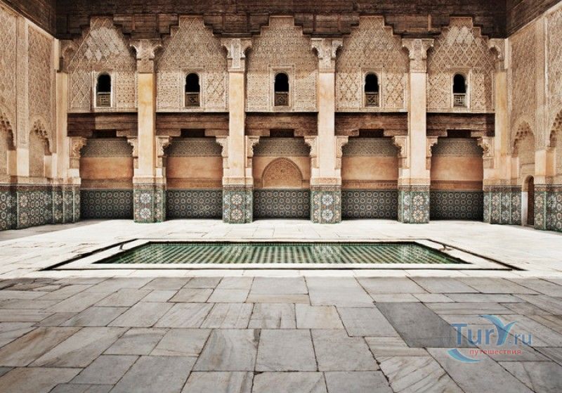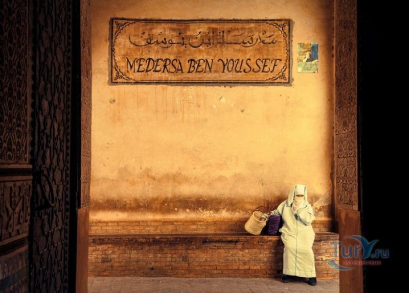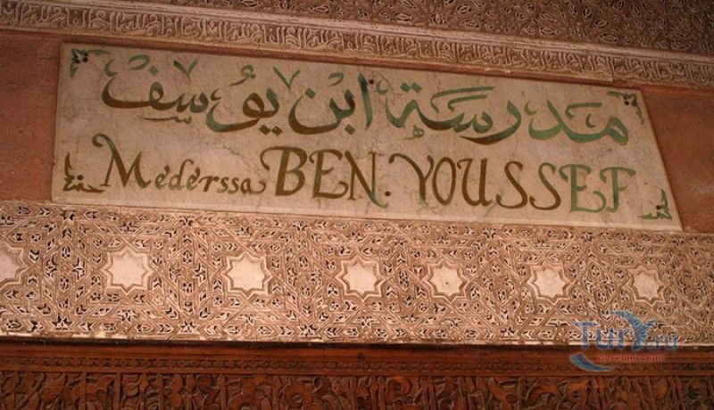 Медресе Бен Юсефа - бывшая кораническая школа, одна из крупнейших в Марокко и всей Северной Африке, расположена в самом центре Медины Марракеша. Медресе была основана в XIV веке султаном Абуль-Хасаном Али I из берберской династии Маринидов, правящей в то время в Марокко. В 1570 году медресе было перестроено и значительно расширено султаном Абдаллахом I аль-Галибом из династии Саадитов. В течение четырёх столетий медресе, названное в честь эмира Альморавидов Али Ибн Юсуфа (Бен Юсефа), являлось духовным религиозным центром Марокко и пользовалось огромным авторитетом среди почитателей ислама. Вплоть до 1960 года в медресе изучали Коран и получали знания в различных областях науки одновременно около 900 студентов, в 1960 году учебное заведение закрылось, а спустя 22 года, в 1982 году, открылось в качестве музея. Общая площадь сооружения - 1680 квадратных метров, здание медресе расположено вокруг центрального двора квадратной формы, в центре которого находится прямоугольный бассейн для омовений. С трёх сторон двор окружён двухъярусными крытыми арочными галереями, деревянные своды которых поддерживают ряды мощных колонн. Из центрального двора можно попасть в большой молитвенный зал, состоящий из трёх проходов, разделённых мраморными колоннами, поддерживающих резной деревянный потолок. В молитвенном зале находится михраб (ниша в стене), указывающий направление на Мекку. На первом и втором этажах медресе расположены 132 худжры (жилые комнаты для студентов), сосредоточенные вокруг семи небольших внутренних двориков, связанных между собой длинными коридорами. Медресе Бен Юсефа построено в мавританском архитектурном стиле, при строительстве использовались мрамор, привезенный из Италии, камень, добываемый в Атласских горах, расположенных на Атлантическом побережье Марокко, и древесина кедра. Фасады и внутренние помещения отделаны декоративной штукатуркой (лепнина, декоративный орнамент, резные бордюры и панели), внутренний двор выложен плитами из белого мрамора, стены, колонны и пол галерей и внутренних помещений оформлены мозаичной плиткой с цветочными и геометрическими узорами, окна - ажурными металлическими и лепными решётками. Медресе Бен Юсефа, сохранившееся до наших дней в своём первозданном виде, является одним из самых значимых исторических и архитектурных памятников Марокко, который ежегодно посещают тысячи иностранных туристов, приезжающих в Марракеш.