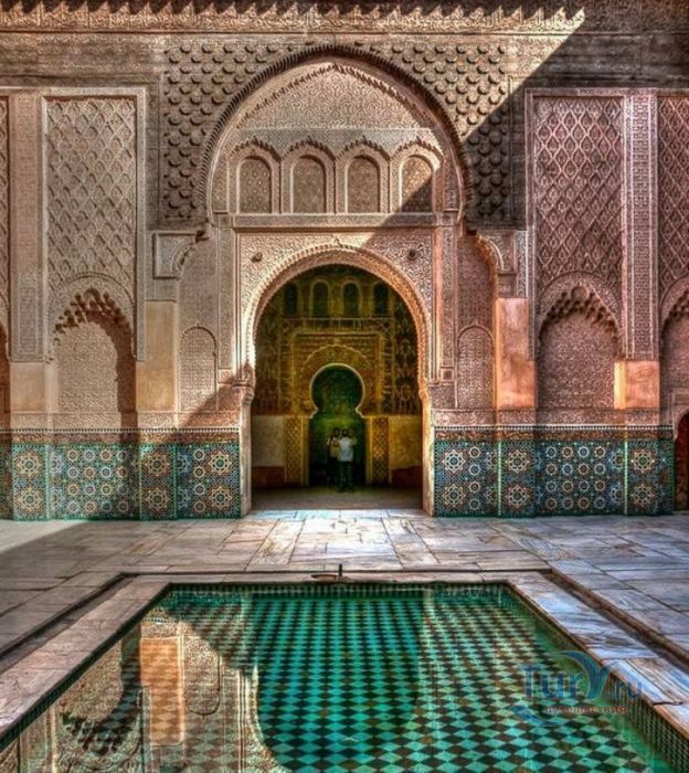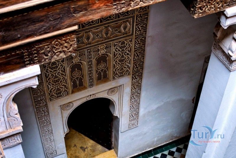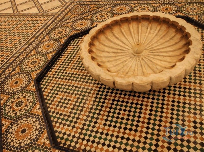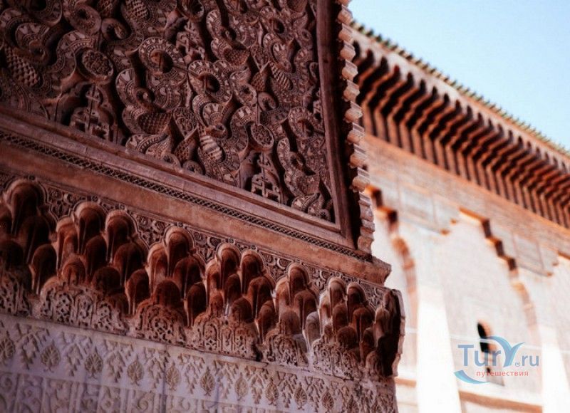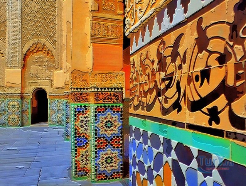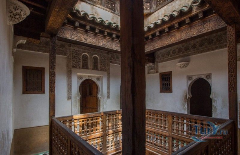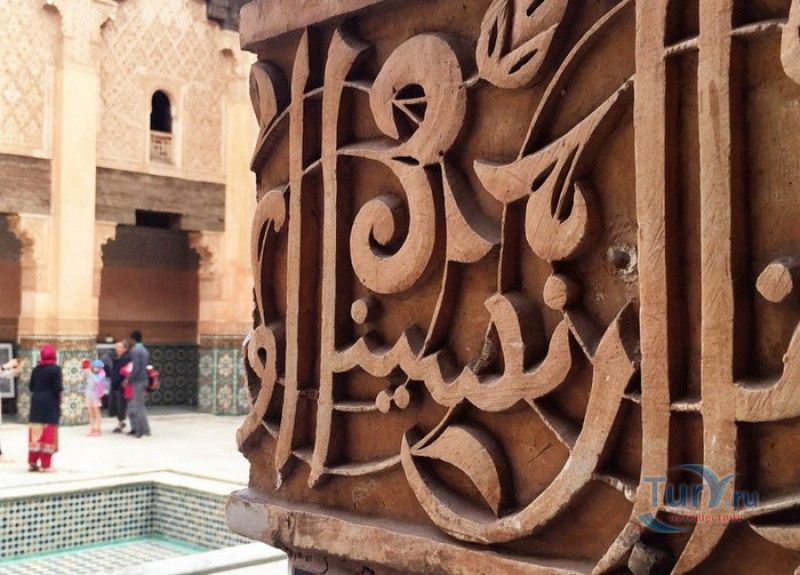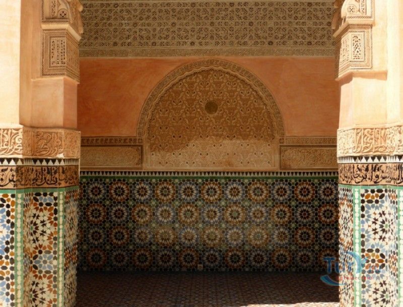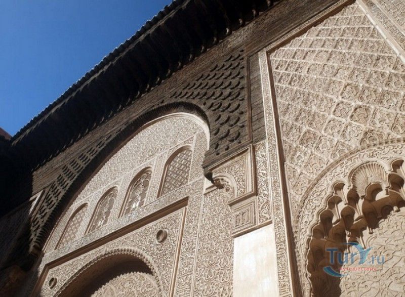 Медресе Бен Юсефа - бывшая кораническая школа, одна из крупнейших в Марокко и всей Северной Африке, расположена в самом центре Медины Марракеша. Медресе была основана в XIV веке султаном Абуль-Хасаном Али I из берберской династии Маринидов, правящей в то время в Марокко. В 1570 году медресе было перестроено и значительно расширено султаном Абдаллахом I аль-Галибом из династии Саадитов. В течение четырёх столетий медресе, названное в честь эмира Альморавидов Али Ибн Юсуфа (Бен Юсефа), являлось духовным религиозным центром Марокко и пользовалось огромным авторитетом среди почитателей ислама. Вплоть до 1960 года в медресе изучали Коран и получали знания в различных областях науки одновременно около 900 студентов, в 1960 году учебное заведение закрылось, а спустя 22 года, в 1982 году, открылось в качестве музея. Общая площадь сооружения - 1680 квадратных метров, здание медресе расположено вокруг центрального двора квадратной формы, в центре которого находится прямоугольный бассейн для омовений. С трёх сторон двор окружён двухъярусными крытыми арочными галереями, деревянные своды которых поддерживают ряды мощных колонн. Из центрального двора можно попасть в большой молитвенный зал, состоящий из трёх проходов, разделённых мраморными колоннами, поддерживающих резной деревянный потолок. В молитвенном зале находится михраб (ниша в стене), указывающий направление на Мекку. На первом и втором этажах медресе расположены 132 худжры (жилые комнаты для студентов), сосредоточенные вокруг семи небольших внутренних двориков, связанных между собой длинными коридорами. Медресе Бен Юсефа построено в мавританском архитектурном стиле, при строительстве использовались мрамор, привезенный из Италии, камень, добываемый в Атласских горах, расположенных на Атлантическом побережье Марокко, и древесина кедра. Фасады и внутренние помещения отделаны декоративной штукатуркой (лепнина, декоративный орнамент, резные бордюры и панели), внутренний двор выложен плитами из белого мрамора, стены, колонны и пол галерей и внутренних помещений оформлены мозаичной плиткой с цветочными и геометрическими узорами, окна - ажурными металлическими и лепными решётками. Медресе Бен Юсефа, сохранившееся до наших дней в своём первозданном виде, является одним из самых значимых исторических и архитектурных памятников Марокко, который ежегодно посещают тысячи иностранных туристов, приезжающих в Марракеш.