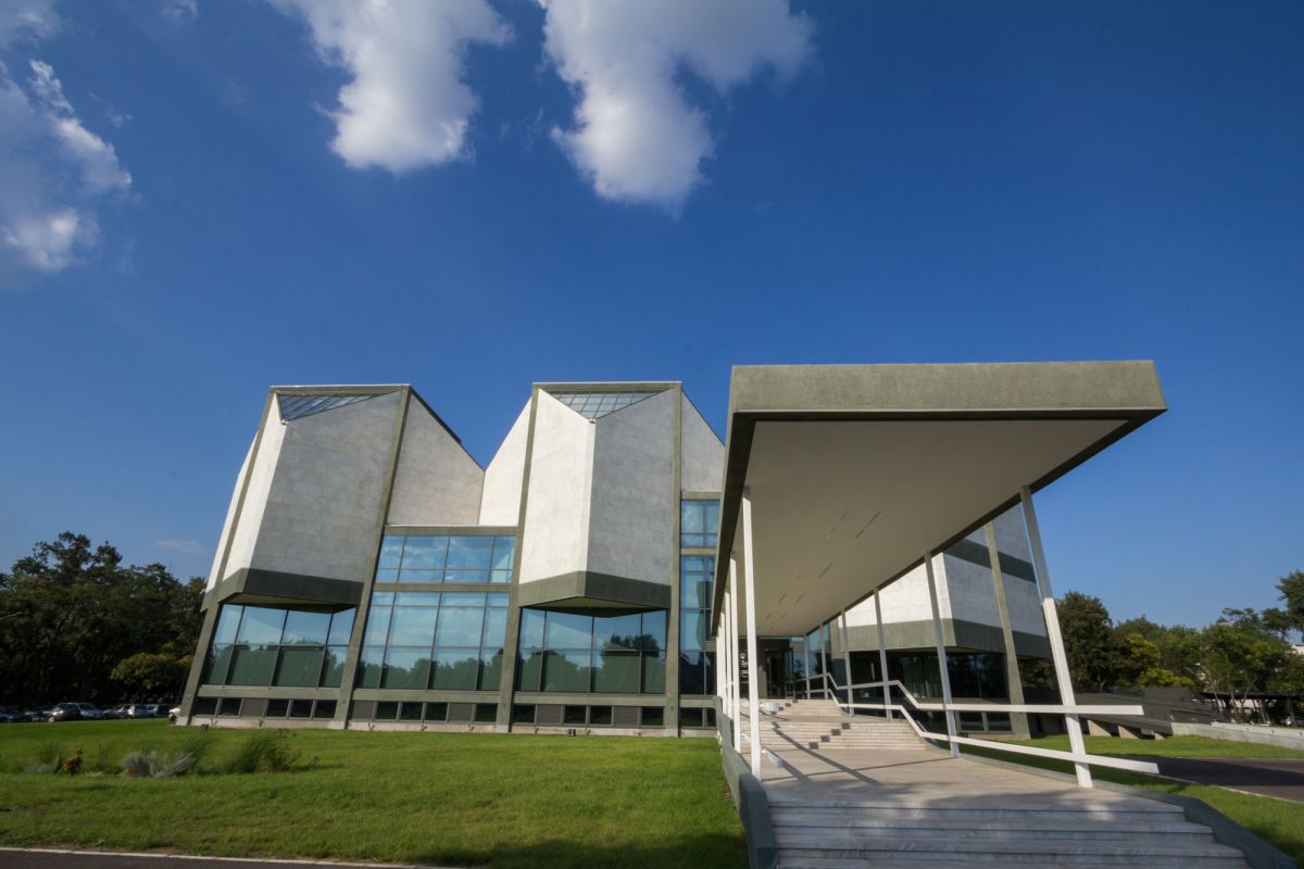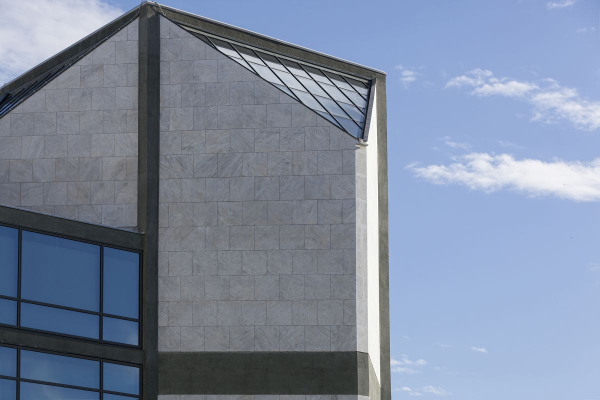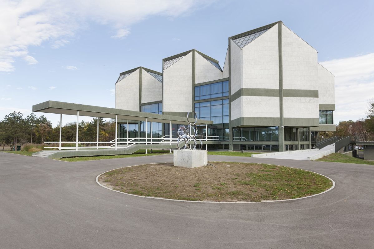 Основной объем здания представляет собой единый полиморфный кристалл, состоящий из шести кубов усеченных углов. Стены облицованы белыми мраморными плитами, частично из стекла, а скатные поверхности крыши покрыты стеклом. Интерьер отличается функциональностью и пространственным разнообразием. Уникальное, но особенно сложное внутреннее пространство без вертикальных перегородок и коридоров разделено на пять выставочных уровней, соединенных лестницей. Эти практически сливающиеся друг с другом уровни удачно объединили пространства разной высоты в единое целое. Таким образом, можно просматривать экспонаты на более низких уровнях с более высоких уровней, под разными углами, а посетитель может без усталости дойти до самых высоких уровней. Общая площадь салона составляет 5055 м2. Первый этаж находится на высоте 1,80 м от уровня земли, а второй - на высоте 3,90 м. Второй и третий уровни имеют перепад высот 2,34 м и 1,56 м. Самый высокий уровень - 10,14 м от земли.