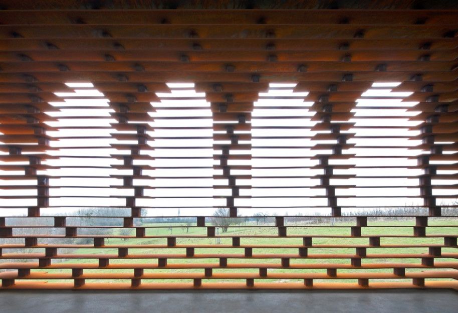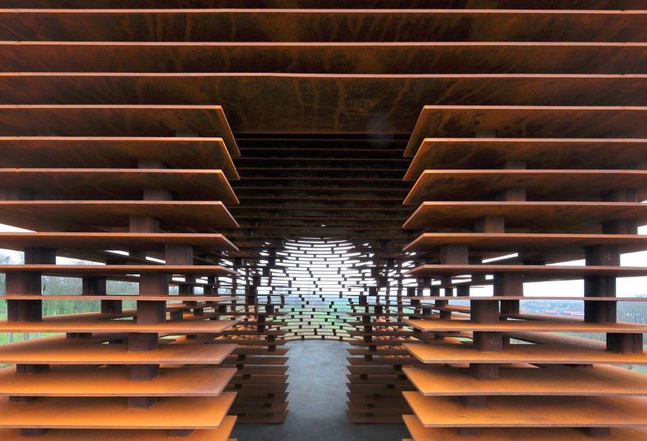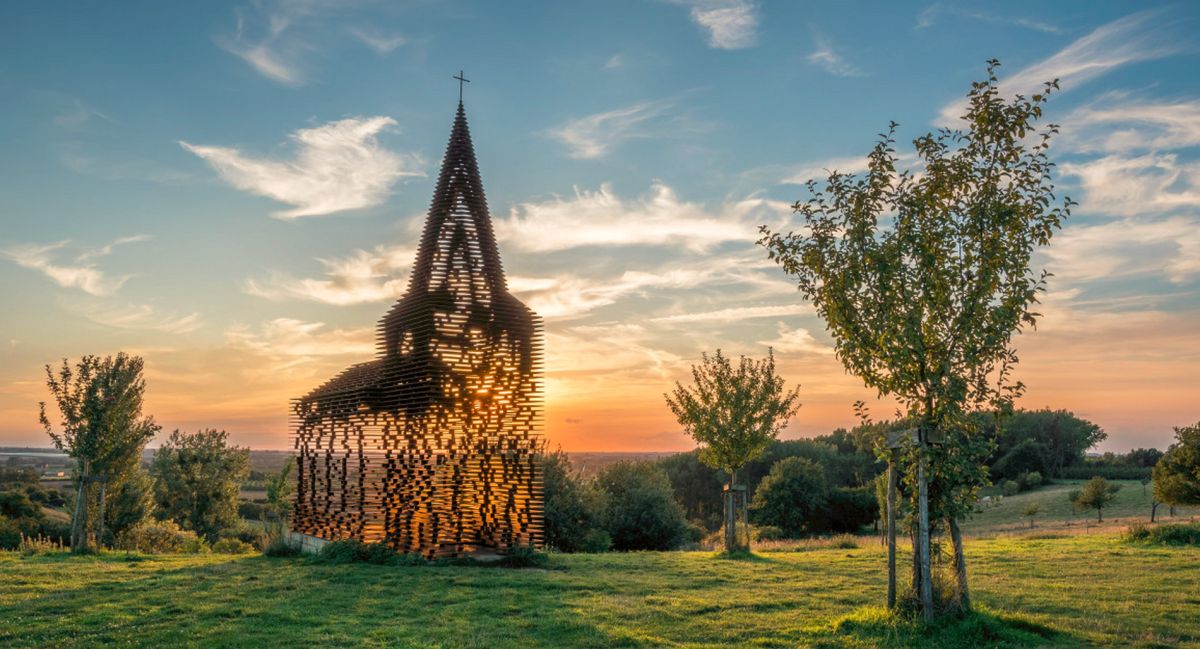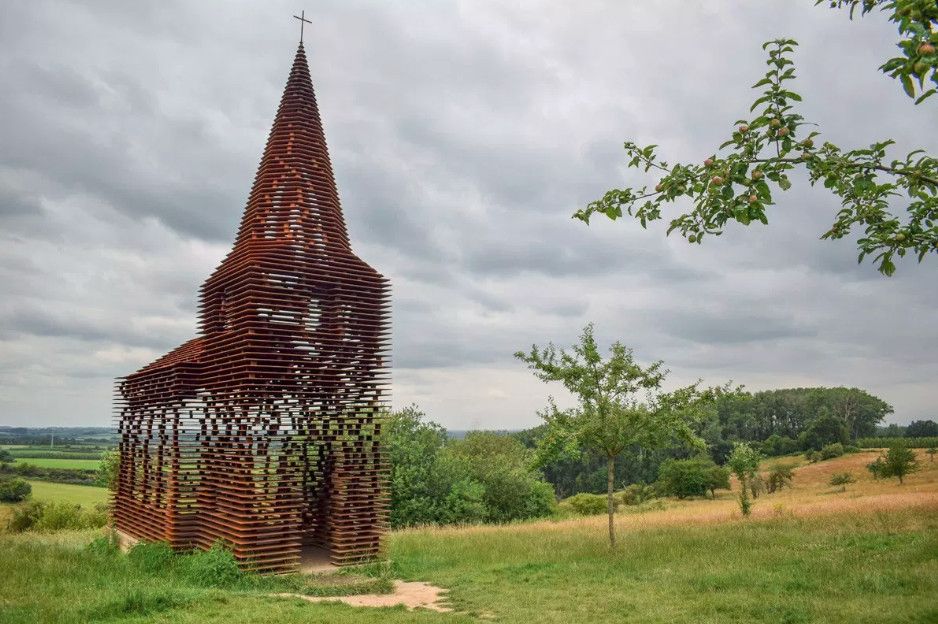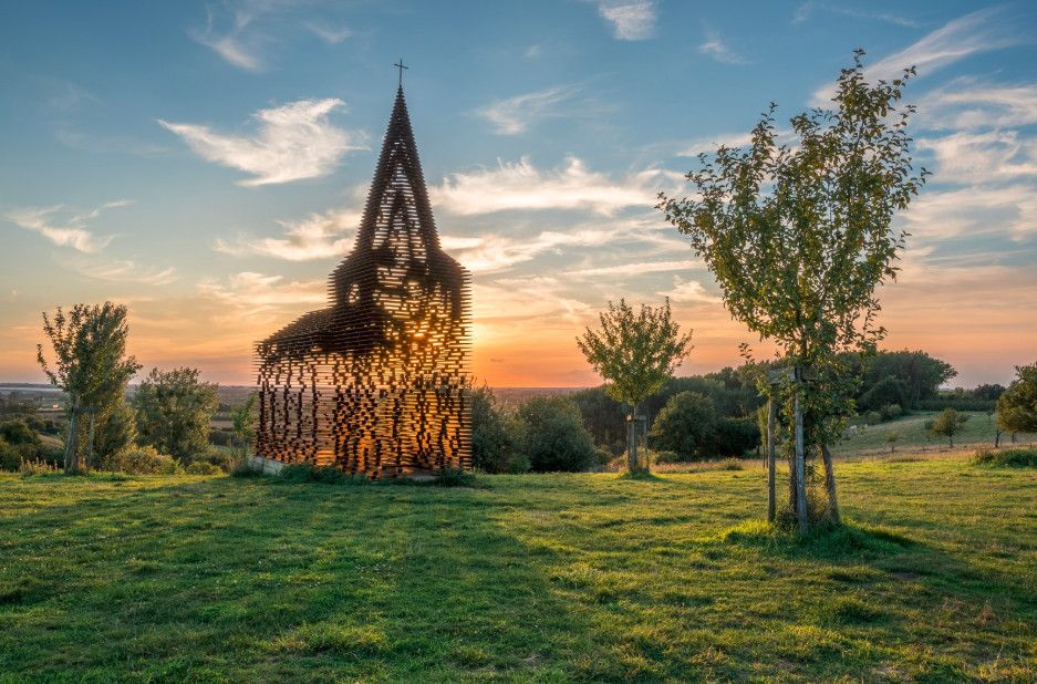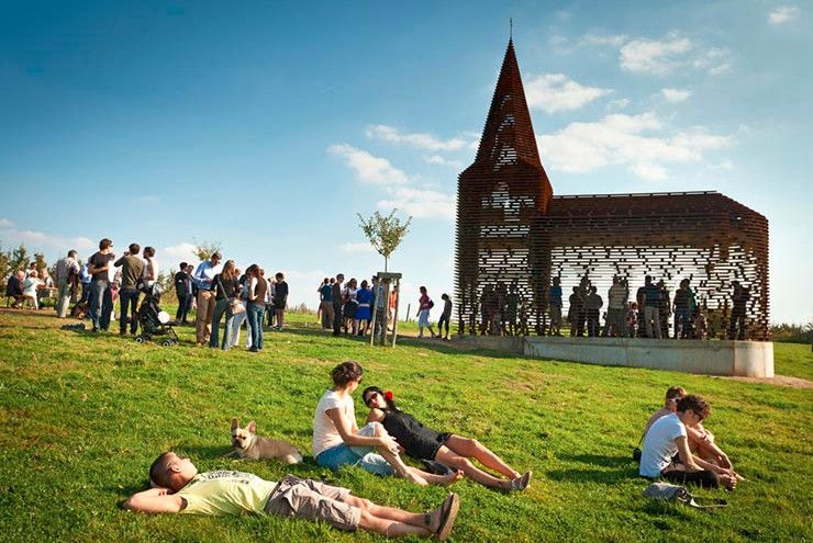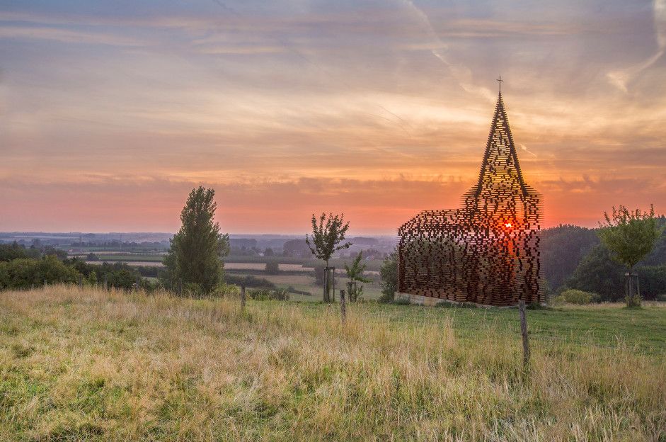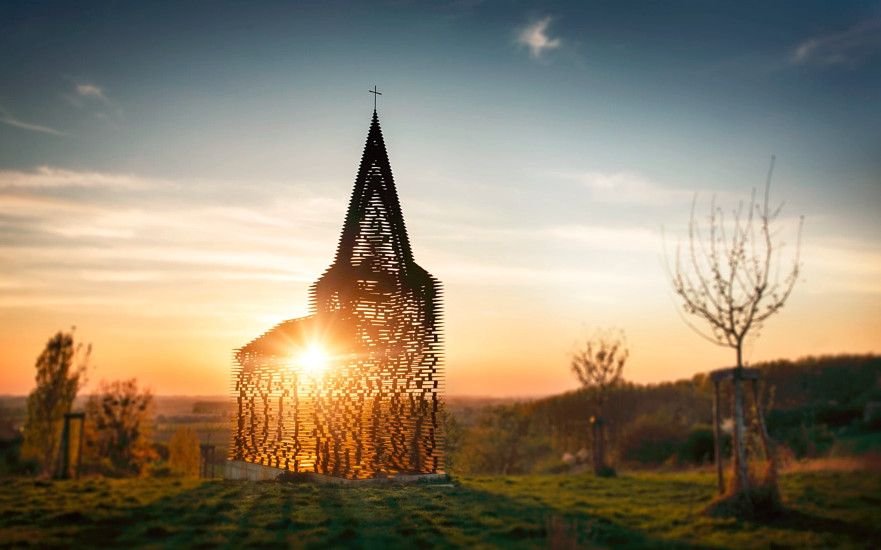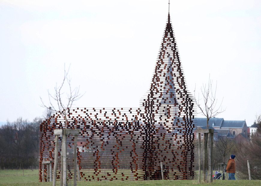 Арт-объект "Читая между строк", известный также под названием "Прозрачная церковь", является проектом студии Gijs Van Vaerenbergh - тандема двух молодых бельгийских архитекторов Петерьяна Гийса и Арноута Ван Ваеренберга. Прозрачная церковь расположена посреди сельского ландшафта, в окрестностях бельгийского города Борглоон, в провинции Лимбур. Необычная "церковь" появилась здесь в 2011 году в рамках художественного проекта Z-OUT ("Искусство в открытом пространстве"). Архитектурная конструкция с одного ракурса выглядит как традиционная католическая церковь с остроконечным куполом и монолитными стенами, с другого - словно растворяется в воздухе, становясь прозрачной и сливаясь с окружающим её ландшафтом. Этот необычный эффект был достигнут архитекторами благодаря использованию нетрадиционных стройматериалов - десятиметровая конструкция состоит из ста горизонтальных слоёв стальных пластин и двух тысяч стальных столбцов, с помощью которых пластины крепятся. Вся конструкция весит 30 тонн, но впечатление создаётся, что церковь воздушна и невесома. Зайдя внутрь сооружения, можно в буквальном смысле увидеть окружающий пейзаж сквозь стены сооружения. Ещё один потрясающий эффект, который можно наблюдать, находясь внутри "церкви", - это игра света и теней, при чём освещение внутреннего пространства церкви меняется в зависимости от положения Солнца и направления солнечного света в разное время суток. Особенно красиво это выглядит в утренние и вечерние часы.