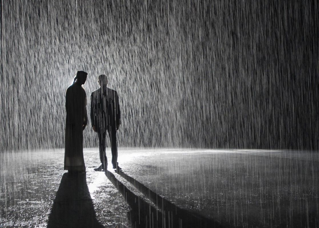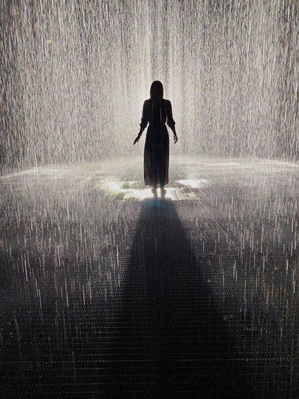 Заходя в неосвещенное пространство комнаты, посетители слышат звуки падающего дождя и интуитивно пытаются спрятаться от него. Но они не намокнут: специальные датчики реагируют на каждое движение человека и останавливают воду в том месте, где он оказывается. В комнате дождя постоянно циркулирует 1200 литров чистой воды.