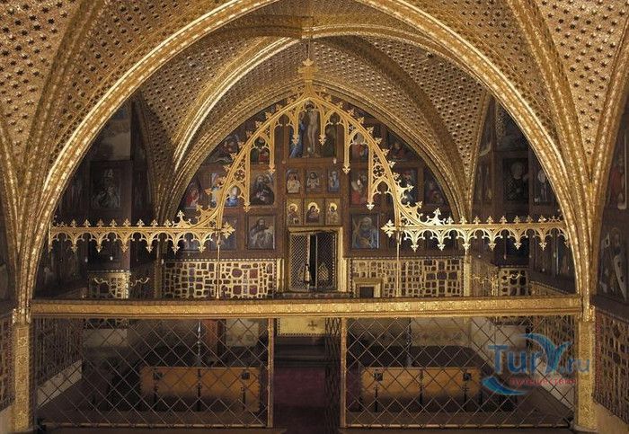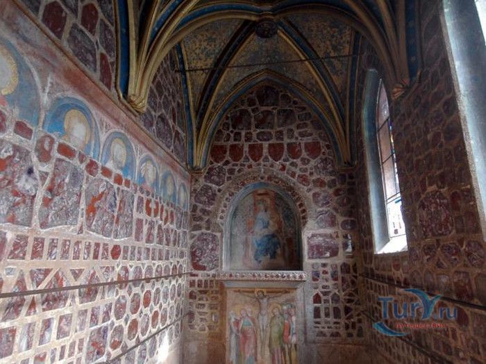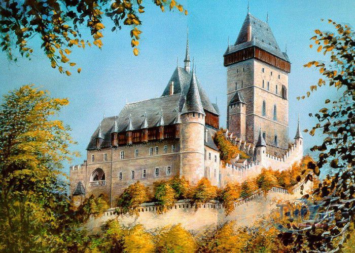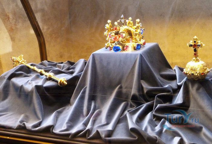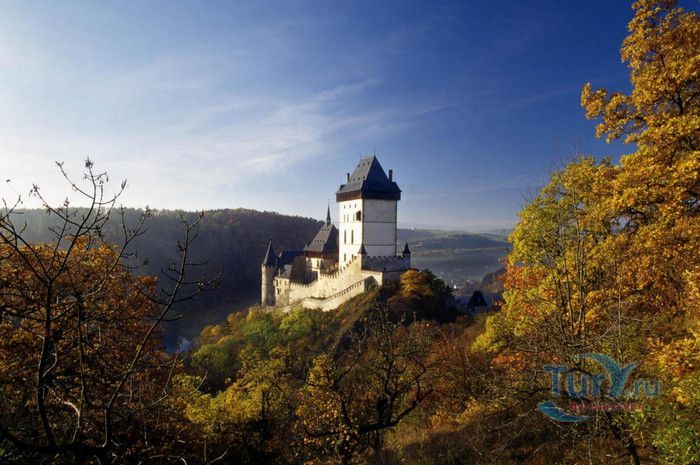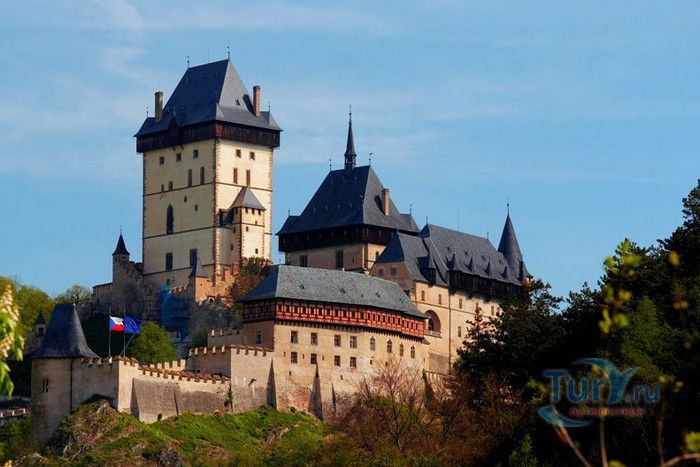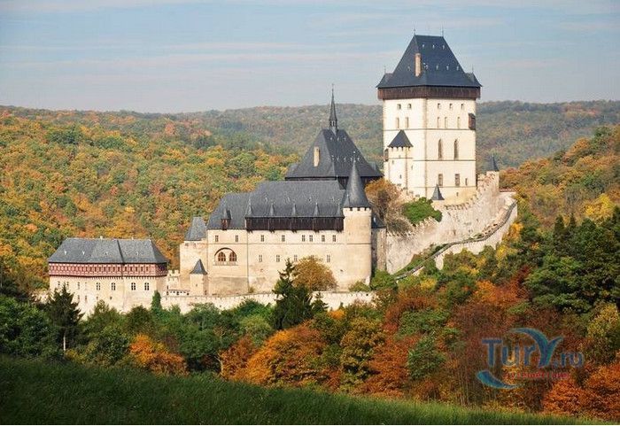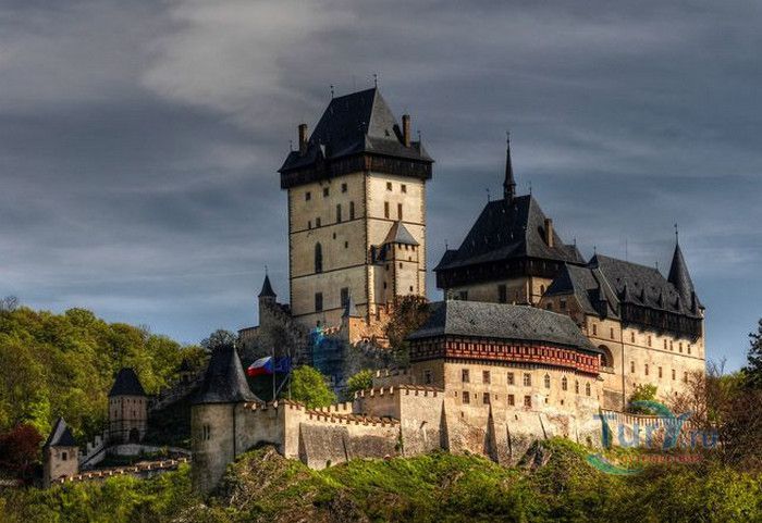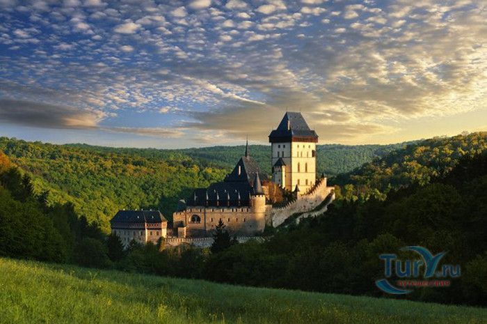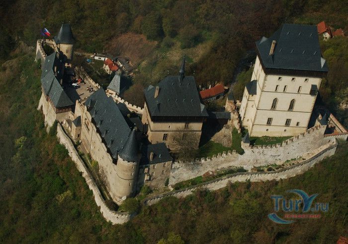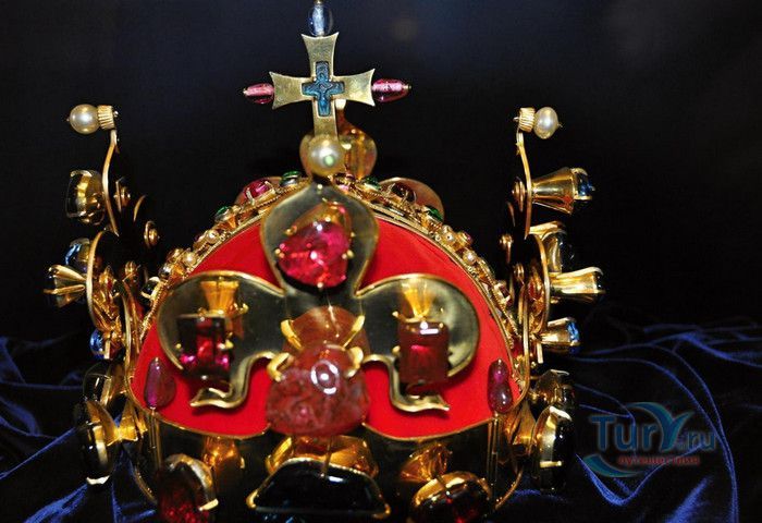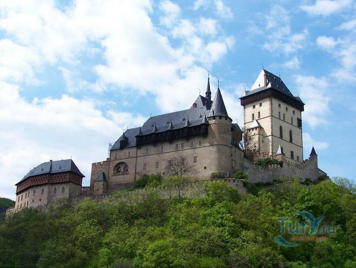 Замок Карлштейн был назван в честь его основателя Карла IV, чешского и немецкого короля, императора римского, и до сих пор занимает среди Чешских замков исключительное положение. Изначально замок строился для управления имением и как королевская резиденция, но очень скоро на него была возложена дополнительная функция – он был предназначен для хранения реликвий, включая императорские коронационные регалии. Строительство замка входило в широкие культурные и политические замыслы Карла IV, связанные с возвышением чешского королевства, которые он начал осуществлять в 1348 году. Первый камень в фундамент замка Карлштейна заложил близкий друг и советник Карла IV пражский архиепископ Арношт из Пардубиц. Воспитанный в духе религиозности и уважении к святым, Карл IV стремился сосредоточить в Карлштейне редчайшие реликвии, которые ему удалось приобрести в период своего правления. Замок Карлштейн исключителен не только самой целью его основания, но и оригинальностью архитектурного решения его постройки. В его основу был заложен принцип ступенчатого расположения зданий входящих в архитектурный ансамбль замка. Начиная от колодезной башни, каждое последующее сооружений возвышается над предыдущим, а вершину этого ансамбля знаменует Большая башня, в которой расположена капелла св.Креста. Именно здесь был помещён набор реликвий, включая имперские коронационные регалии. Ступенчатая схема композиции замка исходила из символизма Святой горы в Иерусалиме.