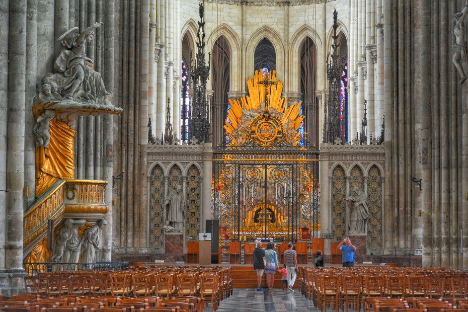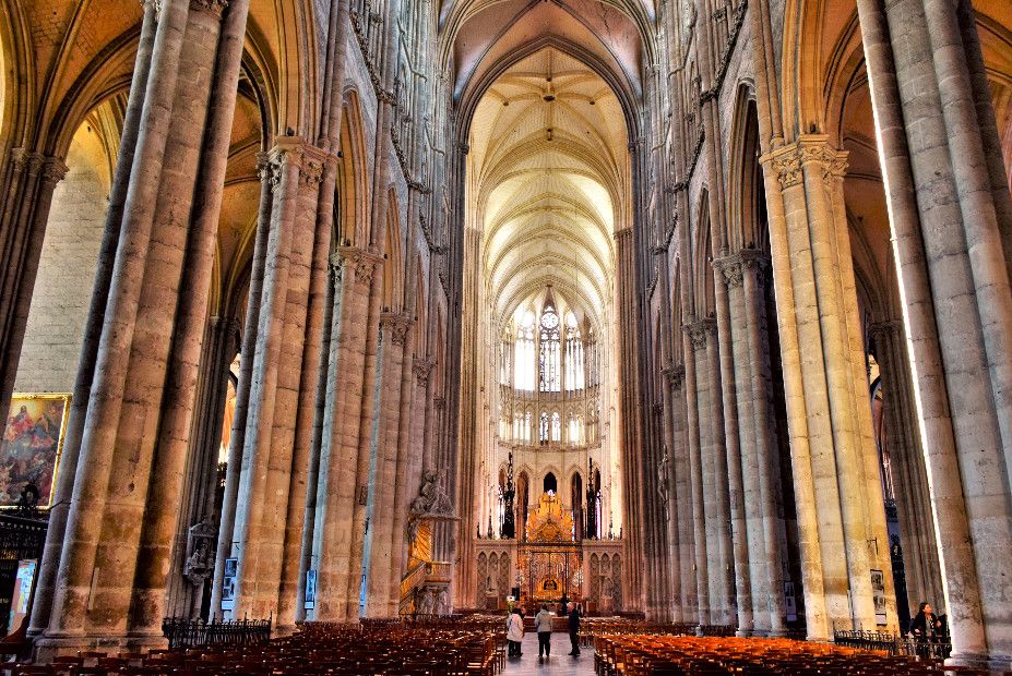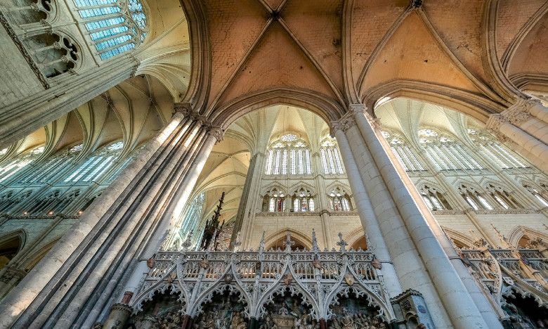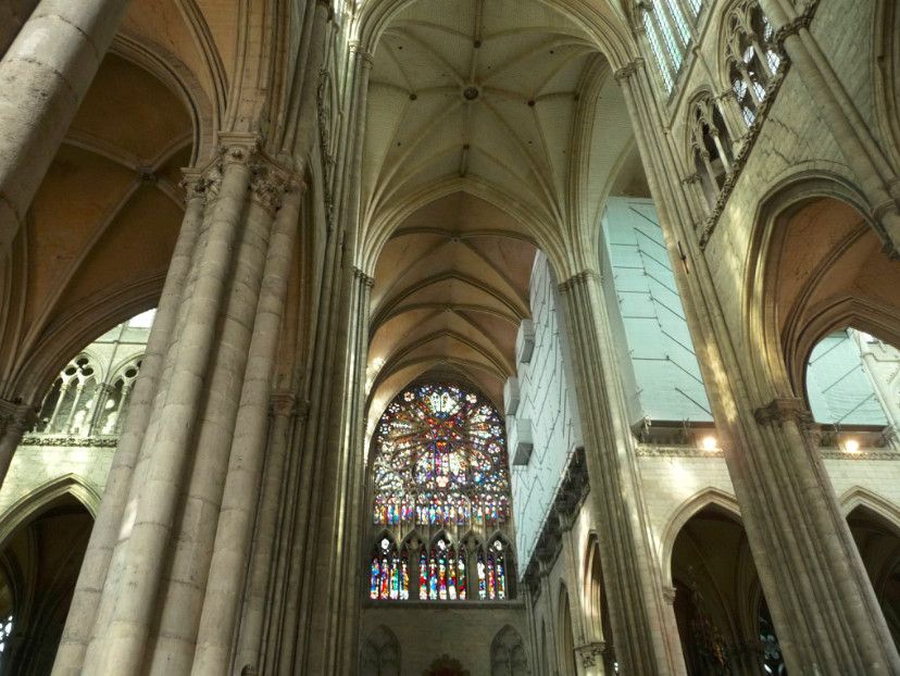 Внутреннее пространство собора поражает своими огромными размерами и великолепием. Несмотря на то, что интерьер Амьенского собора - самый большой среди готических соборов Франции, он не подавляет своими размерами, а, наоборот, кажется лёгким и на удивление гармоничным. Звёздчатый нервюрный свод собора поддерживают 126 колонн, огромные витражные окна наполняют светом буквально каждый уголок внутреннего пространства, а за счёт плавного "перетекания" трёхнефной входной части в трёхнефный трансепт и далее - в пятинефный хор, всё пространство собора воспринимается как единое целое.