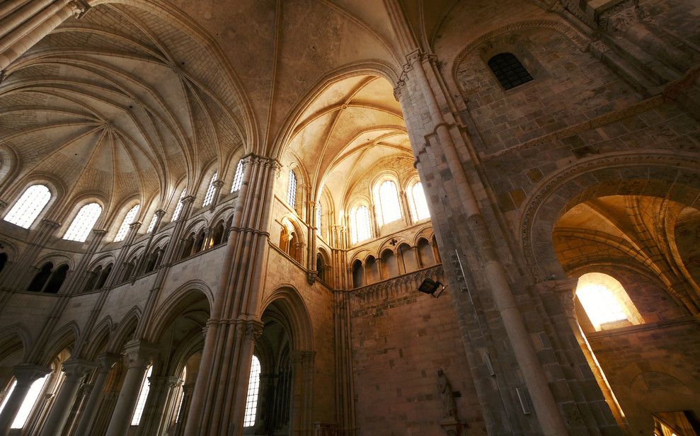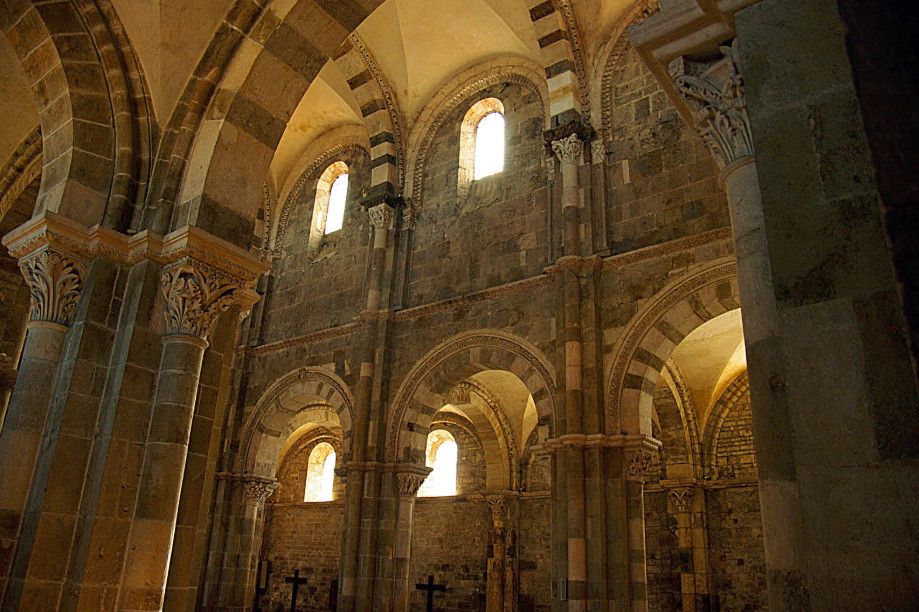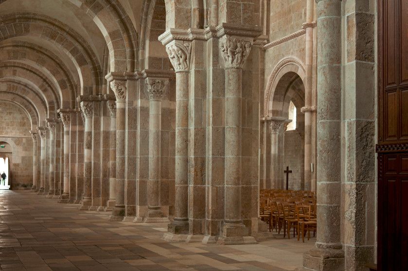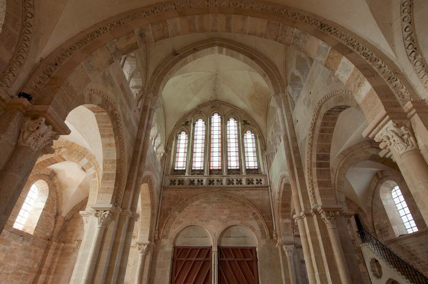 Чтобы иметь возможность разместить всех паломников, прибывающих в аббатство, в 1096 году было начато строительство церкви в романском стиле. Деньги на строительство собирали с крестьян, "приписанных" к монастырю. Непосильные поборы стали причиной вспыхнувших в 1106 году крестьянских волнений, в ходе которых был убит настоятель монастыря. Тем не менее, работы по возведению церкви не прекращались. Во время строительства храм несколько раз горел, но всё время восстанавливался. Наконец, в 1132 году папа Иннокентий II освятил просторный нартекс (притвор) храма, в 1135 году было завершено возведение нефа церкви.