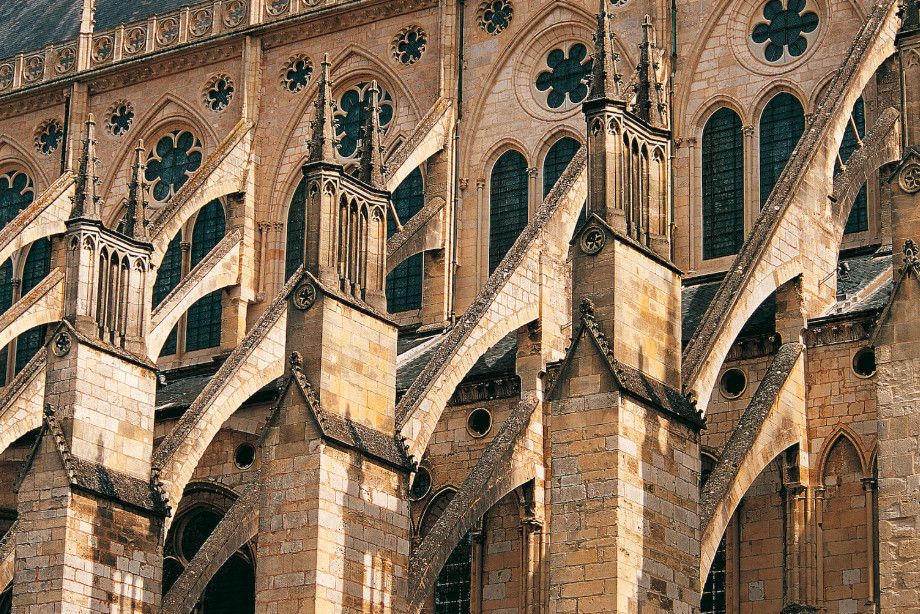 Как это часто бывает, имена архитекторов, скульпторов и резчиков, возводивших собор, для истории не сохранились, но об их таланте и величайшем мастерстве свидетельствует красивейшее здание Буржского собора. В плане храм представляет собой пятинефную базилику с небольшими капеллами, окружающими хор. Собор впечатляет не только своими размерами (его длина составляет 120 метров, ширина - 41 метр (это самый широкий готический собор во Франции), высота самой высокой башни - 65 метров), но и на удивление гармоничными пропорциями. Архитектурными "изюминками" Буржского собора являются отсутствие трансепта, пять (вместо традиционных трёх) порталов, двойные "летящие" контрфорсы и инновационное для того времени архитектурное решение - использование аркбутанов (наружных каменных полуарок), с помощью которых были значительно сокращены размеры внутренних опор и, как следствие, существенно увеличены внутренне пространство и оконные проёмы.