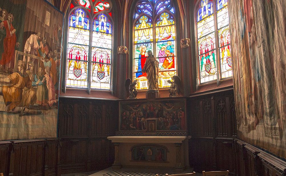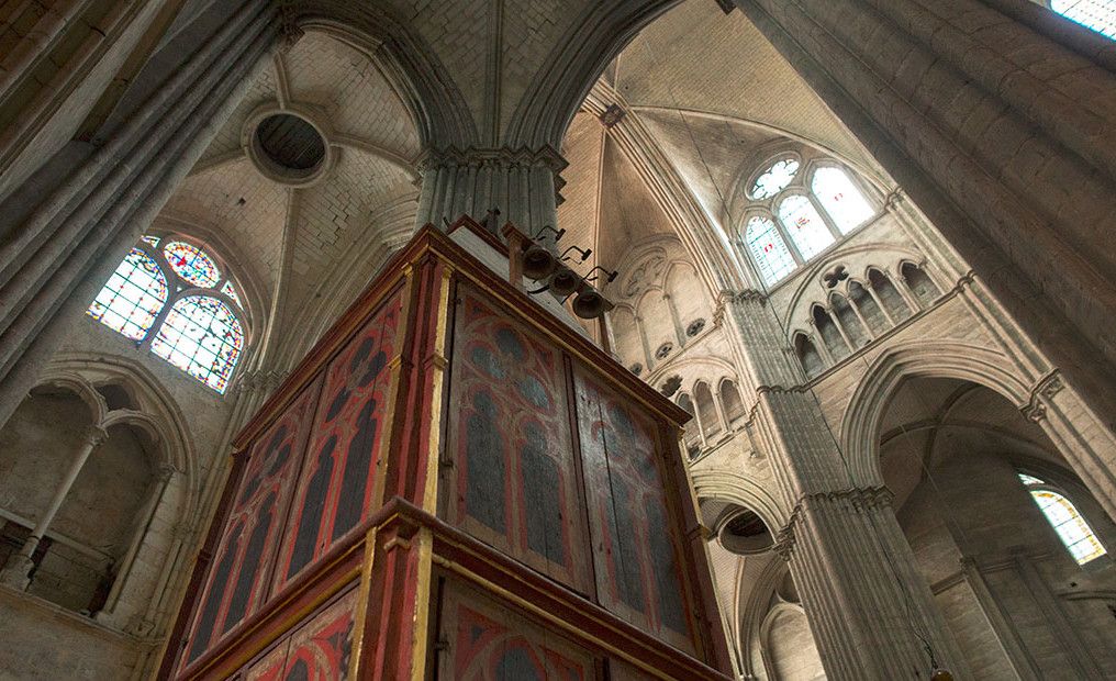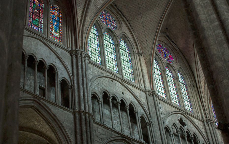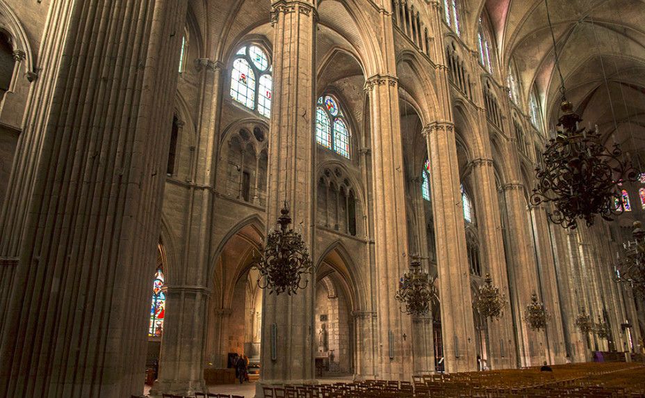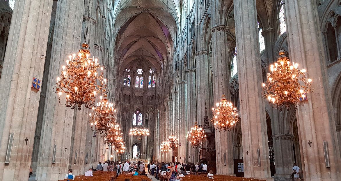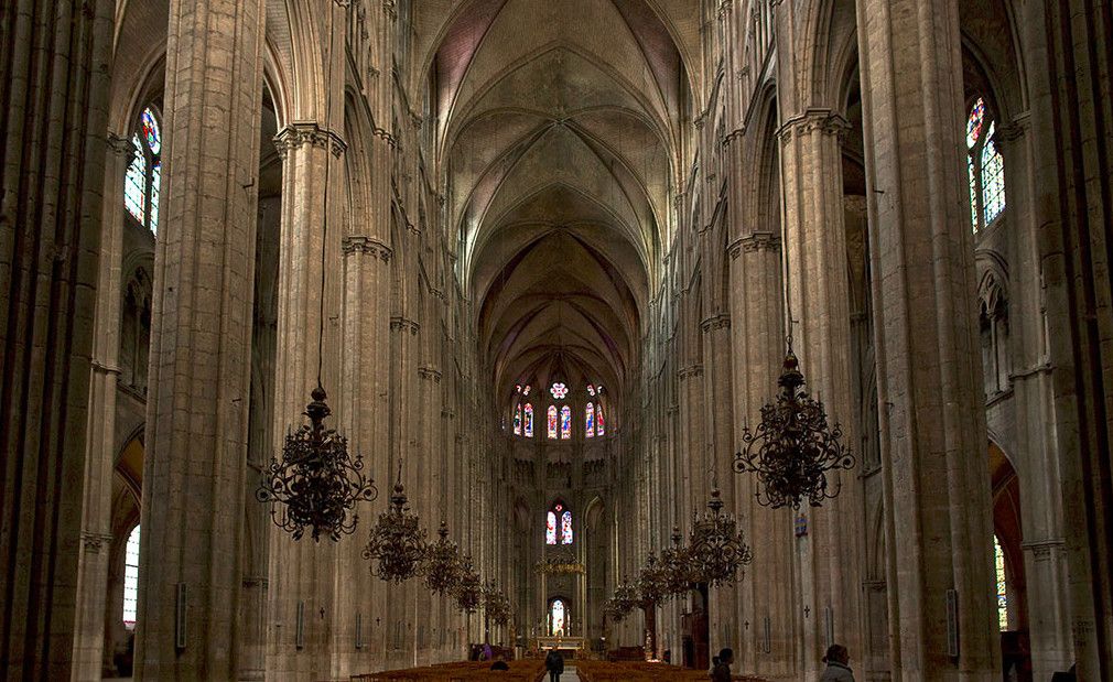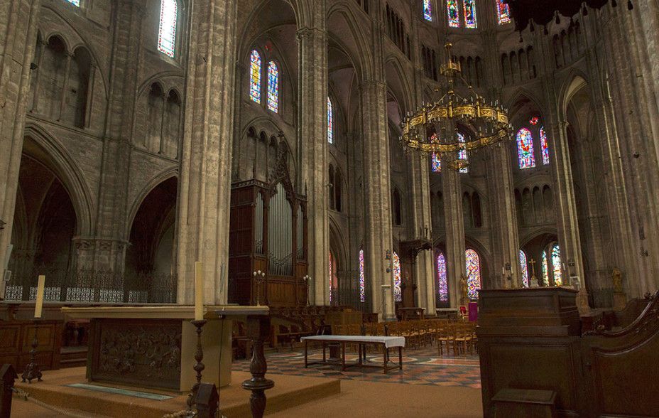 Интерьер собора был спланирован по принципу "единства внутреннего пространства" - высокие 37-метровые своды нефа, отсутствие внутренних осевых опор, большие оконные проёмы создают эффект единого огромного пространства, от которого буквально захватывает дух. Убранство внутренних помещений изобилует скульптурами, статуями, картинами, фресками и барельефами. Одно из сокровищ собора - старинные астрономические часы, изготовленные в 1424 году и прекрасно сохранившиеся до наших дней. Под деамбулаторием расположена крипта, построенная в 1200 году, в которой находится гробница герцога Жана Беррийского.