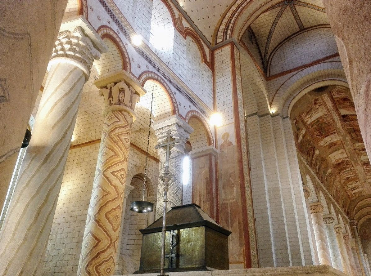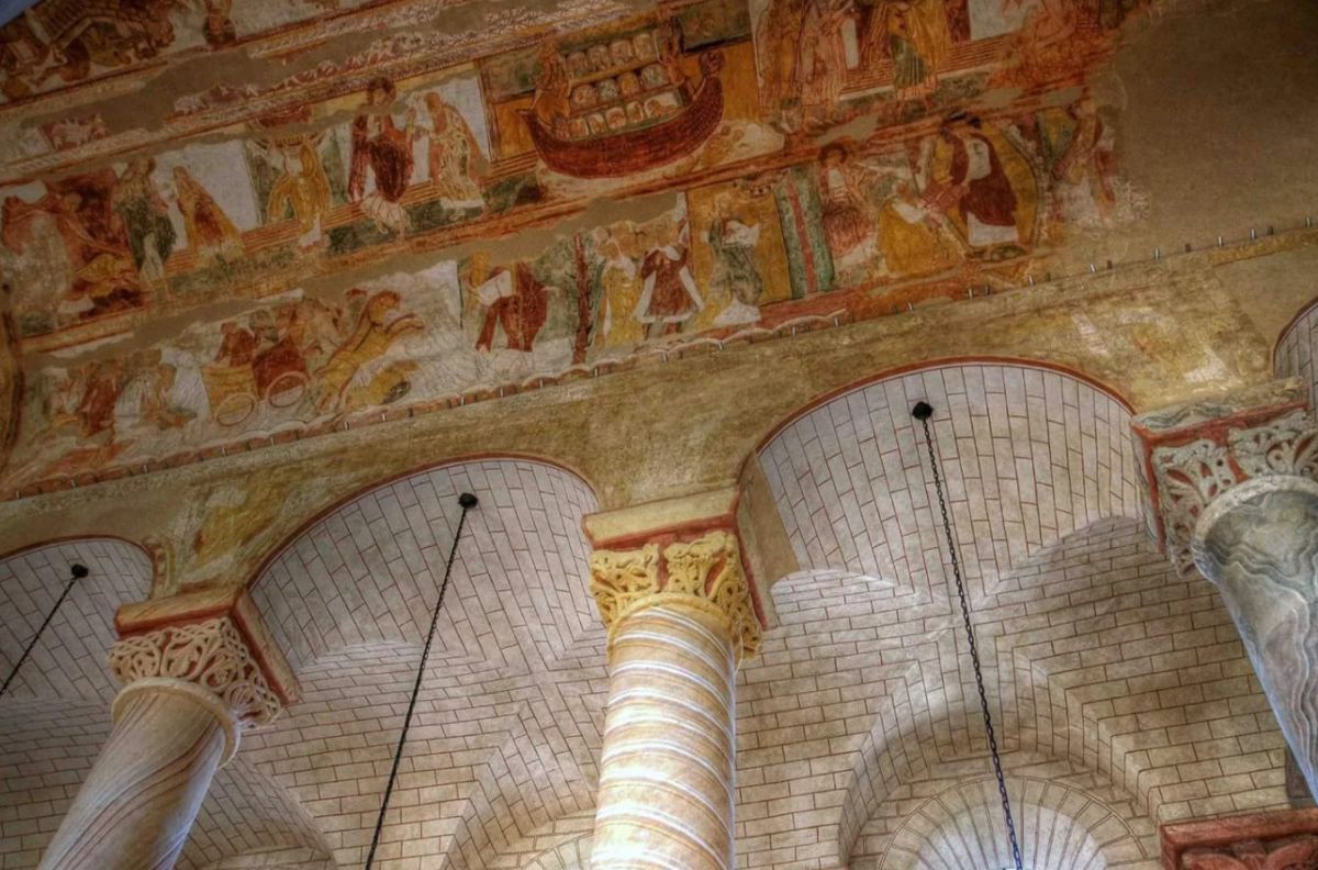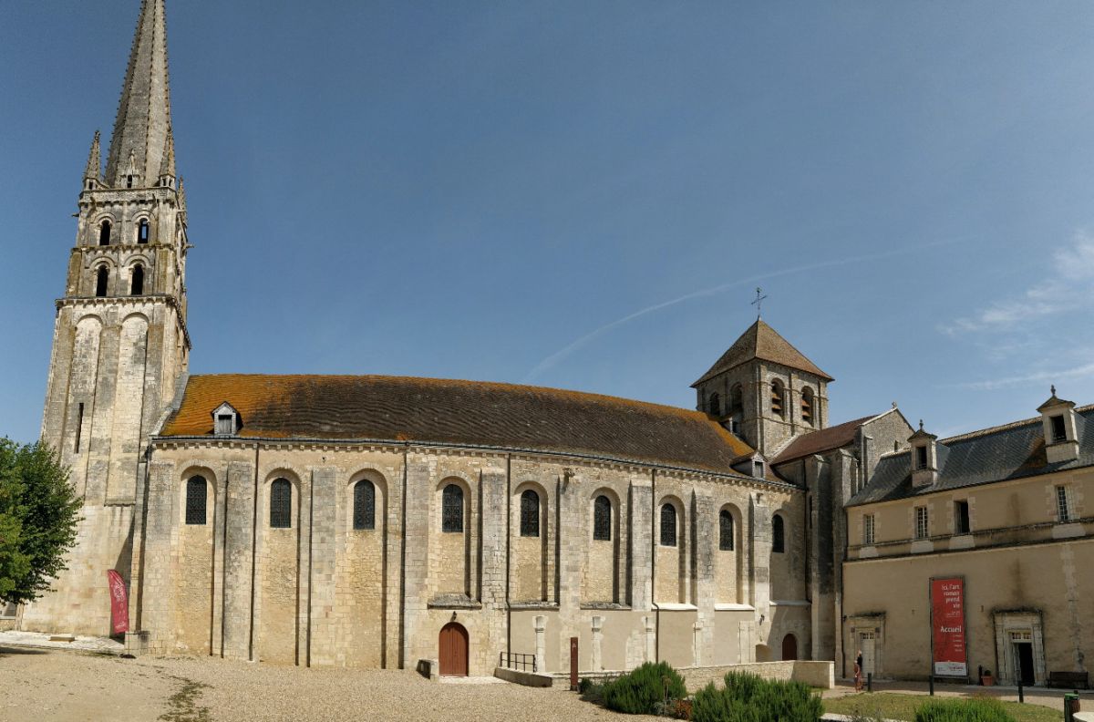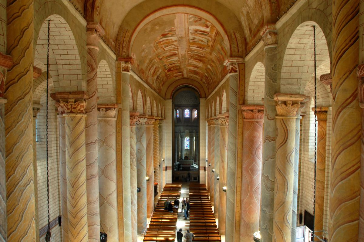 В 1010 году супруга Гильома V Великого, герцога Аквитании и графа Пуату, пожертвовала аббатству большую сумму денег, позволившую начать строительство новой церкви взамен старой, построенной ещё во времена Каролингов. Возведение церкви в романском стиле велось в 1040-1090 годах. Церковь впечатляет своими размерами, её длина - 76 метров, высота колокольни - 77 метров, а длина трансепта - 31 метр. Длина центрального нефа - 42 метра, ширина и высота - 17 метров, он отделён от боковых проходов рядами 15-метровых колонн с капителями. Боковые нефы с крестовыми сводами не уступают центральному нефу по ширине и высоте. Солнечный свет, проникающий внутрь церкви через боковые арочные окна и окна эркера, хорошо освещает главное сокровище храма - старинные фески, которыми полностью расписаны свод главного нефа (площадь росписей составляет 460 квадратных метров), стены нартекса (притвора) и крипты Святых Савена и Киприана. Эти фрески датируются XI-XII веками, на них изображены сюжеты из Апокалипсиса, Страстей Христовых и около пятидесяти эпизодов Ветхого Завета, взятых из Книг Бытия и Исхода, - 16 фресок цикла "Сотворение людей», целый цикл, посвящённый Всемирному потопу и Ною, а также сюжеты на темы "История Вавилонской башни", "История о Каине и Авеле", "История Авраама", "История Иосифа", "История Иакова", "История Моисея". Имена живописцев, создавших эти художественные шедевры, остались неизвестными. Скорее всего, это были мастера местной живописной школы, использовавшие при написании фресок совсем небольшой набор красок - жёлтую и красную охру, зелёный и голубой пигменты (последний встречается очень редко, так как в то время был очень дорогим). Для создания многоцветной палитры и оттенков художники смешивали основные цвета с чёрной и белой красками. А в результате - произведение искусства, признанное "шедевром человеческого творческого гения".