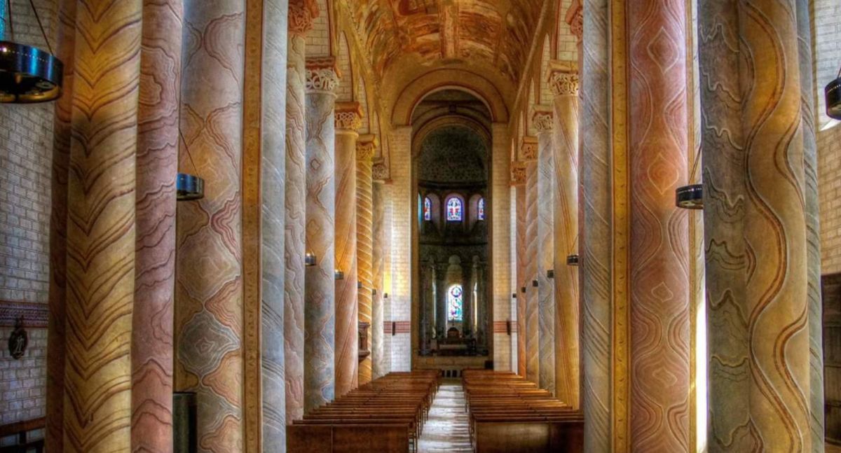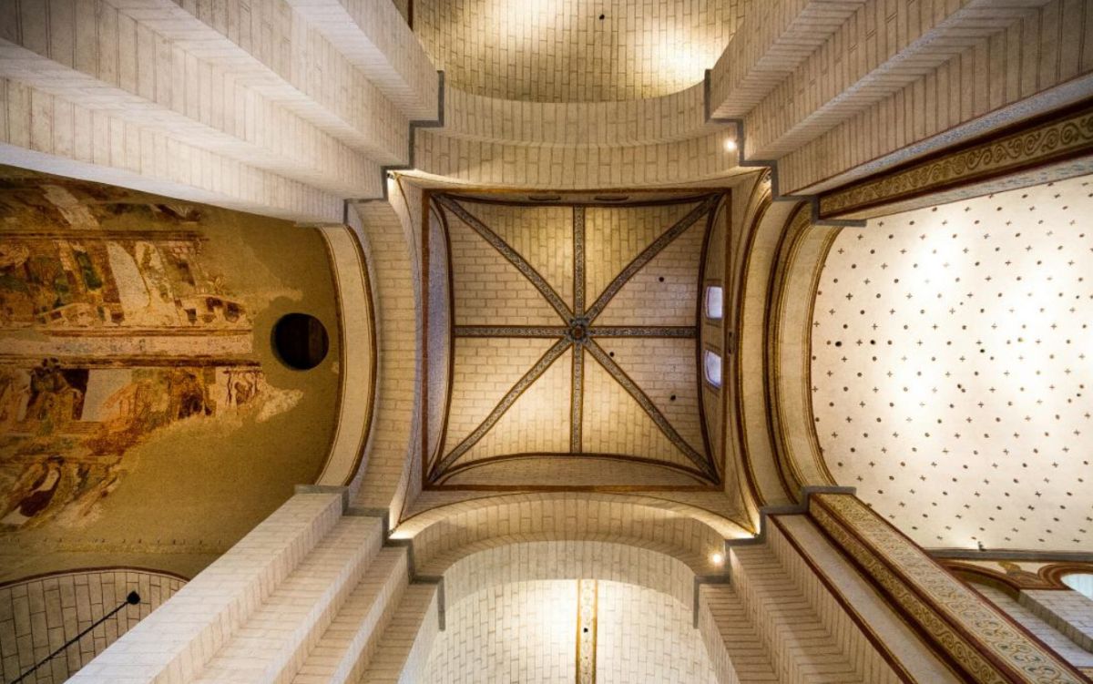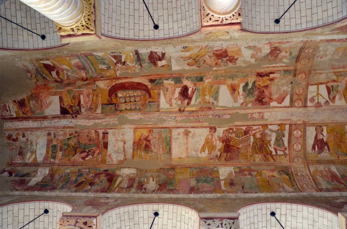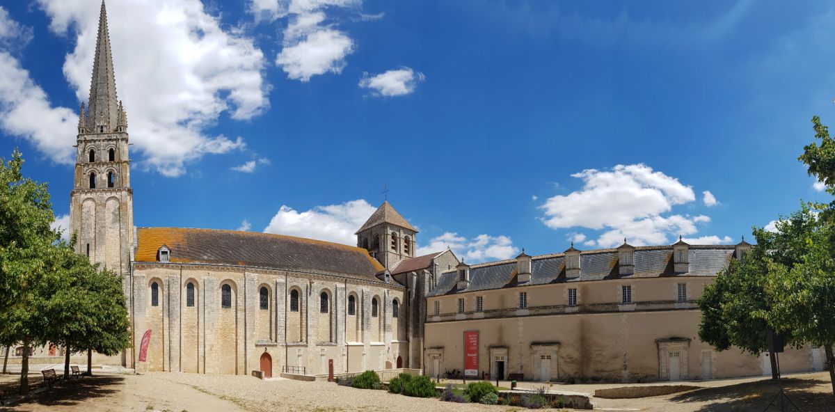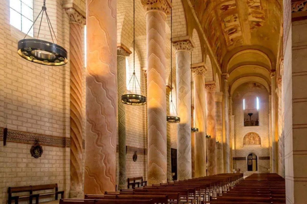 В 1010 году супруга Гильома V Великого, герцога Аквитании и графа Пуату, пожертвовала аббатству большую сумму денег, позволившую начать строительство новой церкви взамен старой, построенной ещё во времена Каролингов. Возведение церкви в романском стиле велось в 1040-1090 годах. Церковь впечатляет своими размерами, её длина - 76 метров, высота колокольни - 77 метров, а длина трансепта - 31 метр. Длина центрального нефа - 42 метра, ширина и высота - 17 метров, он отделён от боковых проходов рядами 15-метровых колонн с капителями. Боковые нефы с крестовыми сводами не уступают центральному нефу по ширине и высоте. Солнечный свет, проникающий внутрь церкви через боковые арочные окна и окна эркера, хорошо освещает главное сокровище храма - старинные фески, которыми полностью расписаны свод главного нефа (площадь росписей составляет 460 квадратных метров), стены нартекса (притвора) и крипты Святых Савена и Киприана. Эти фрески датируются XI-XII веками, на них изображены сюжеты из Апокалипсиса, Страстей Христовых и около пятидесяти эпизодов Ветхого Завета, взятых из Книг Бытия и Исхода, - 16 фресок цикла "Сотворение людей», целый цикл, посвящённый Всемирному потопу и Ною, а также сюжеты на темы "История Вавилонской башни", "История о Каине и Авеле", "История Авраама", "История Иосифа", "История Иакова", "История Моисея". Имена живописцев, создавших эти художественные шедевры, остались неизвестными. Скорее всего, это были мастера местной живописной школы, использовавшие при написании фресок совсем небольшой набор красок - жёлтую и красную охру, зелёный и голубой пигменты (последний встречается очень редко, так как в то время был очень дорогим). Для создания многоцветной палитры и оттенков художники смешивали основные цвета с чёрной и белой красками. А в результате - произведение искусства, признанное "шедевром человеческого творческого гения".