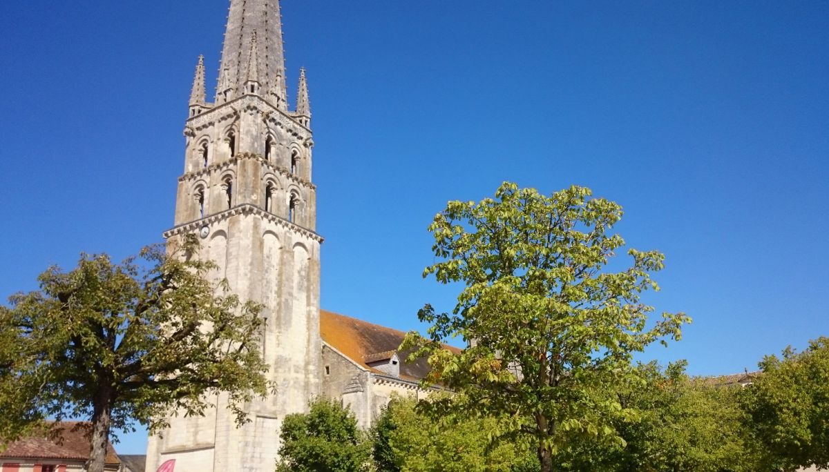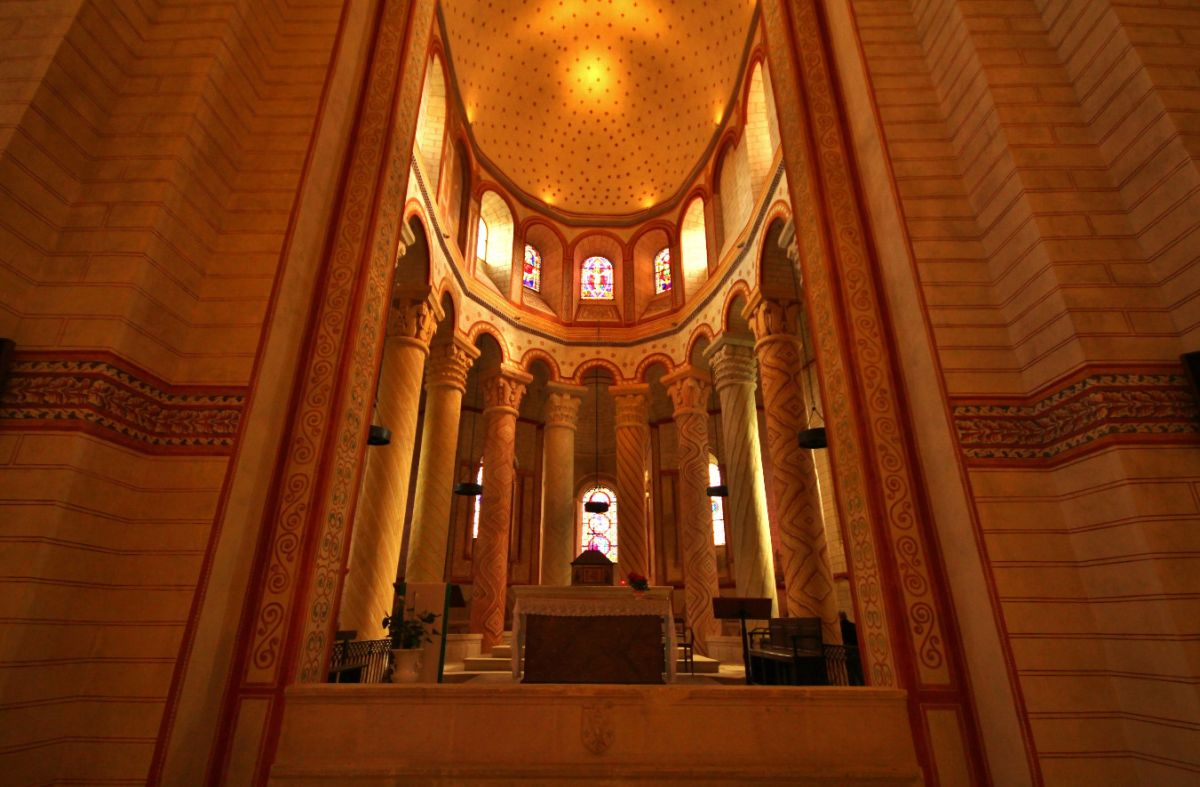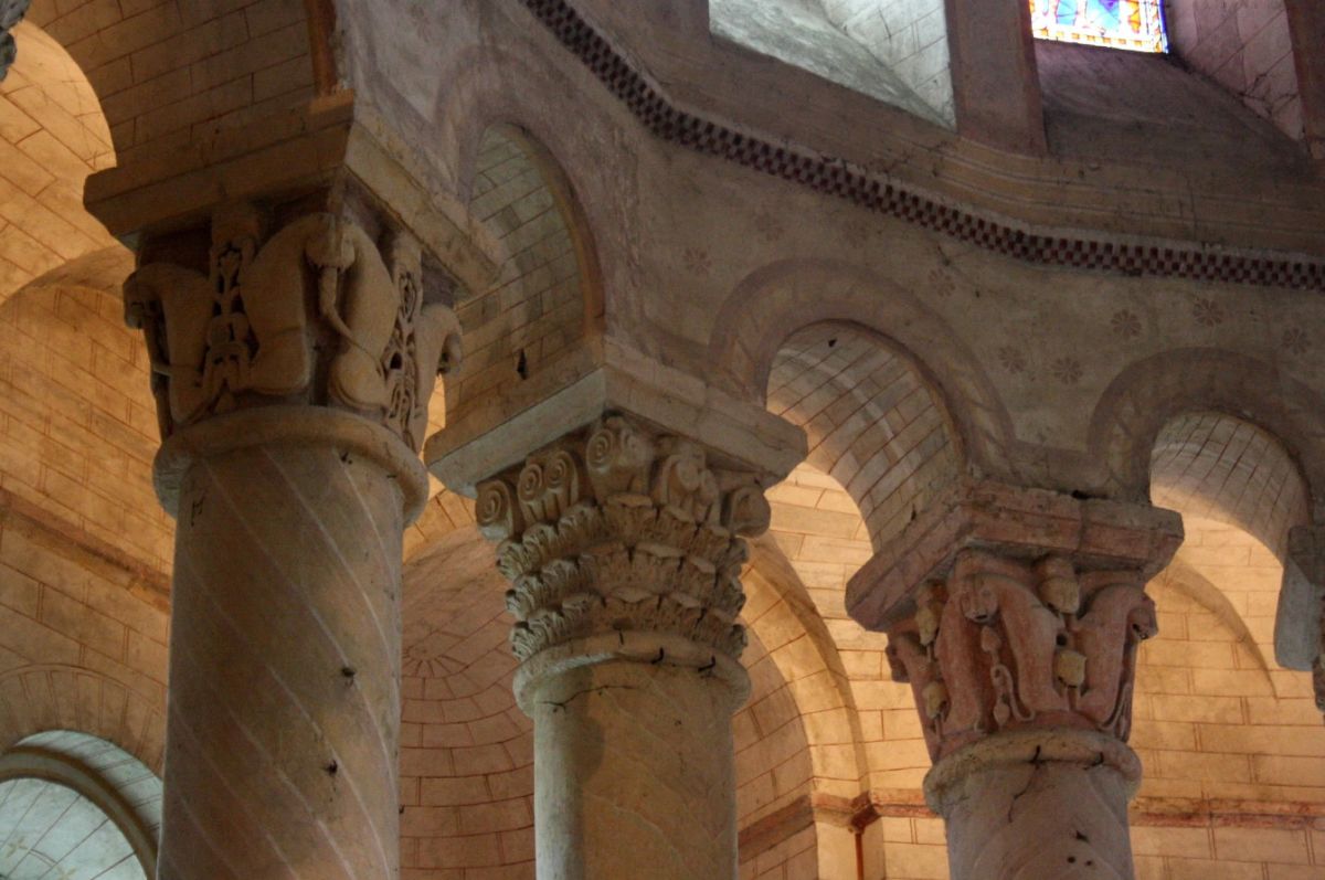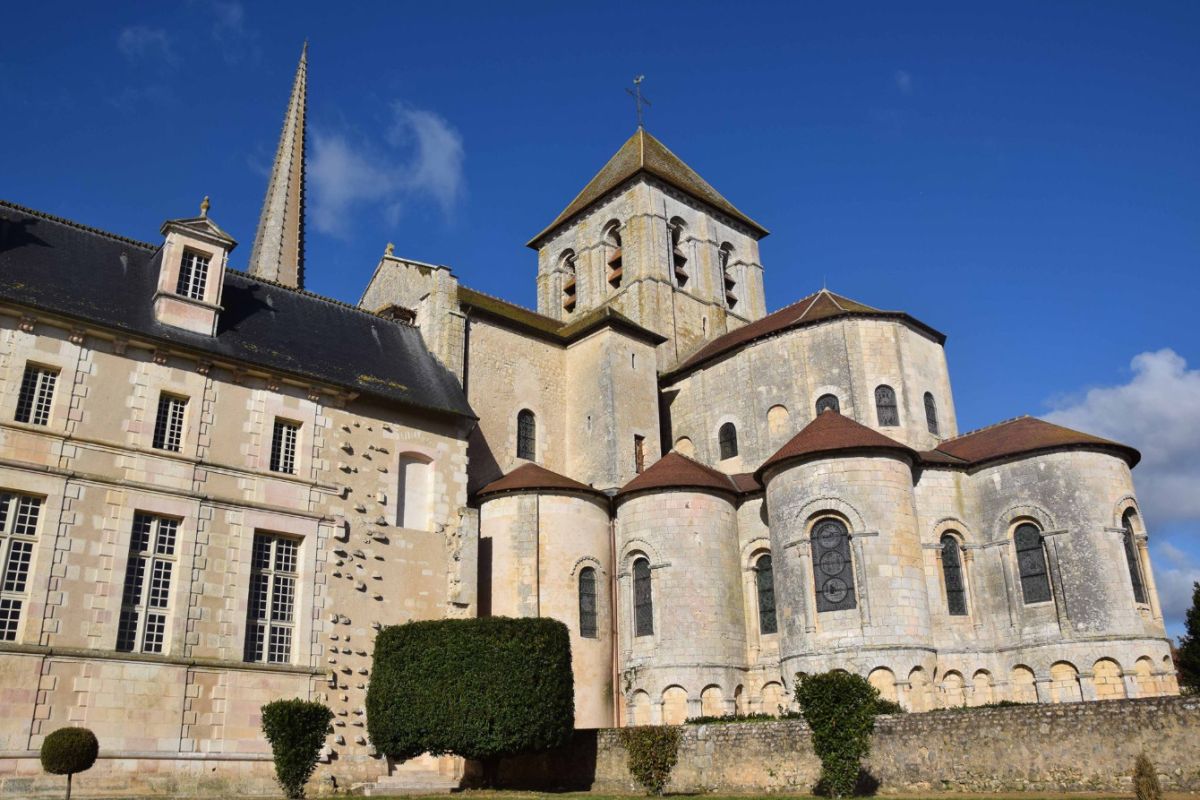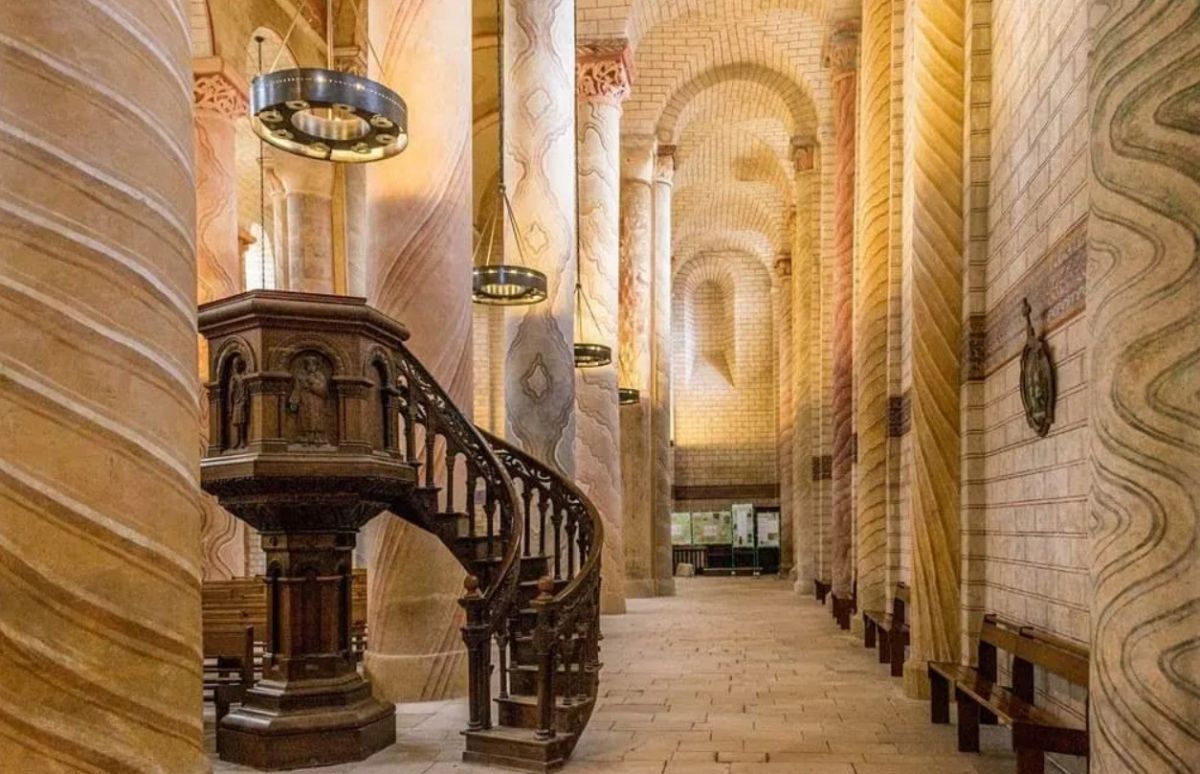 В 1010 году супруга Гильома V Великого, герцога Аквитании и графа Пуату, пожертвовала аббатству большую сумму денег, позволившую начать строительство новой церкви взамен старой, построенной ещё во времена Каролингов. Возведение церкви в романском стиле велось в 1040-1090 годах. Церковь впечатляет своими размерами, её длина - 76 метров, высота колокольни - 77 метров, а длина трансепта - 31 метр. Длина центрального нефа - 42 метра, ширина и высота - 17 метров, он отделён от боковых проходов рядами 15-метровых колонн с капителями. Боковые нефы с крестовыми сводами не уступают центральному нефу по ширине и высоте. Солнечный свет, проникающий внутрь церкви через боковые арочные окна и окна эркера, хорошо освещает главное сокровище храма - старинные фески, которыми полностью расписаны свод главного нефа (площадь росписей составляет 460 квадратных метров), стены нартекса (притвора) и крипты Святых Савена и Киприана. Эти фрески датируются XI-XII веками, на них изображены сюжеты из Апокалипсиса, Страстей Христовых и около пятидесяти эпизодов Ветхого Завета, взятых из Книг Бытия и Исхода, - 16 фресок цикла "Сотворение людей», целый цикл, посвящённый Всемирному потопу и Ною, а также сюжеты на темы "История Вавилонской башни", "История о Каине и Авеле", "История Авраама", "История Иосифа", "История Иакова", "История Моисея". Имена живописцев, создавших эти художественные шедевры, остались неизвестными. Скорее всего, это были мастера местной живописной школы, использовавшие при написании фресок совсем небольшой набор красок - жёлтую и красную охру, зелёный и голубой пигменты (последний встречается очень редко, так как в то время был очень дорогим). Для создания многоцветной палитры и оттенков художники смешивали основные цвета с чёрной и белой красками. А в результате - произведение искусства, признанное "шедевром человеческого творческого гения".