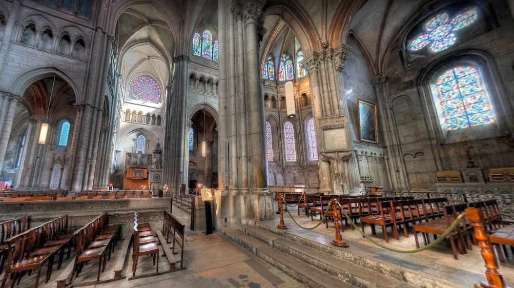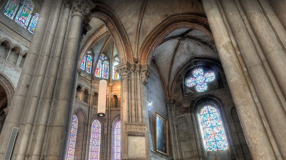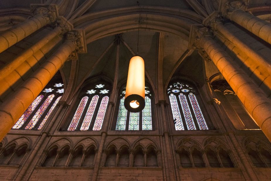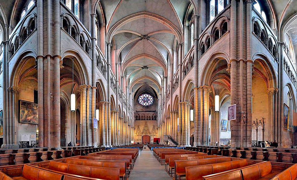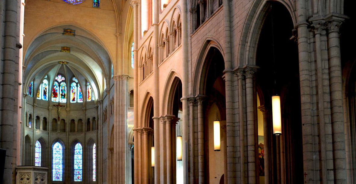 Интерьер храма также выполнен в смешении романского и готического стилей. Здесь есть и огромные витражные окна-розы, и узкие "ланцетовидные" окна с романскими витражами, и аркады из полукруглых и стрельчатых арок, и "висячие" галереи, и великолепный нервюрный свод.
