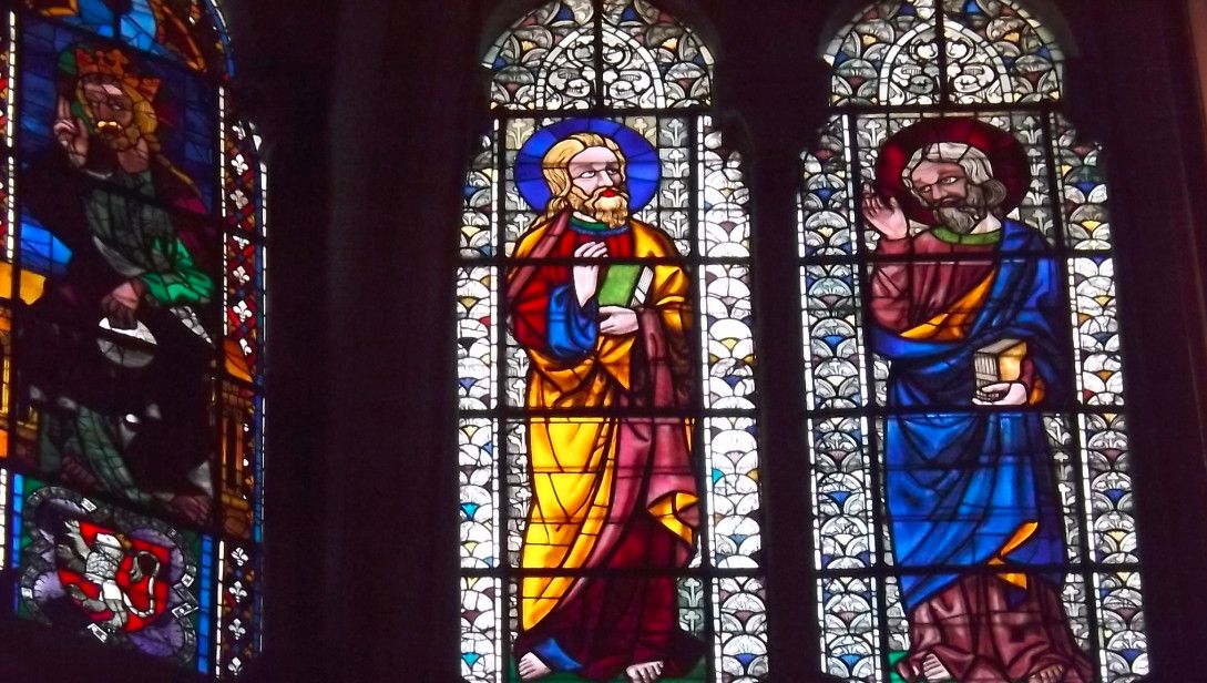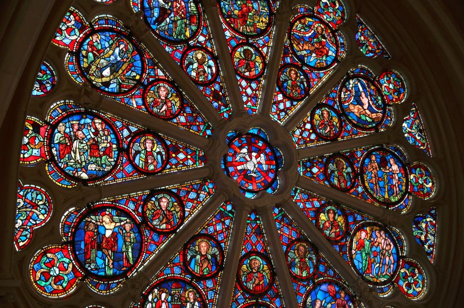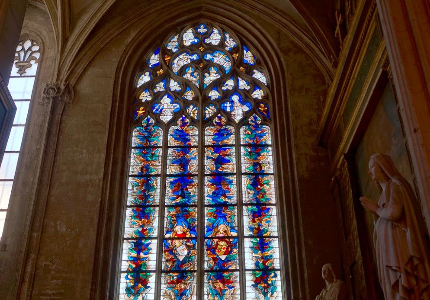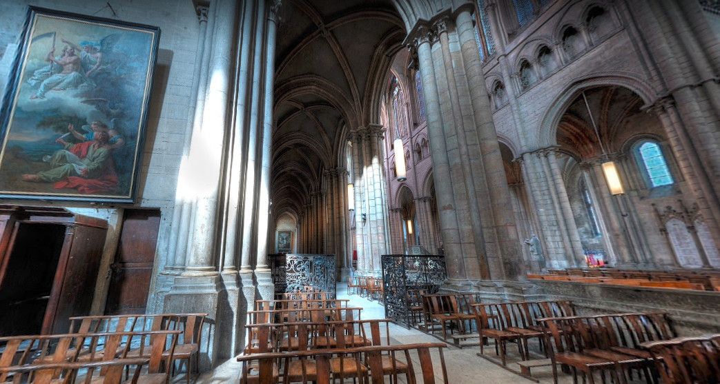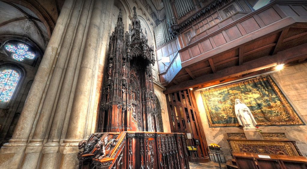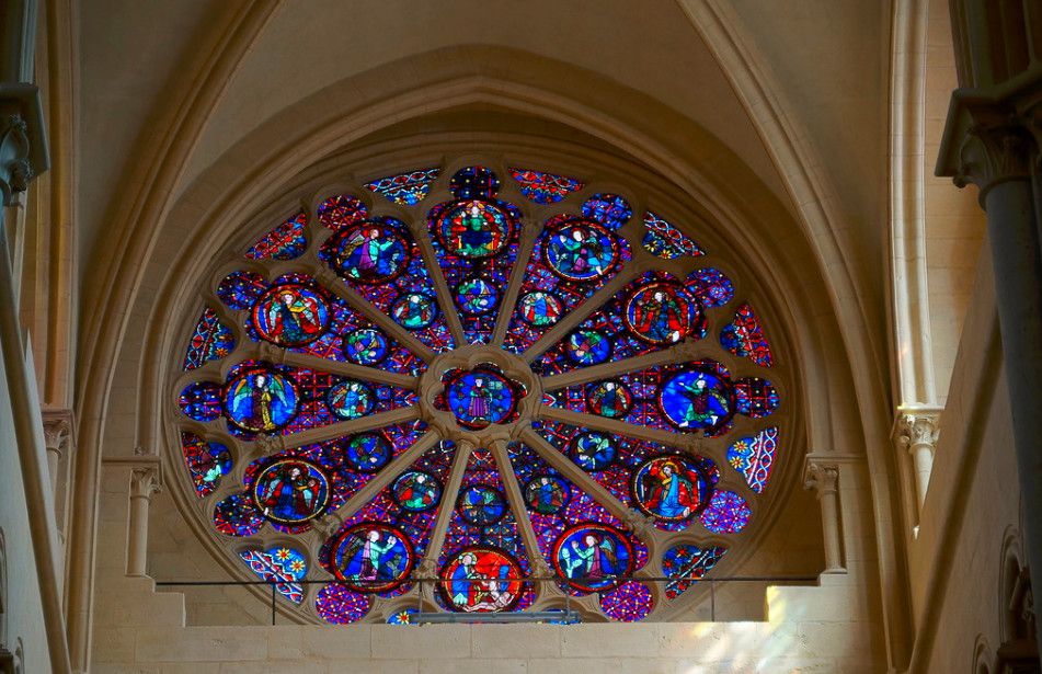 Интерьер храма также выполнен в смешении романского и готического стилей. Здесь есть и огромные витражные окна-розы, и узкие "ланцетовидные" окна с романскими витражами, и аркады из полукруглых и стрельчатых арок, и "висячие" галереи, и великолепный нервюрный свод.