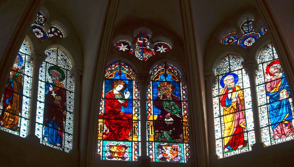 Восточная часть, выполненная в романском стиле, имеет аркаду из слепых полукруглых арок и два ряда ланцетных окон, украшенных витражами.