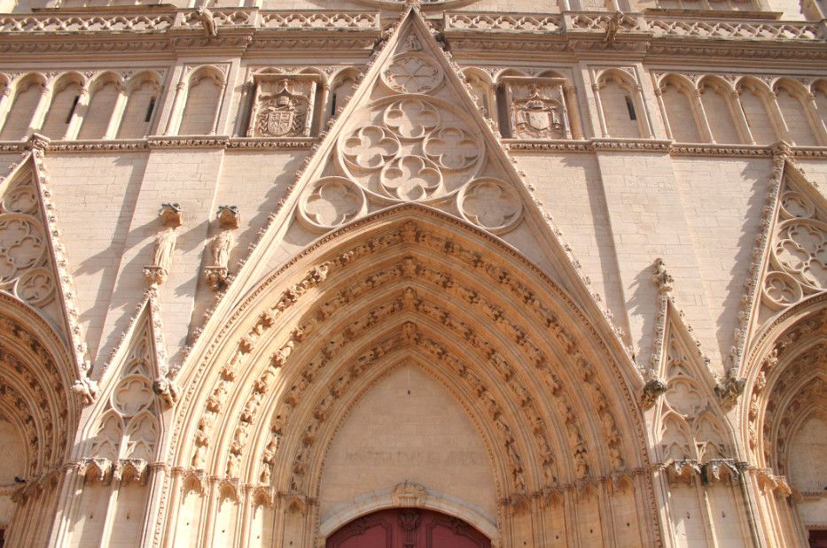Собор имеет четыре башни без шпилей. Западный фасад украшают арочная галерея и три стрельчатых готических портала с резными тимпанами. На столбах, обрамляющих эти порталы, размещены барельефы-медальоны с изображением библейских сцен (в общей сложности 320 барельефов). В центре, над галереей, расположено большое окно-роза диаметром 8 метров, над ним, между двумя башнями, - высокий треугольный фронтон.