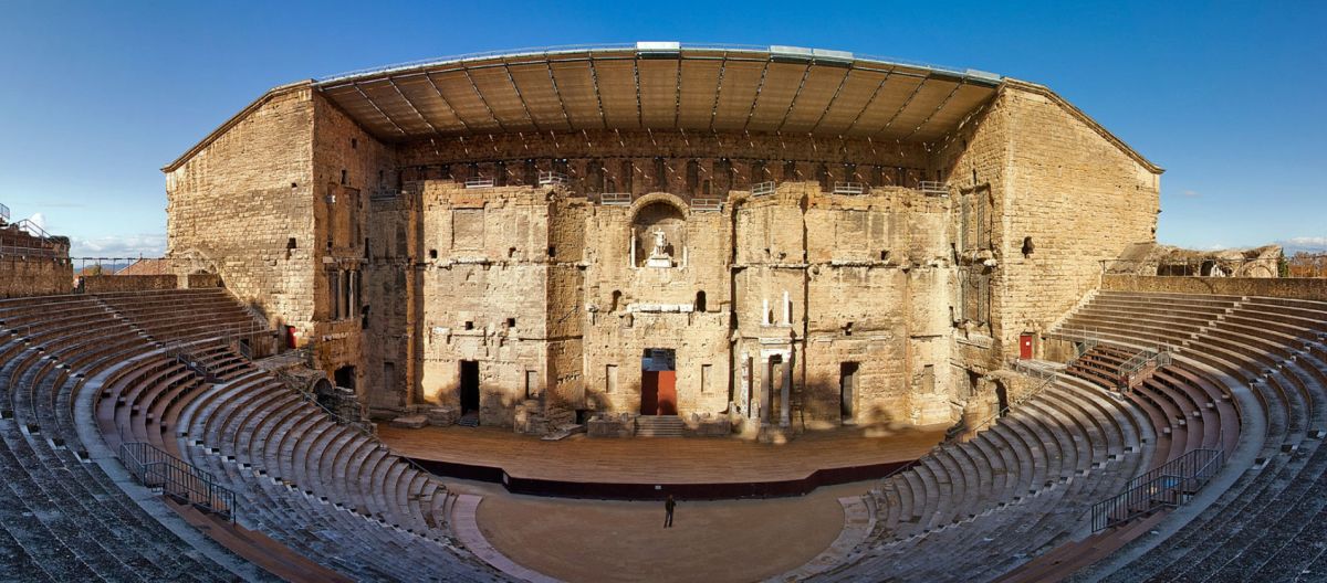 Когда-то город Оранж назывался Араузионом. Город был основан в 36 году до нашей эры ветеранами Второго галльского легиона в римской провинции Нарбонская Галлия, на земле, подаренной своим верным воинам императором Октавианом Августом. Город стал быстро развиваться, и уже спустя всего несколько десятилетий численность его населения достигла 110 000 жителей. Для того, чтобы отвлечь от политических и экономических проблем горожан, значительную часть которых составляли недовольные властью римлян галлы, в Араузионе, как и во многих крупных римских городах, был построен театр. Он стал одним из самых больших и красивых театров на всей территории Римской империи. Недаром намного позже, когда Оранж, уже входил в состав Франции, посетивший его Людовик XIV так отозвался о внушительном фасаде театра: "Это самая красивая стена моего королевства". Фасад Античного театра представляет собой стену длиной 103 метра, толщиной 1,8 метра и высотой 37 метров. Фасад состоит из трёх уровней. На первом уровне, между аркадами, располагались три входа, ведущих на сцену. Второй уровень был декоративным - его украшали растительный орнамент и мозаика. Третий уровень, оформленный аркатурным поясом, служил опорой для навесной деревянной крыши, которая защищала актёров и зрителей от дождя или жары.