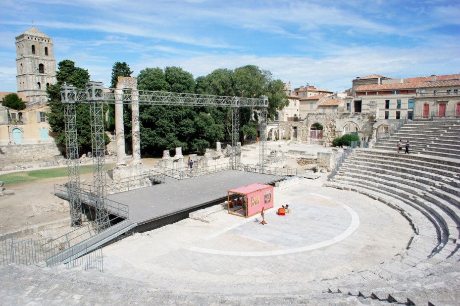 Сцена представляла собой деревянную платформу длиной 50 метров и глубиной 6 метров. Она была богато украшена сотней коринфских колонн и статуями, в числе которых трёхметровая статуя императора Августа (сейчас хранится в Музее Арля) и знаменитая Венера Арлезианская, обнаруженная на руинах театра в 1651 году, отреставрированная по указу Людовика XIV и выставленная сначала в Версале, а затем переданная на хранение в Лувр.
