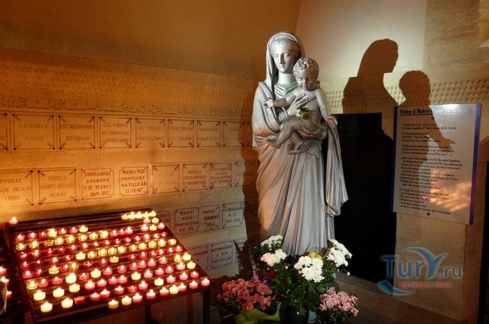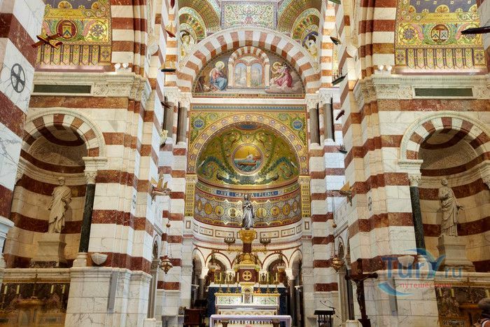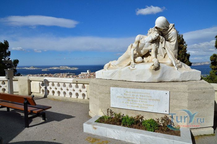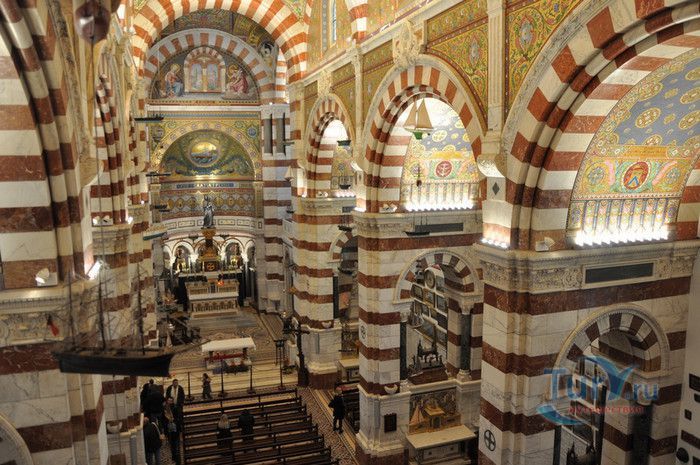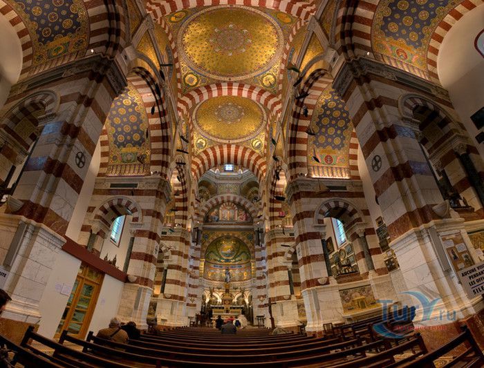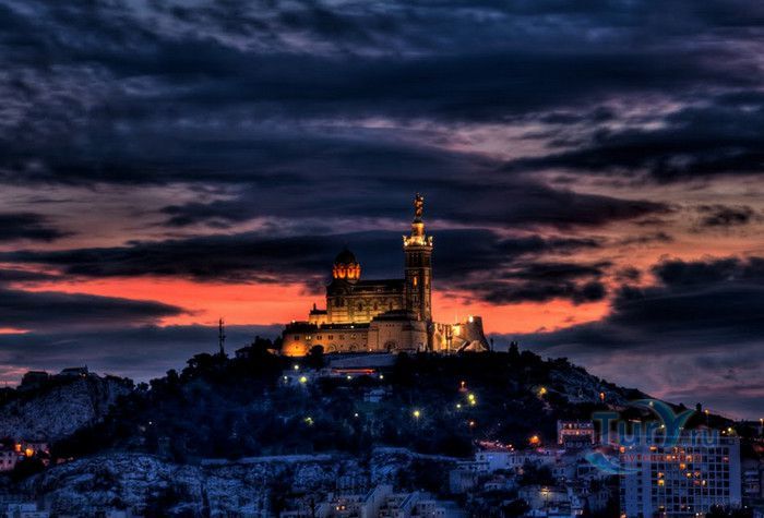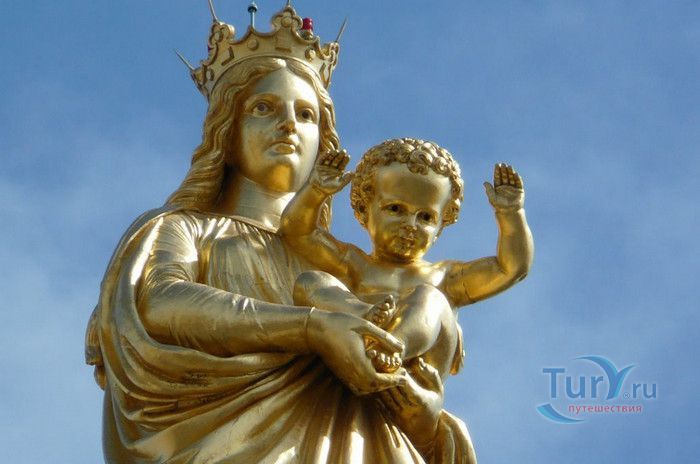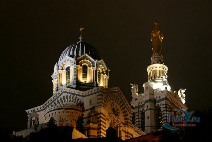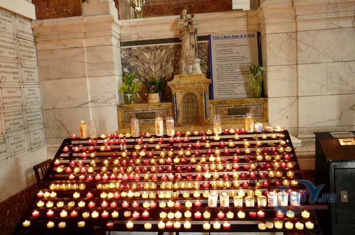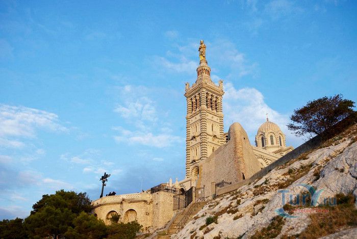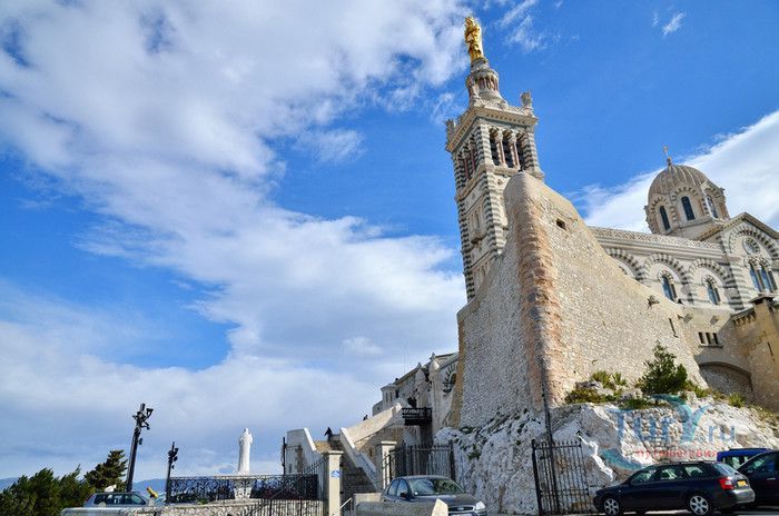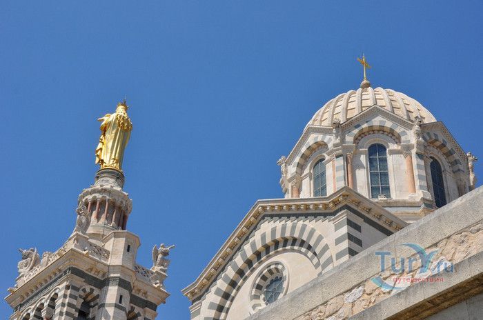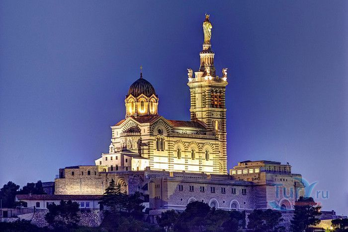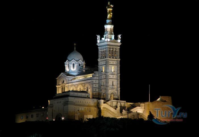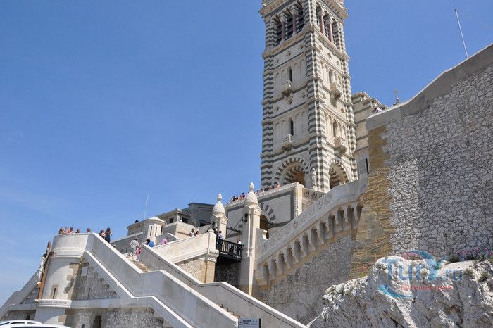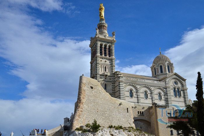 Жители Марселя называют Базилику Нотр-Дам де ла Гард хранительницей города. Базилика и позолоченная статуя Девы Марии, установленная на колокольне, видны из любой точки города. В 1214 году марсельский священник Пётр построил небольшую часовню Девы Марии. Часовня была возведена на вершине 161-метрового скалистого холма La Garde (охрана), с которого открывался вид на Марсель и море. В январе 1516 года Марсель посетил французский король Франциск I. В часовне Девы Марии монарх отслужил молебен в честь победы французской армии в битве при Мариньяно. Король по достоинству оценил местоположение храма и отличный обзор окрестностей с вершины холма, чем и воспользовался при строительстве в Марселе двух фортов для защиты города: один форт был построен на острове Иф, второй - на вершине холма, на котором стояла часовня. Оказавшись за стенами форта, церковь не прекратила деятельности, её посещали не только солдаты гарнизона, но и жители Марселя. Чтобы дать возможность горожанам попасть в храм, по распоряжению Франциска I был построен подъёмный мост, по которому каждое утро люди шли на церковную службу. Ни один моряк не уходил в море, не помолившись у статуи Девы Марии. Во время Французской революции в форте в течение шести месяцев находились под стражей члены семьи Бурбонов. Католическое вероисповедание во Франции было запрещено. Как и многие другие храмы Франции, церковь Нотр-Дам де ла Гард была национализирована, а имущество просто разграблено - бесследно исчезли две статуи Богородицы, колокол, алтарь. Уцелело только большое распятие, которое и сейчас можно увидеть на входе в храм. После революции часовня снова была открыта. Комендант форта подарил небольшой колокол, а бывший морской пехотинец Эскарамань - статую Мадонны с букетом, купленную им на аукционе. К середине XIX века Марсель значительно вырос, часовня не могла вместить всех желающих. В 1851 году священники обратились в военное министерство с просьбой о сносе маленькой часовни и возведении на территории форта базилики с большой колокольней. Разрешение было получено в 1852 году. Строительство храма в римско-византийском стиле было начато 11 сентября 1853 года по проекту архитектора Анри-Жака Эсперандьё. Внешняя отделка храма выполнена с использованием белого калиссанского известняка и зеленого камня. На террасу, расположенную пред базиликой, ведёт широкая каменная лестница, а в само здание церкви - небольшой подъемный мост. 4 июня 1864 года недостроенная базилика была освящена кардиналом Виллекурт. Строительство колокольни было завершено в 1866 году, а изготовленная в Париже, в мастерской Кристофль, статуя Девы Марии была доставлена в Марсель поездом в 1869 году. Статую изготовили из меди, отливали из четырёх частей, а после их соединения фигура Девы Марии с Младенцем была покрыта сусальным золотом. В 1870 году 11-метровая статуя, весом 9796 кг, была установлена на колокольне Базилики Нотр-Дам де ла Гард. Интерьер храма отделан роскошными мозаиками и мрамором. При освобождении Марселя от фашистов командованием была поставлена задача выбить немцев из Базилики Нотр-Дам де ла Гард без применения авиации и артиллерии. Храм был освобождён 25 августа 1944 года благодаря мужеству французских солдат. После войны "Хранительница Марселя" снова верно служила жителям города. В 2000-2008 годах были проведены масштабные 