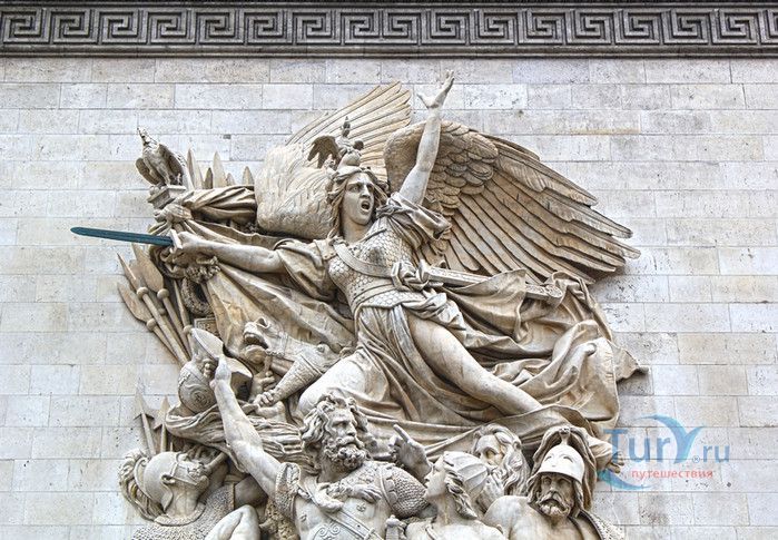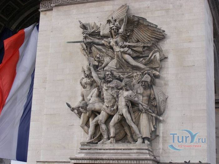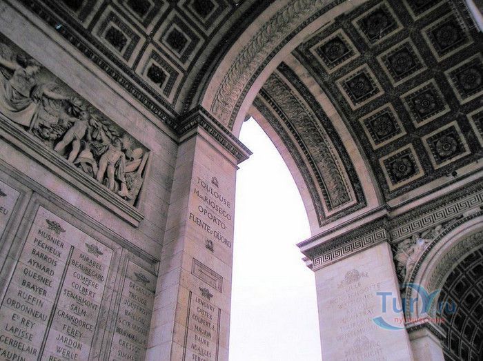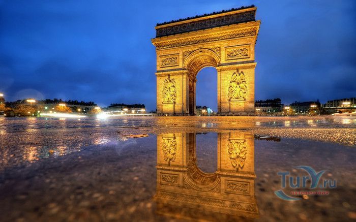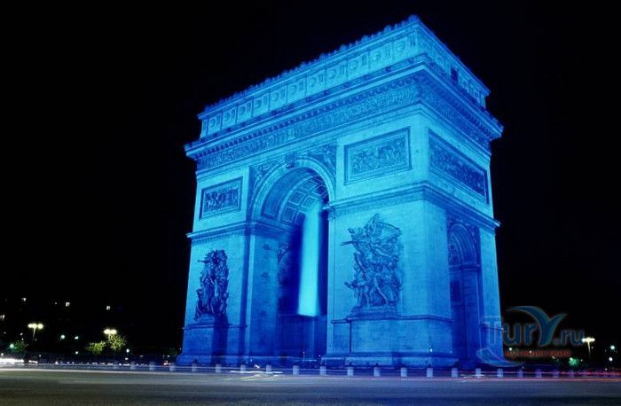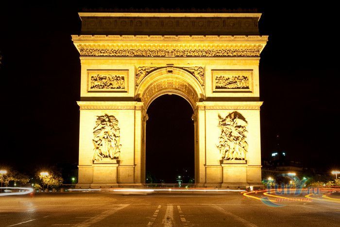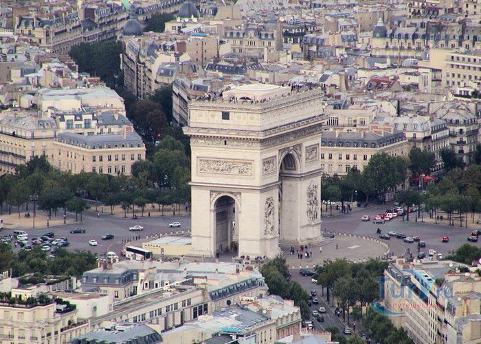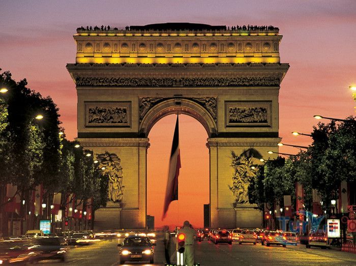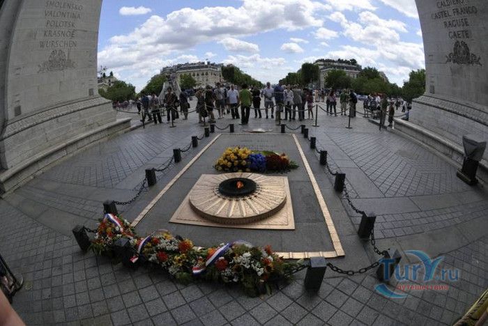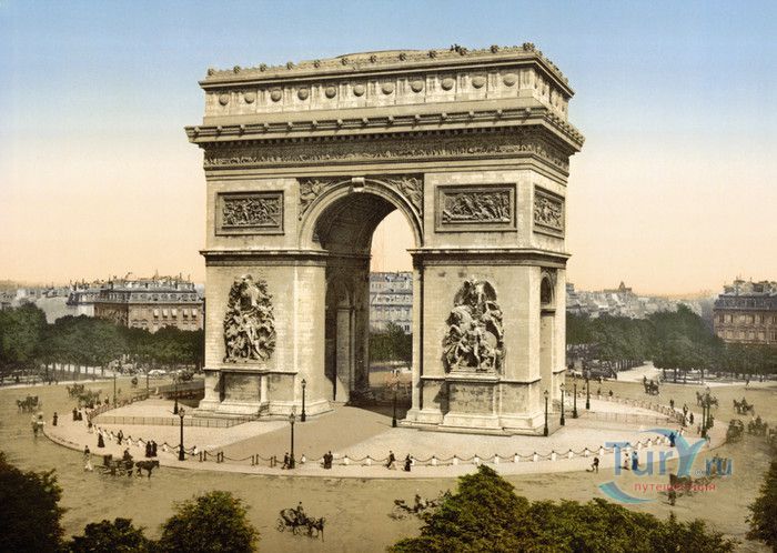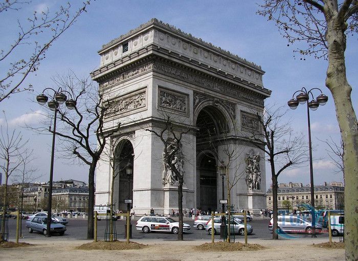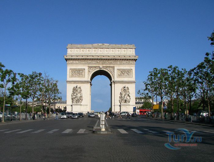Символ французской нации - Триумфальная Арка расположена в Париже, в VIII округе, на площади Шарля де Голля (её еще называют площадью Этуаль). Памятник, без которого современный Париж уже невозможно представить, воздвигнут в центре площади, дающей начало 12 проспектам, в том числе знаменитым Елисейским полям. В ознаменование победы французской армии в сражении под Аустерлицем, Наполеон Бонапарт решил воздвигнуть Триумфальную арку в Париже, на холме Шайо. Строительство монумента по проекту архитектора Жана Франсуа Шальгрена началось в 1806 году и продолжалось 30 лет. Наполеон так и не дожил до окончания строительства, оно завершилось лишь в 1836 году, в царствование Луи-Филиппа. Триумфальная Арка, выполненная в античном стиле, имеет внушительные размеры. Её высота 49,5 метров, длина 45 метров, высота свода - 29 метров. Арка украшена барельефами "Битва под Аустерлицем", "Марсельеза", "Битва при Абукире", "Сопротивление 1814 года", "Триумф 1810 года", "Бой при Арколе", "Похороны генерала Марсо", "Мир 1815 года", "Битва при Жемаппе", "Битва за Каноб". На стенах выгравированы названия 128 сражений, выигранных республиканской и императорской армиями Франции, и имена 558 французских военачальников. Вокруг Триумфальной арки установлено 100 гранитных тумб, соединённых чугунными цепями. Число тумб соответствует количеству дней короткого второго правления Наполеона Бонапарта. У подножия арки находится могила Неизвестного Солдата, у которой с 1923 года горит вечный огонь. Надпись на могиле гласит: "Здесь покоится французский солдат, отдавший жизнь за Родину, 1914.1918". Наверху Триумфальной Арки находится смотровая площадка, с которой открывается потрясающий вид на Париж, внутри - небольшой музей, посвящённый истории строительства Триумфальной Арки. Попасть к монументу можно исключительно по подземным переходам из-за интенсивного движения на площади, на ней нет ни светофоров, ни дорожных знаков.